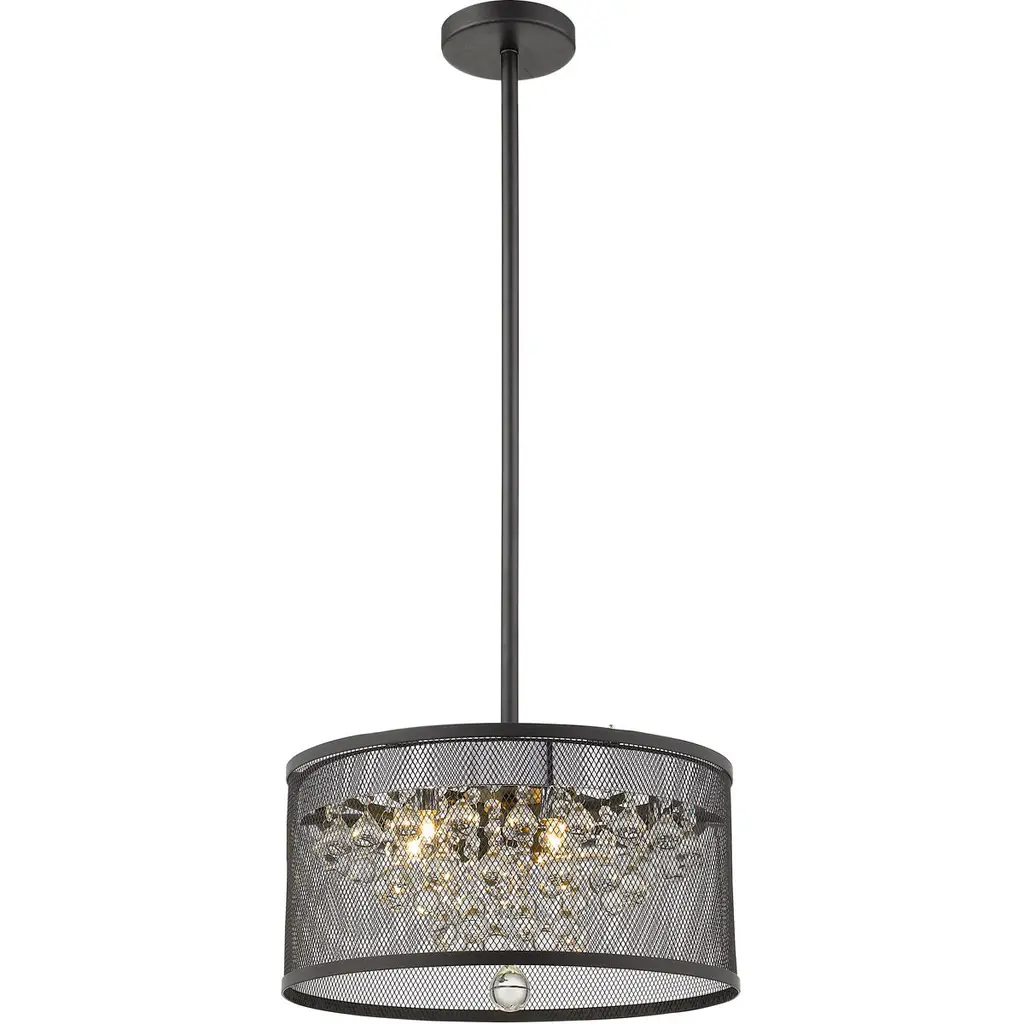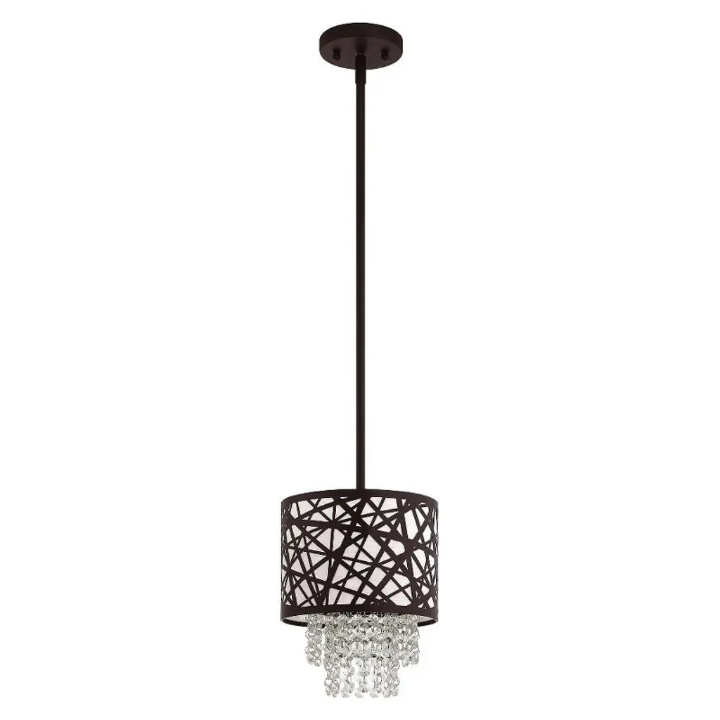 Collection: Allendale, Material: Steel, Finish Color: Bronze, Width: 8", Height: 12.25", Hanging Method: Stem, Lamping Type: Incandescent, Number Of Bulbs: 1, Wattage: 60 Watts, Moisture Rating: Dry Rated, Desc: This spectacular bronze mini pendant will take your home decor to the next level. Inspired by a bird nest, the laser-cut metal sheath surrounds an oatmeal fabric hardback shade with strands glistening of clear crystal.,