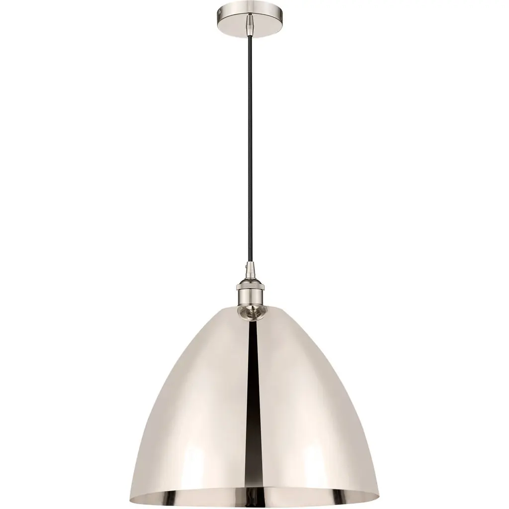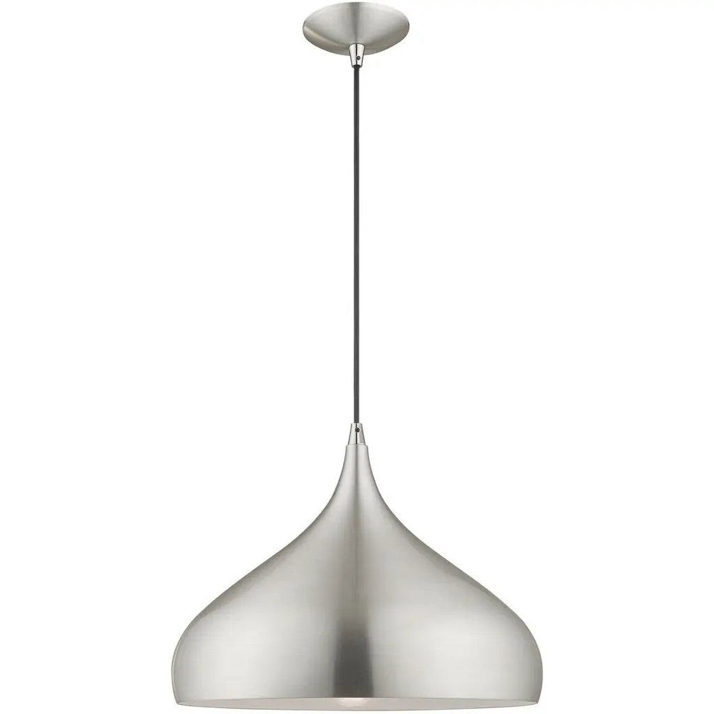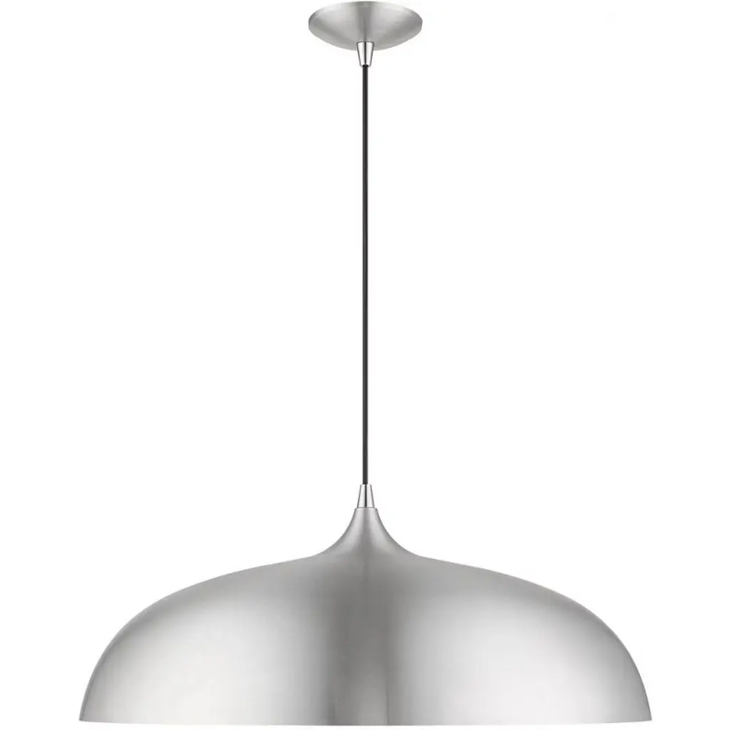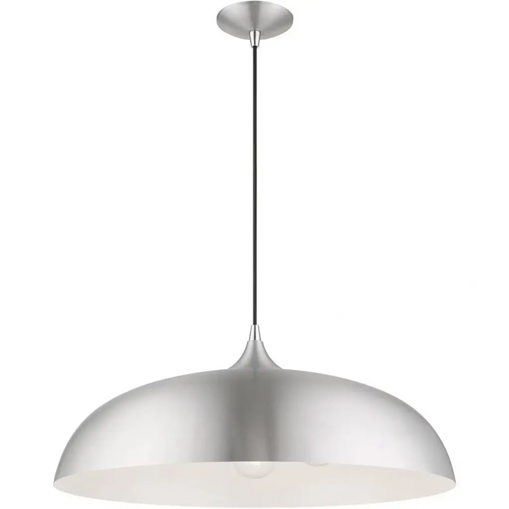 Collection: Amador, Material: Aluminum, Finish Color: Brushed Aluminum/Polished Chrome, Width: 23.75", Height: 15.75", Hanging Method: Cord, Lamping Type: Incandescent, Number Of Bulbs: 3, Wattage: 180 Watts, Moisture Rating: Dry Rated, Desc: The Amador three light large pendant features a modern, minimal look. It is shown in a chic brushed aluminum finish shade with a shiny white finish inside and polished chrome finish accents.,