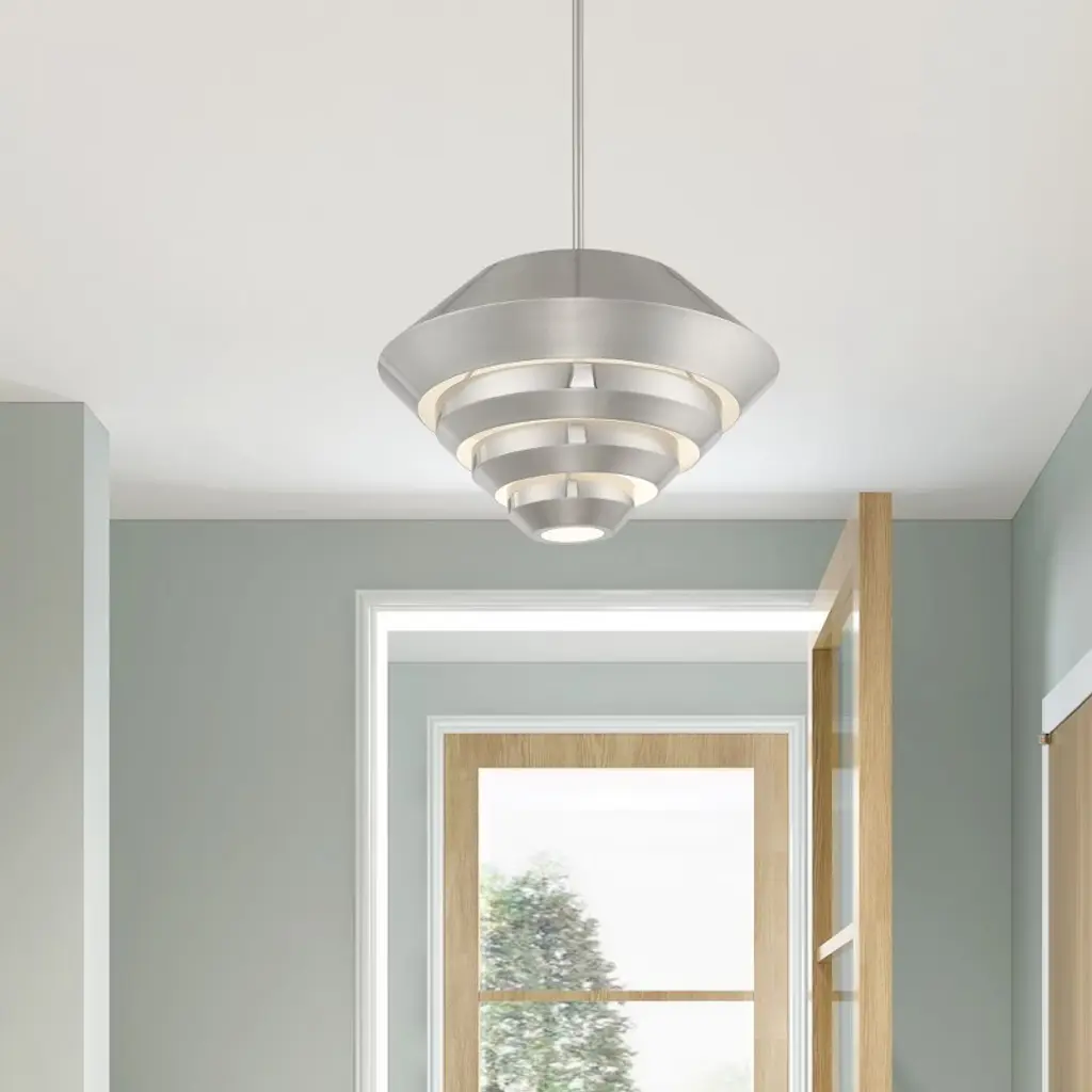 Collection: Amsterdam, Material: Steel, Finish Color: Brushed Nickel, Width: 18", Height: 20.5", Hanging Method: Stem, Lamping Type: Incandescent, Number Of Bulbs: 1, Wattage: 60 Watts, Moisture Rating: Dry Rated, Desc: A celebration of classic Danish lighting architecture, the Amsterdam mini pendant is elegantly tidy, creating lovely form out of functional necessity. The tiered metal shade echoes the shade's curvature and creates clean and bright ambience. No. of Rods: 3 / Canopy Included: Yes / Shade Included: Yes / Canopy Diameter: 4.75 / Rod Length(s): 18.00. ,