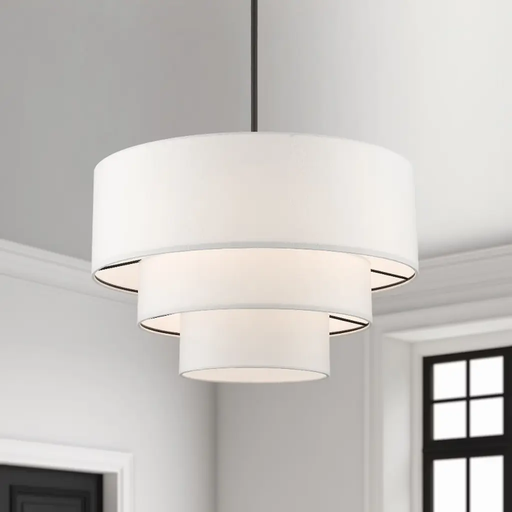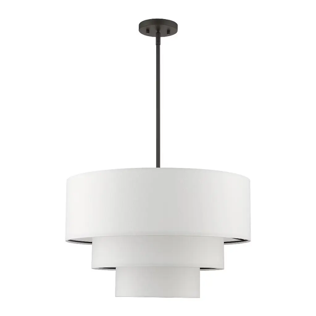 Collection: Carrington, Material: Steel, Finish Color: Bronze, Width: 23", Height: 22.5", Hanging Method: Stem, Lamping Type: Incandescent, Number Of Bulbs: 4, Wattage: 240 Watts, Moisture Rating: Dry Rated, Desc: The Carrington pendant chandelier is both modern and versatile. The hand-crafted off-white colored fabric hardback shade is set off by the silky white fabric on the inside setting a pleasant mood. The four-light triple drum shade adds character to this handsomely styled pendant. Perfect fit for the living room, dining room, kitchen and bedroom. This sleek design is shown in a bronze finish.,