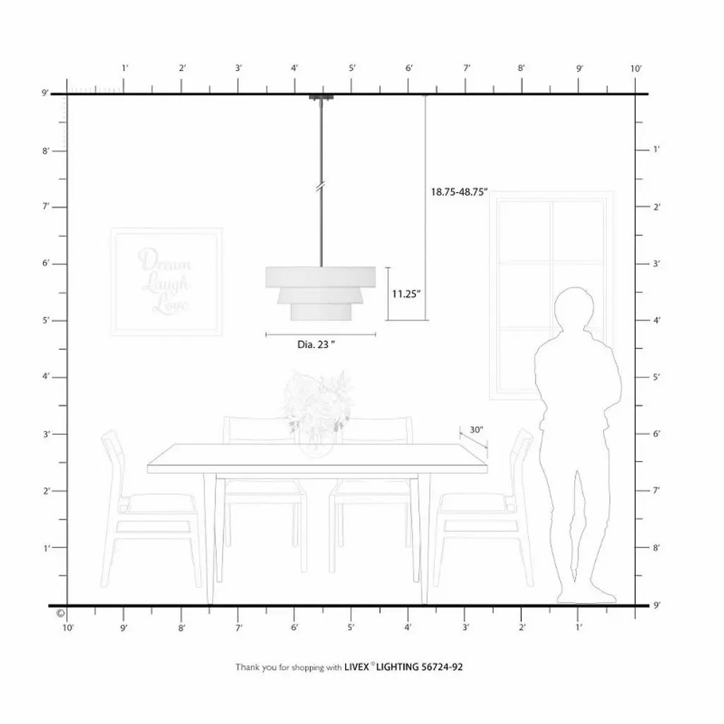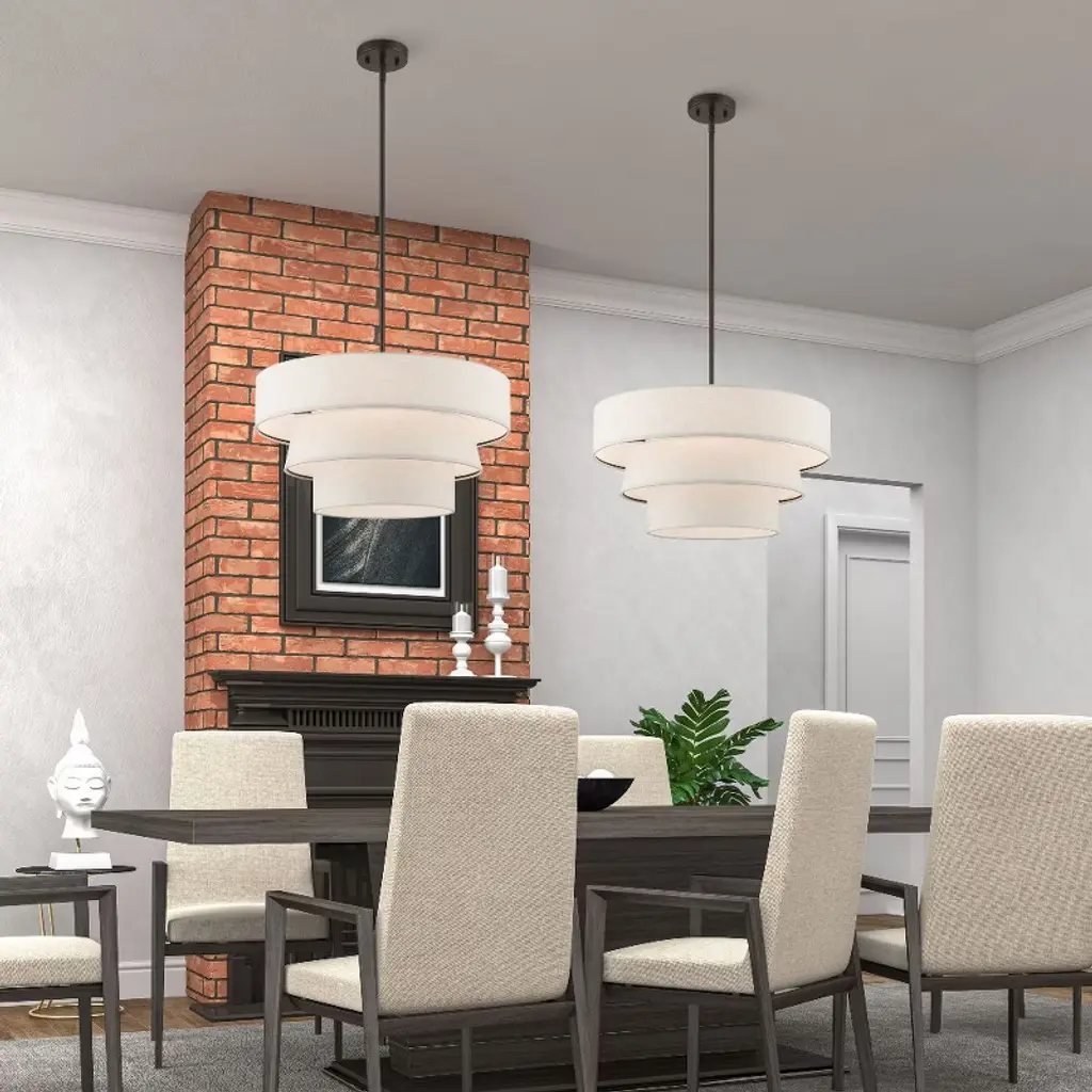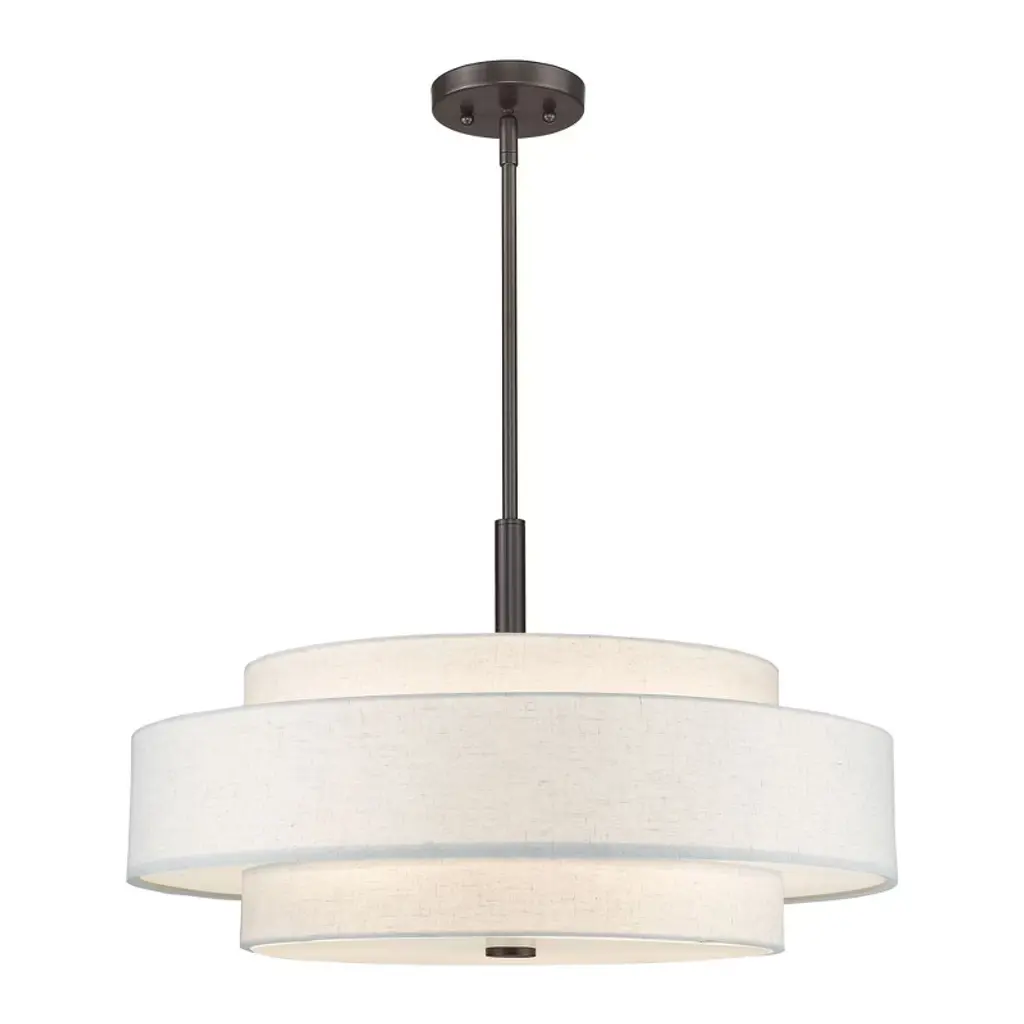 Collection: Chandler, Material: Steel, Finish Color: English Bronze, Width: 23", Height: 18.75", Hanging Method: Stem, Lamping Type: Incandescent, Number Of Bulbs: 4, Wattage: 240 Watts, Moisture Rating: Dry Rated, Desc: The Chandler pendant chandelier is both modern and versatile. The hand-crafted oatmeal colored fabric hardback shade is set off by the silky white fabric on the inside setting a pleasant mood. The four-light triple drum shade adds character to this handsomely styled pendant. Perfect fit for the living room, dining room, kitchen and bedroom. This sleek design is shown in an antique brass finish.,