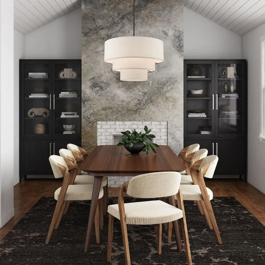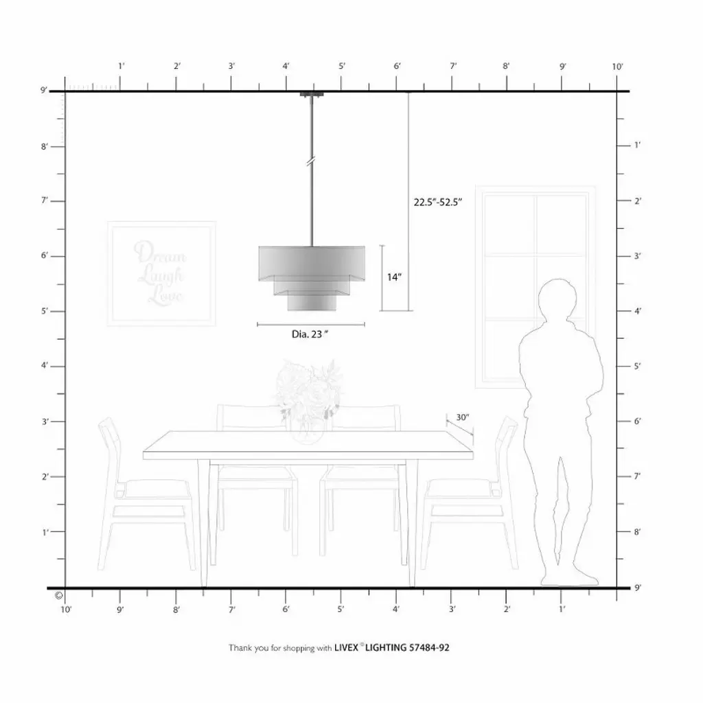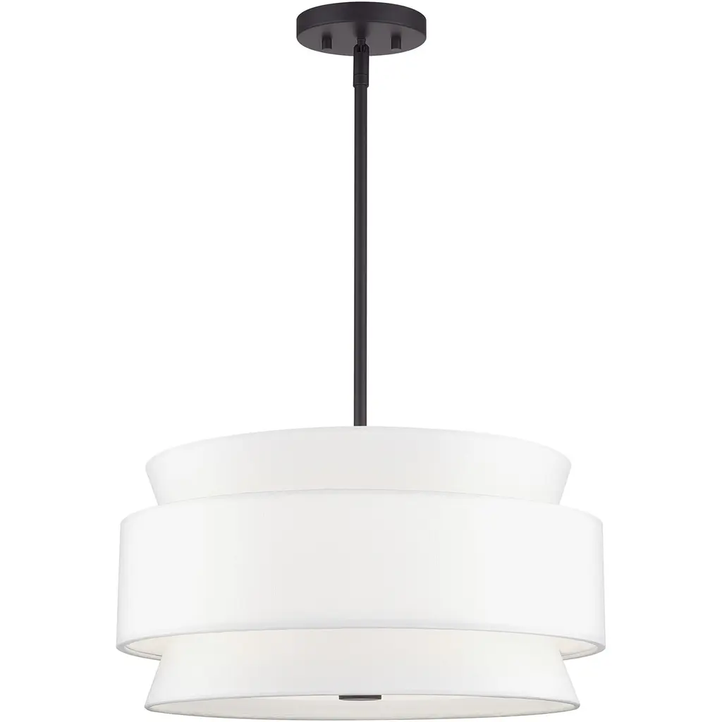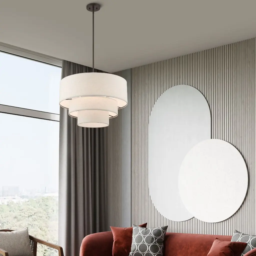 Collection: Gladstone, Material: Steel, Finish Color: English Bronze, Width: 23", Height: 22.5", Hanging Method: Stem, Lamping Type: Incandescent, Number Of Bulbs: 4, Wattage: 240 Watts, Moisture Rating: Dry Rated, Desc: The Gladstone pendant chandelier is both modern and versatile. The hand-crafted oatmeal colored fabric hardback shade is set off by the silky white fabric on the inside setting a pleasant mood. The four-light triple drum shade adds character to this handsomely styled pendant. Perfect fit for the living room, dining room, kitchen and bedroom. This sleek design is shown in an antique brass finish.,