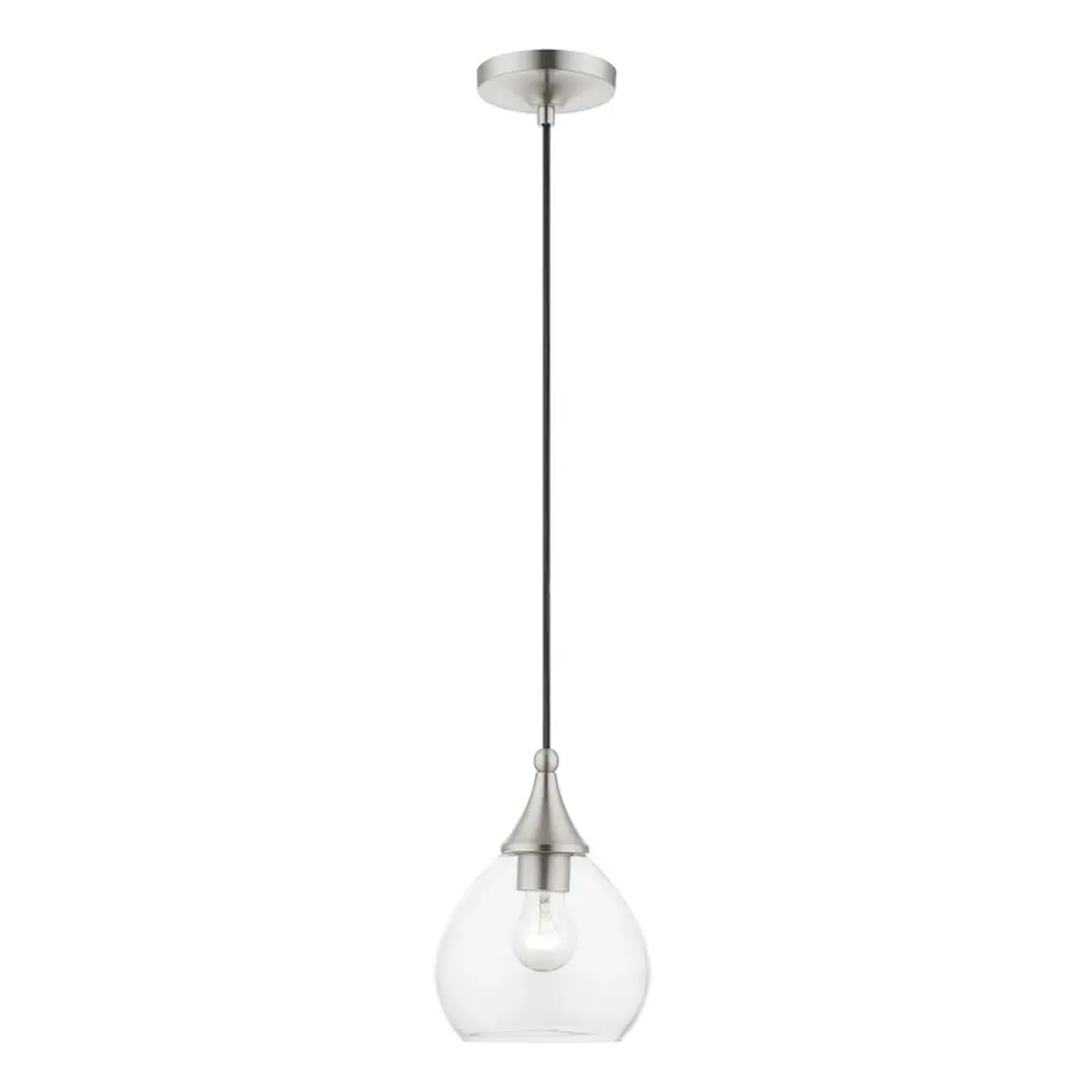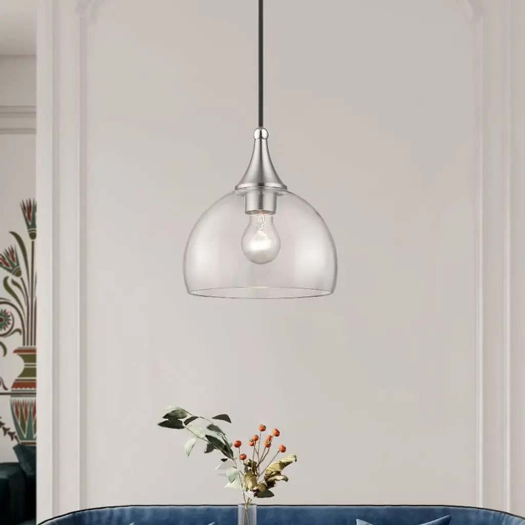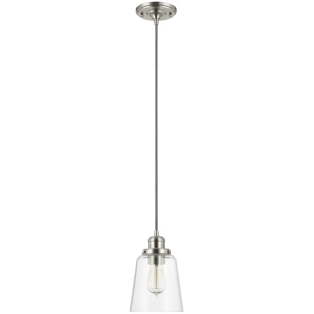 Collection: Glendon, Material: Steel, Finish Color: Brushed Nickel/Polished Chrome, Width: 8.25", Height: 15", Hanging Method: Cord, Lamping Type: Incandescent, Number Of Bulbs: 1, Wattage: 60 Watts, Moisture Rating: Dry Rated, Desc: This single pendant from the Glendon collection has understated elegance. It features minimal details, clear curved glass with an antique brass finish and can fit into any decor.,