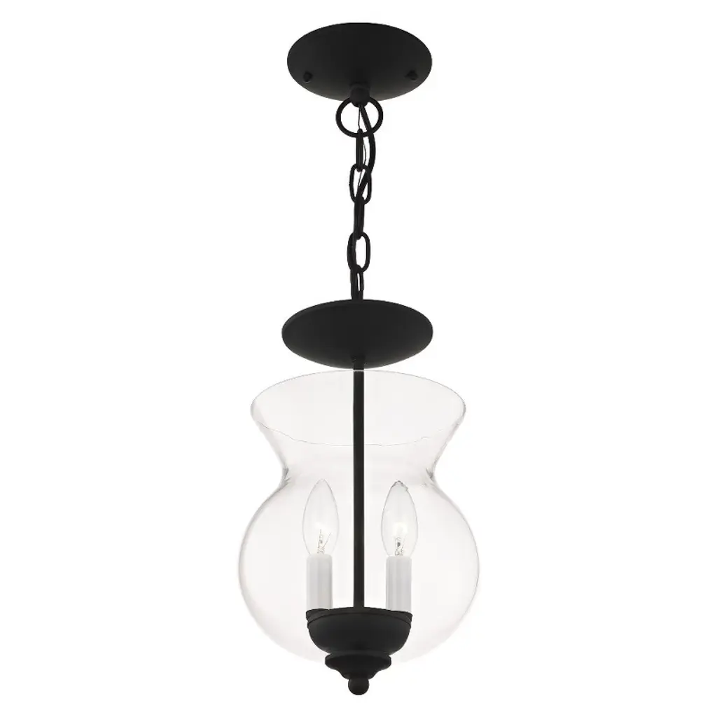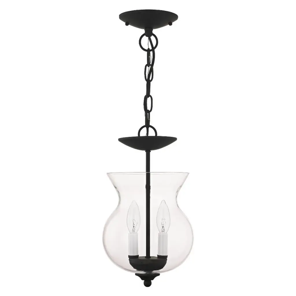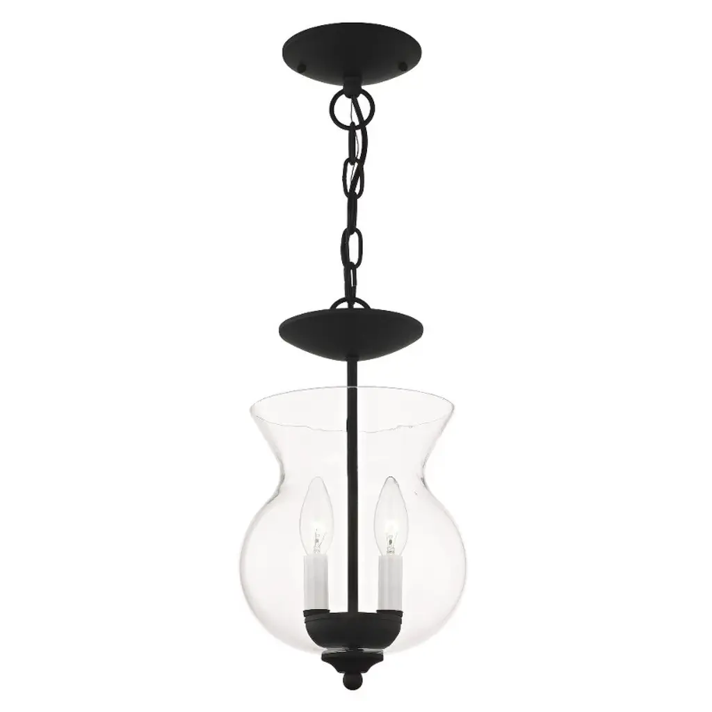 Collection: Heritage, Material: Steel, Finish Color: Black, Width: 8.25", Height: 14", Hanging Method: Chain, Chain Length: 36", Lamping Type: Incandescent, Number Of Bulbs: 2, Wattage: 120 Watts, Moisture Rating: Dry Rated, Desc: The Legacy collection offers a chic update to traditional style lighting. This pendant/semi-flush mount light design comes in a beautiful black finish with a traditional glass bell jar adding style.,