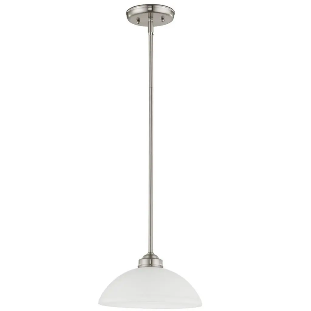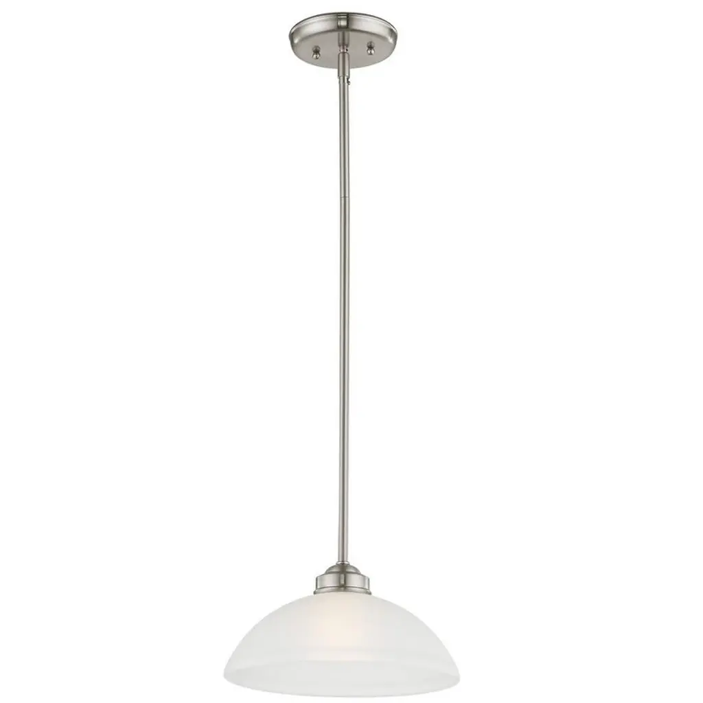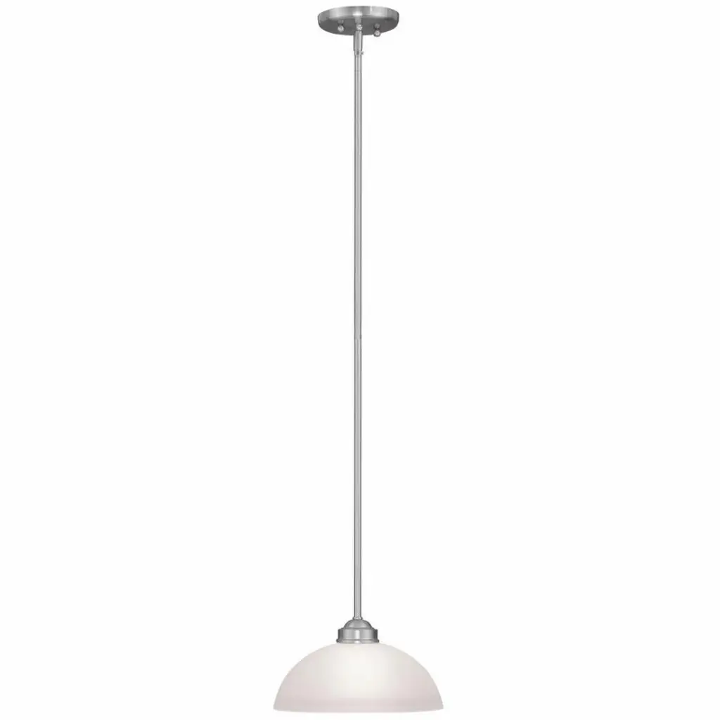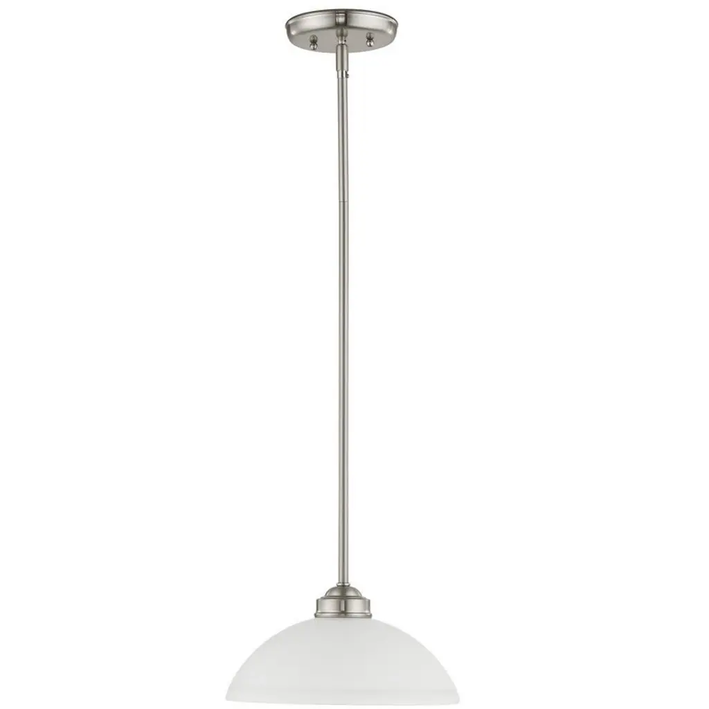 Collection: Somerset, Material: Steel, Finish Color: Brushed Nickel, Width: 11", Height: 8", Hanging Method: Stem, Lamping Type: Incandescent, Number Of Bulbs: 1, Wattage: 100 Watts, Moisture Rating: Dry Rated, Desc: Smooth lines meet gorgeous materials in our Somerset collection. The sleek design will add contemporary class and appeal to your home. This one light mid pendant features a brushed nickel finish with satin glass. No. of Rods: 3 / Canopy Included: Yes / Shade Included: Yes / Canopy Diameter: 5.00 / Rod Length(s): 18.00. ,