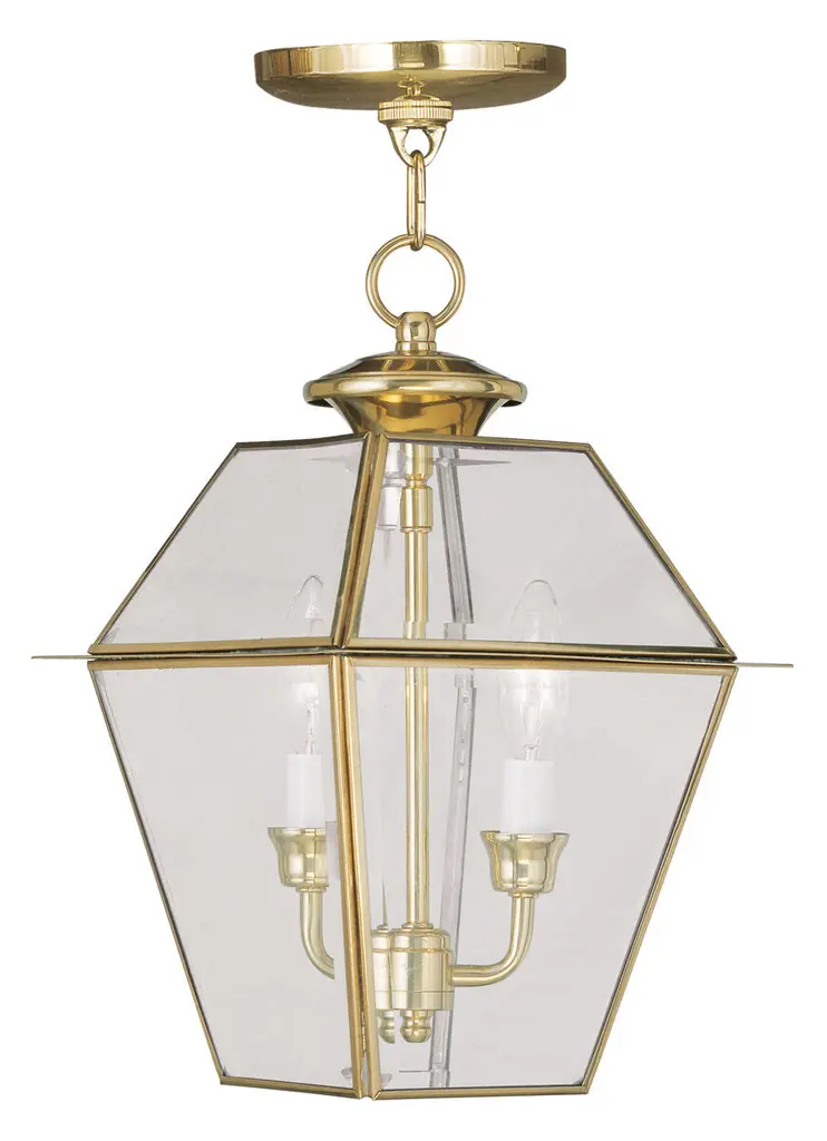 Collection: Westover, Material: Brass, Finish Color: Polished Brass, Width: 9", Height: 15", Length: 9", Chain Length: 36", Lamping Type: Incandescent, Number Of Bulbs: 2, Wattage: 60 Watts, Moisture Rating: Dry Rated, Desc: Inspired by the historic look and romantic feel of gas-burning lamps, the Westover collection is reminiscent of antique gas lights still popular in Southern cities like Charleston and New Orleans. This solid brass piece features two lights behind large panes of clear beveled glass. Canopy Included: Yes / Shade Included: Yes / Canopy Diameter: 5.00. ,