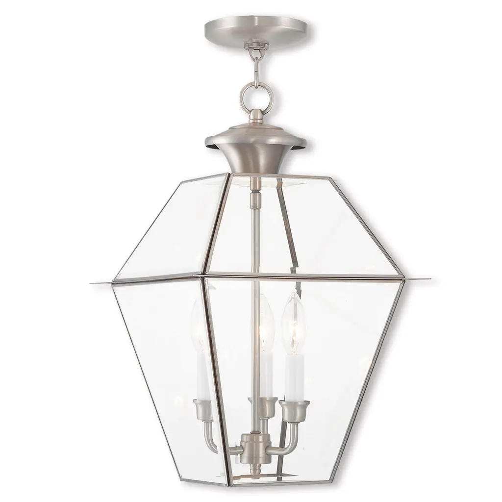 Collection: Westover, Material: Brass, Finish Color: Brushed Nickel, Width: 12", Height: 8", Length: 12", Chain Length: 36", Lamping Type: Incandescent, Number Of Bulbs: 3, Wattage: 60 Watts, Moisture Rating: Dry Rated, Desc: Inspired by the historic look and romantic feel of gas-burning lamps, the Westover collection is reminiscent of antique gas lights still popular in Southern cities like Charleston and New Orleans. This solid brass piece features three lights behind large panes of clear beveled glass. Canopy Included: Yes / Shade Included: Yes / Canopy Diameter: 5.00. ,