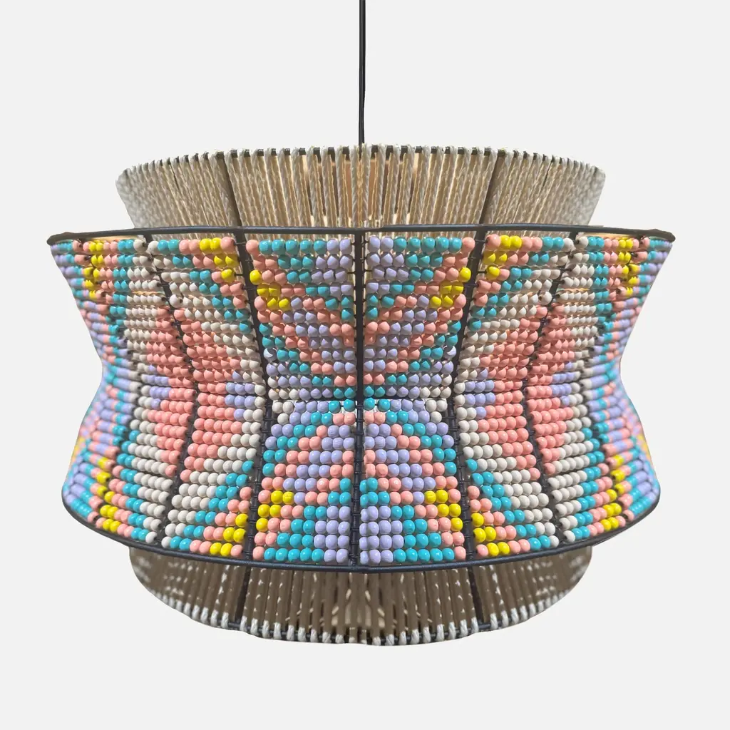 Create a beautiful and cozy bedroom with the Liz Large Nursery Chandelier - a breathtaking bedroom or nursery chandelier that is inspired by centuries-old Zulu beading tradition. Crafted by a studio dedicated to preserving traditional Zulu craftsmanship, this pretty nursery chandelier is handcrafted by skilled Zulu artisans using only the finest wood beads and yarn, resulting in a unique and high-end aesthetic. , The modern nursery lighting is not just a lighting fixture, it is a work of art. The balanced yet bold wood beaded outer pattern and solid woven interior are meticulously crafted to create a unique and high-end addition to any baby's room. What sets this modern nursery chandelier apart is its versatility. With an adjustable cord, this chandelier can be customized to fit a variety of ceiling heights, ensuring that it will fit perfectly in any room. Use as a beautiful bedroom chandelier or foyer entry chandelier. As a 54kibo exclusive, you won't find this stunning chandelier anywhere else. So if you're looking for the best bedroom chandeliers and unique nursery light fixtures, look no further than the Liz large nursery chandelier.