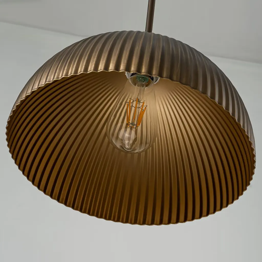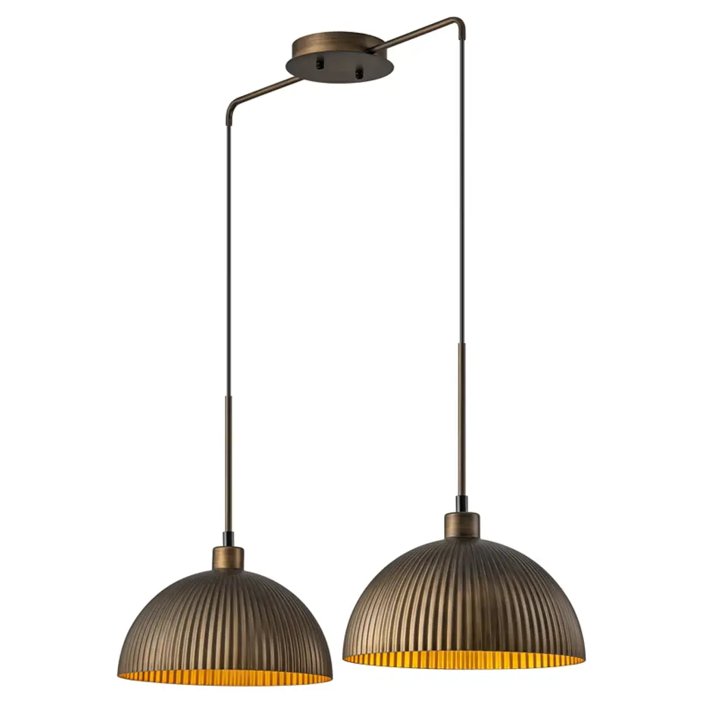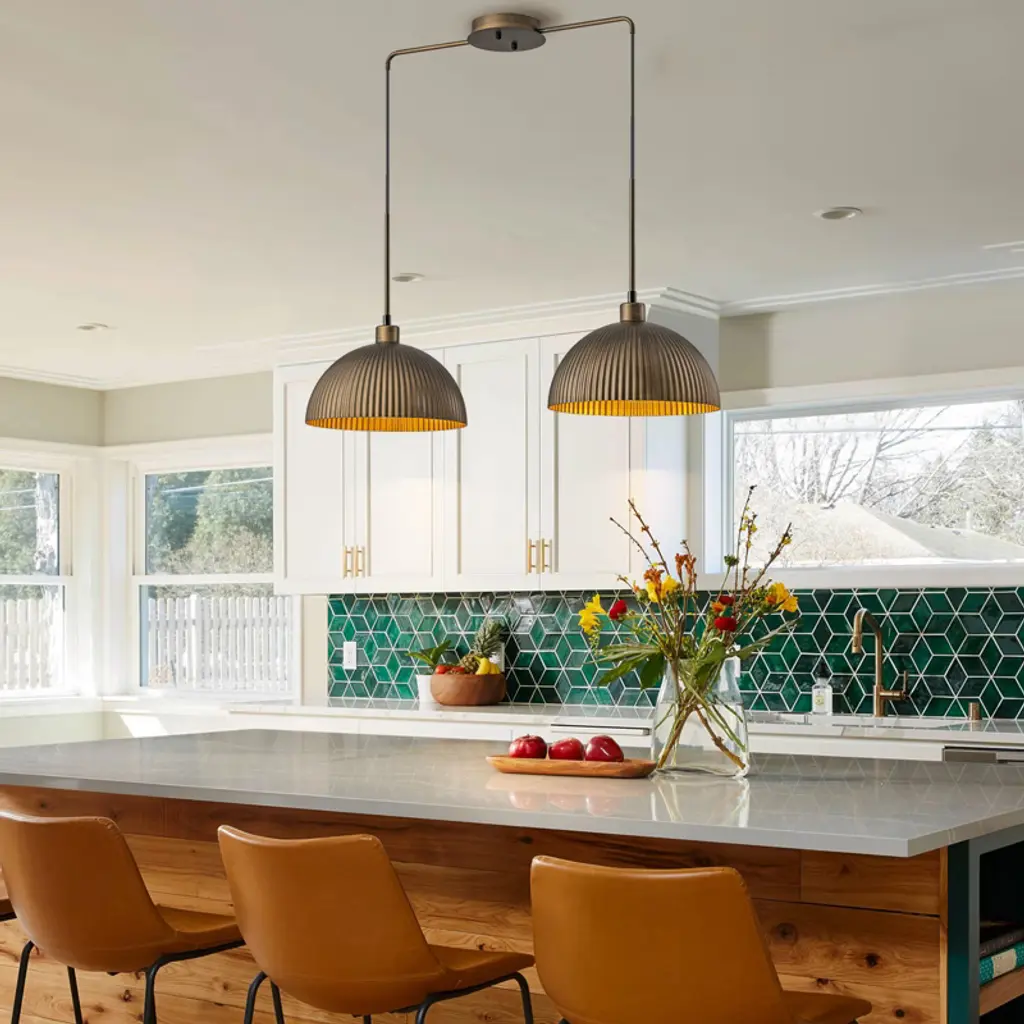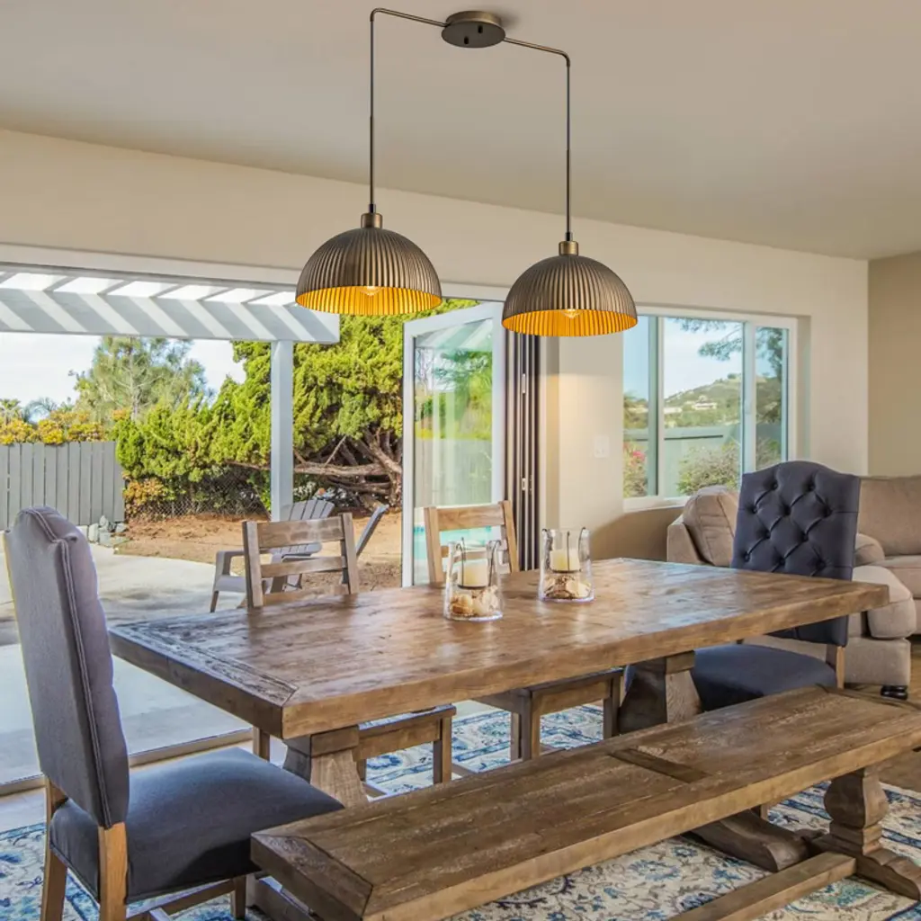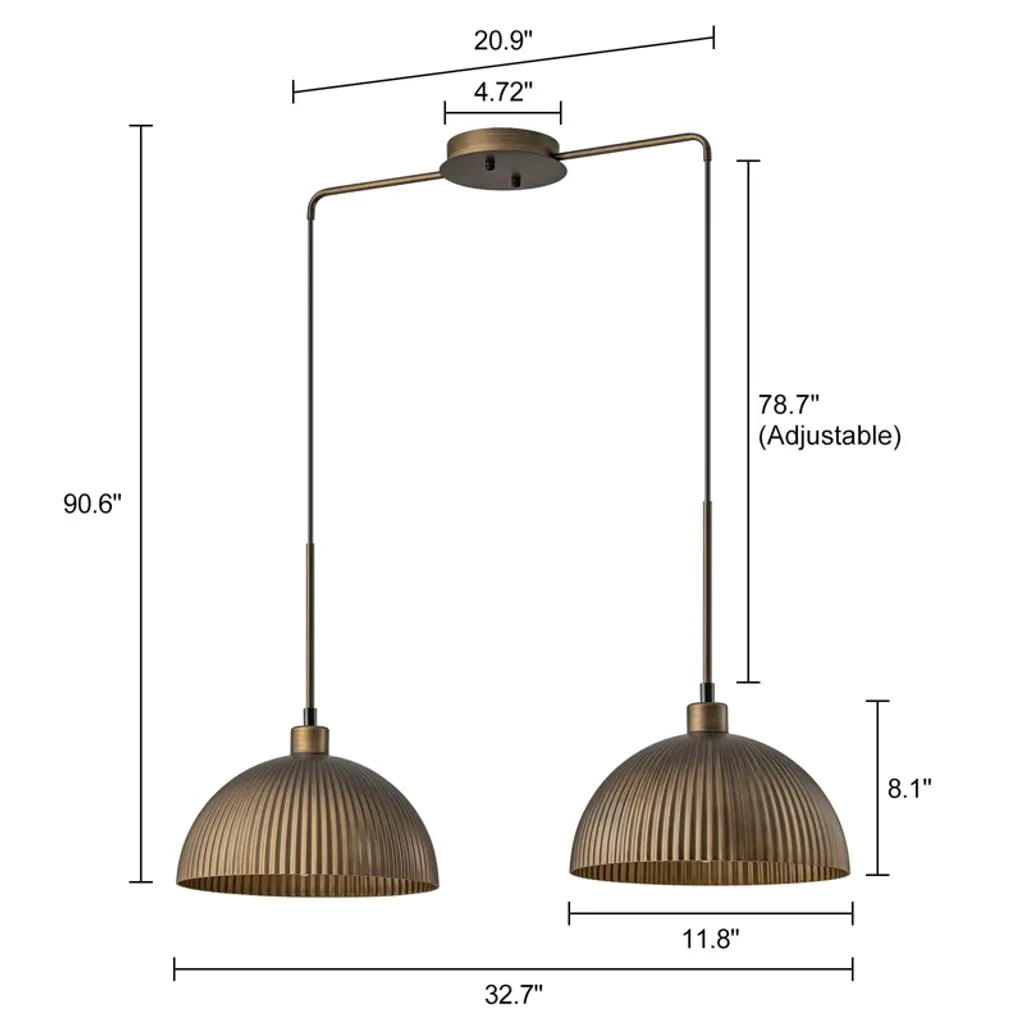 This pendant blends industrial charm with mid-century design, featuring a striped dome shade in antique bronze for soft, stylish lighting. Measuring 32 7/10" W x 11 4/5" D x 8 1/8" H, it¡¯s compact and ideal for dining tables or kitchen islands. The 78 3/4" cord is height-adjustable and compatible with all ceiling types. Requires 1 x E26 bulb (60W max, not included), dimmable, and includes mounting hardware for easy installation.