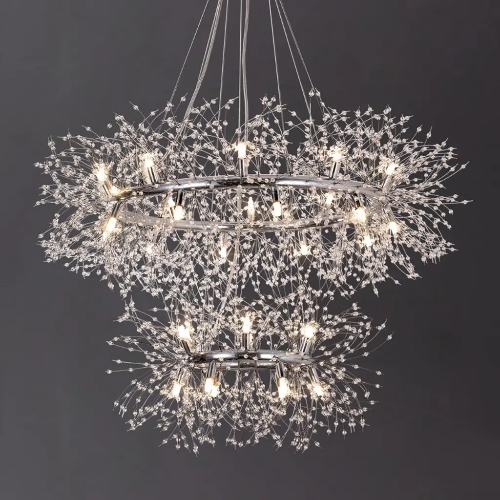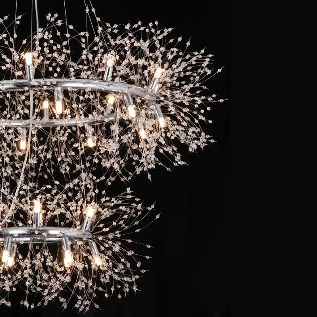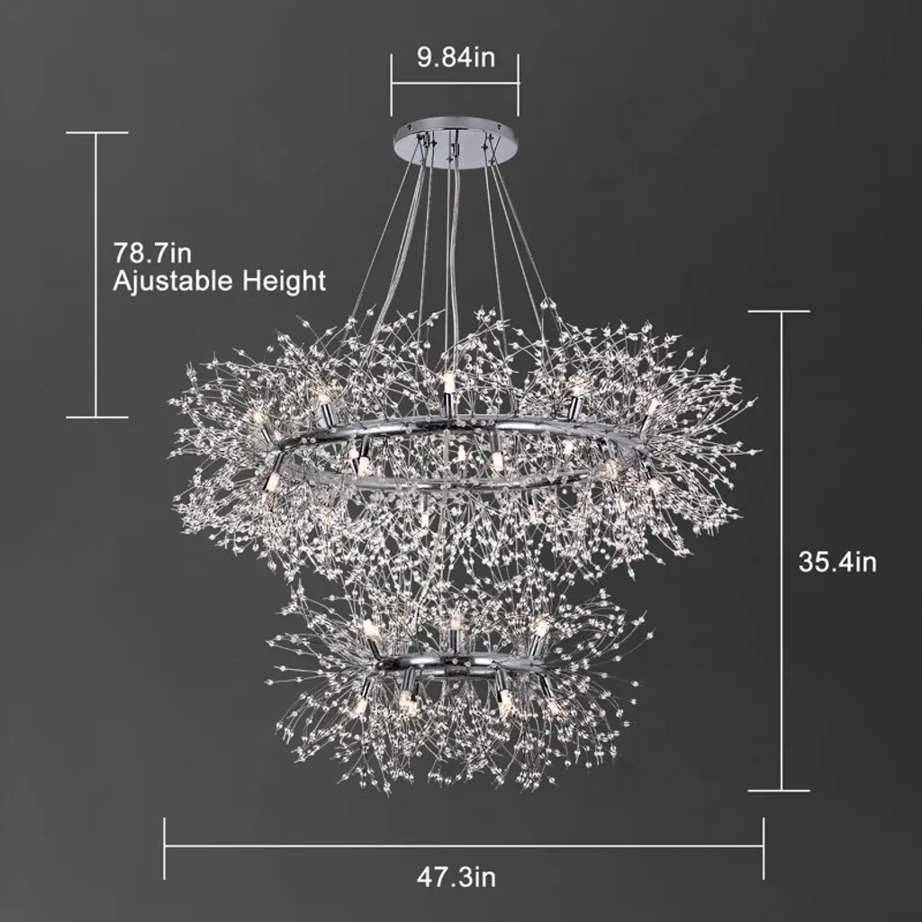 Make a bold lighting statement with this two-tiered dandelion crystal chandelier. Designed with a 47 3/10" and 27 1/2" double-ring frame, this chandelier features 160 glistening crystal strands suspended from polished chrome hardware for a layered, radiant effect. It includes 34 G9 warm LED bulbs (32 in use and 2 extra), delivering consistent soft light perfect for foyers, staircases, or high-ceilinged living spaces. The 78 3/10" adjustable clear wires offer flexible mounting, and the fixture includes an ETL label for certified safety.