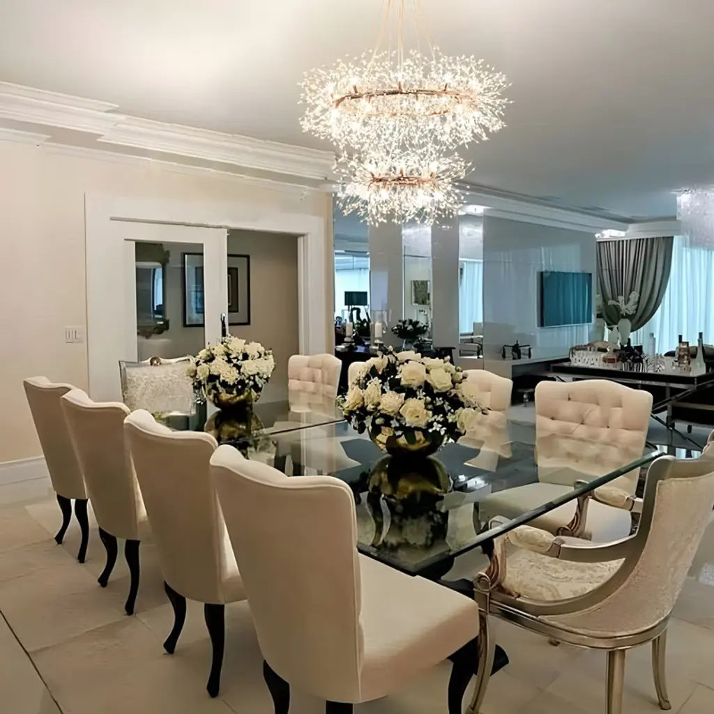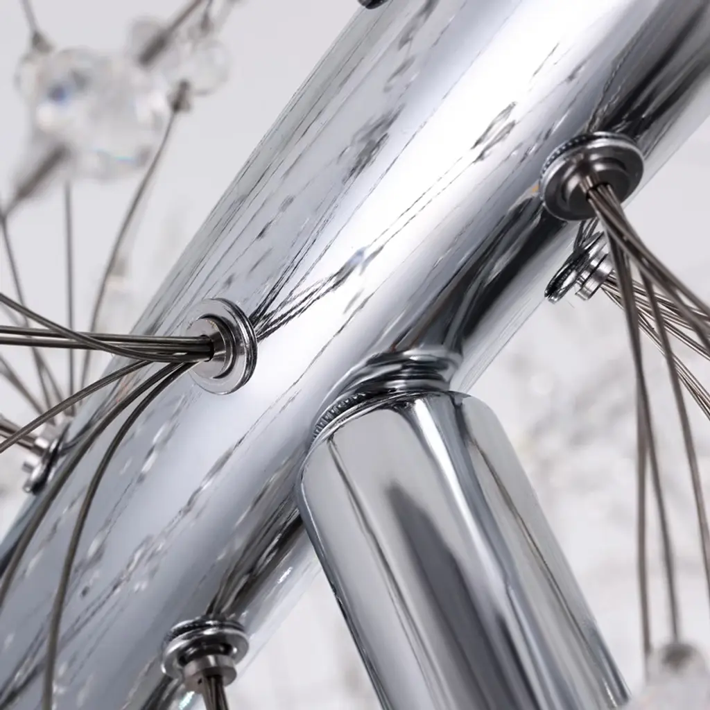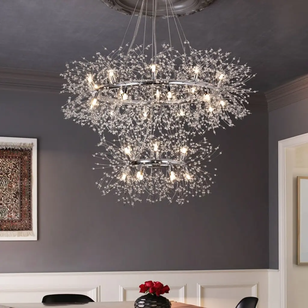 Make a bold lighting statement with this two-tiered dandelion crystal chandelier. Designed with a 47 3/10" and 27 1/2" double-ring frame, this chandelier features 160 glistening crystal strands suspended from polished chrome hardware for a layered, radiant effect. It includes 34 G9 warm LED bulbs (32 in use and 2 extra), delivering consistent soft light perfect for foyers, staircases, or high-ceilinged living spaces. The 78 3/10" adjustable clear wires offer flexible mounting, and the fixture includes an ETL label for certified safety.