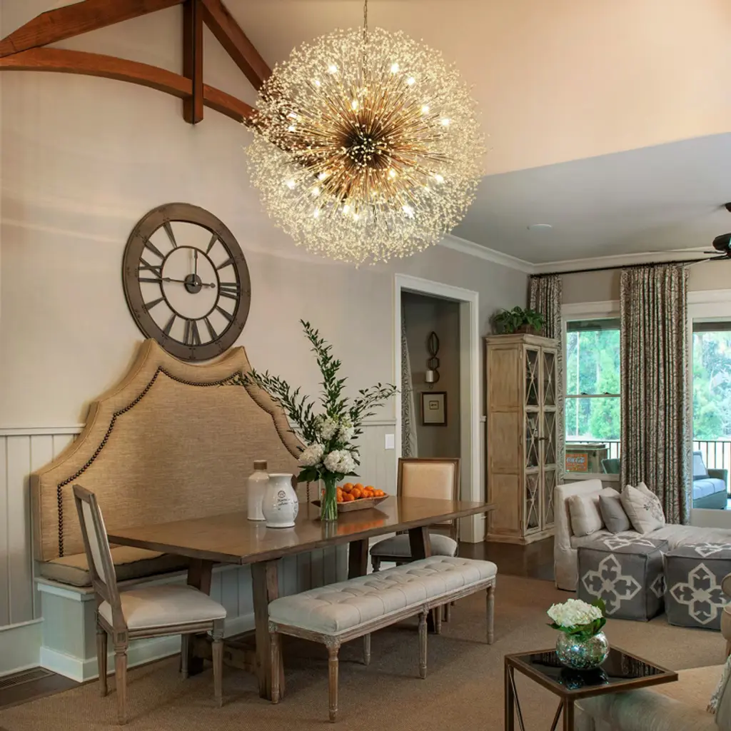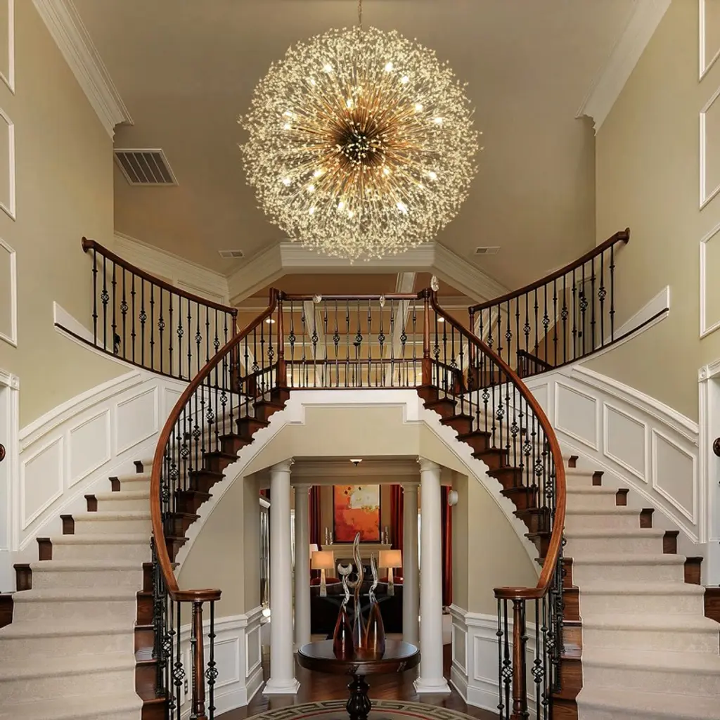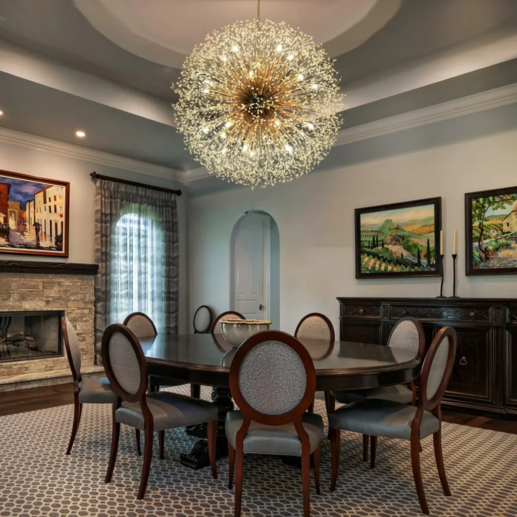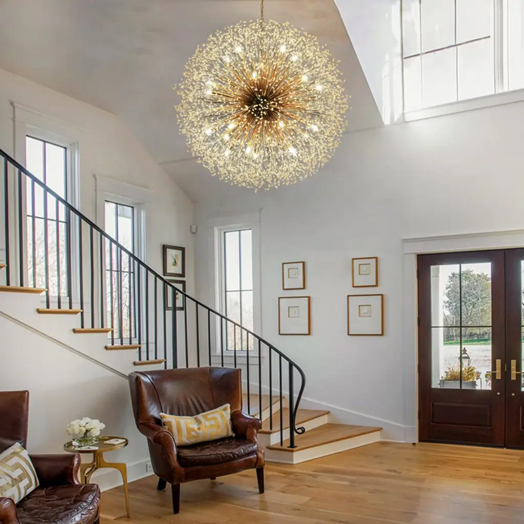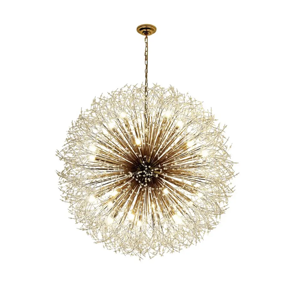 Bring bold brilliance to your home with this 24-light dandelion-inspired chandelier. Measuring 43 7/10" in diameter and 47" in height, it's designed to impress in spacious interiors like foyers, dining rooms, or staircases. The chandelier comes with 26 G9 warm white LED bulbs to ensure a consistent, glowing ambiance. With its 78 7/10" adjustable chain, you can easily tailor the overall height to your ceiling needs. Crafted from high-quality metal, this fixture blends modern artistry with reliable durability.
