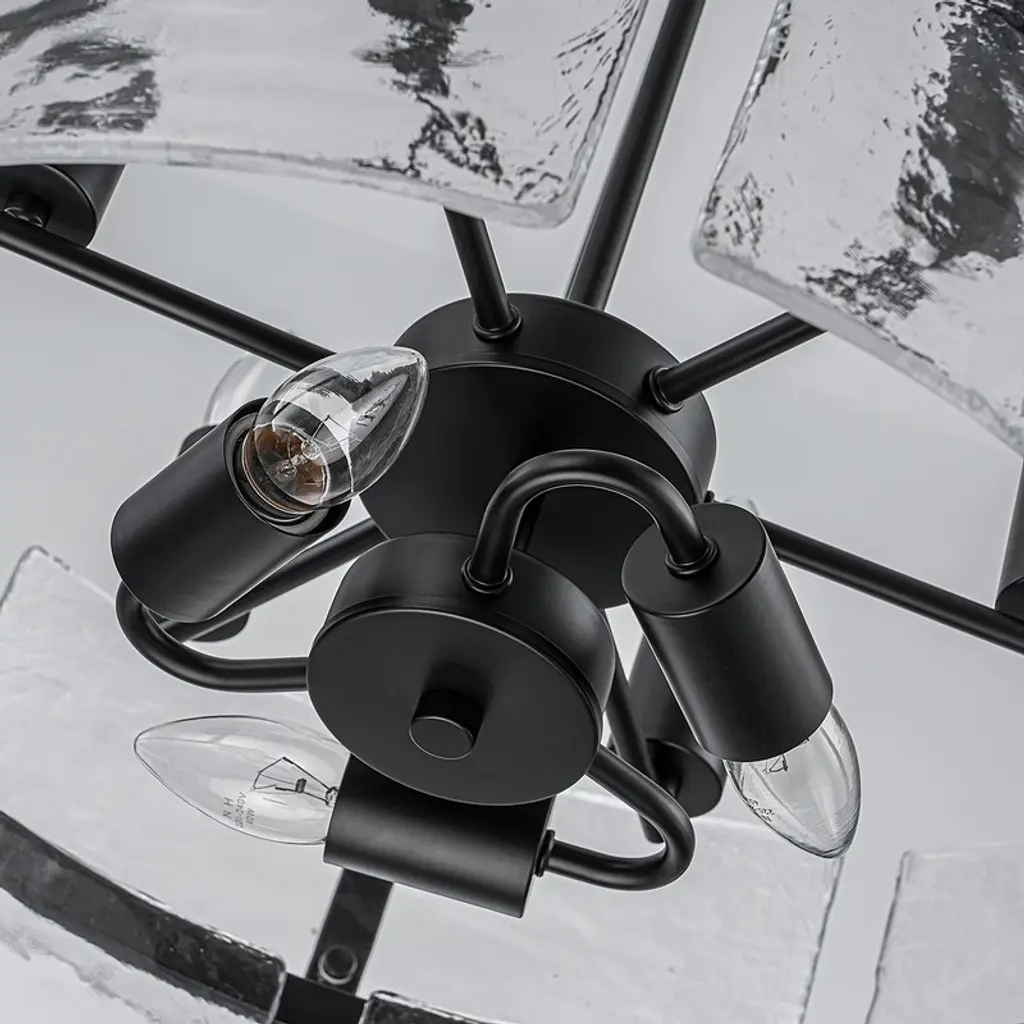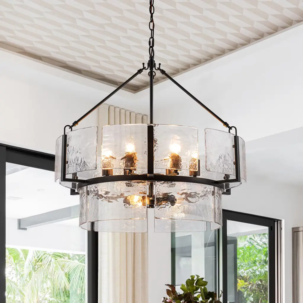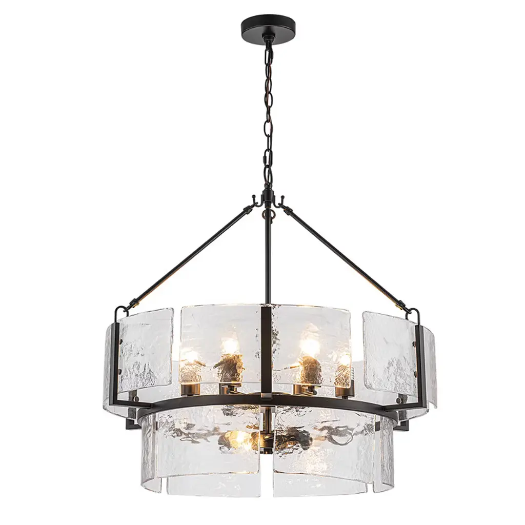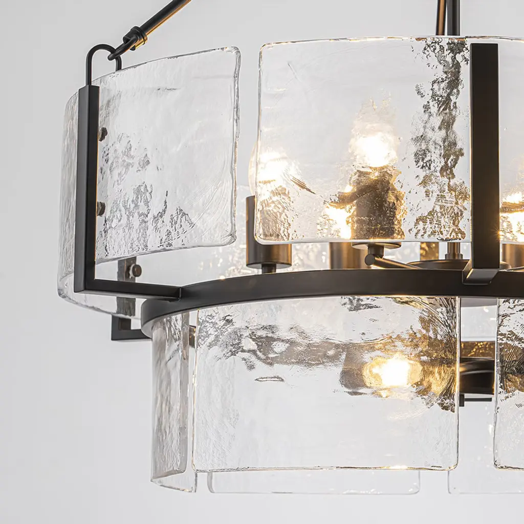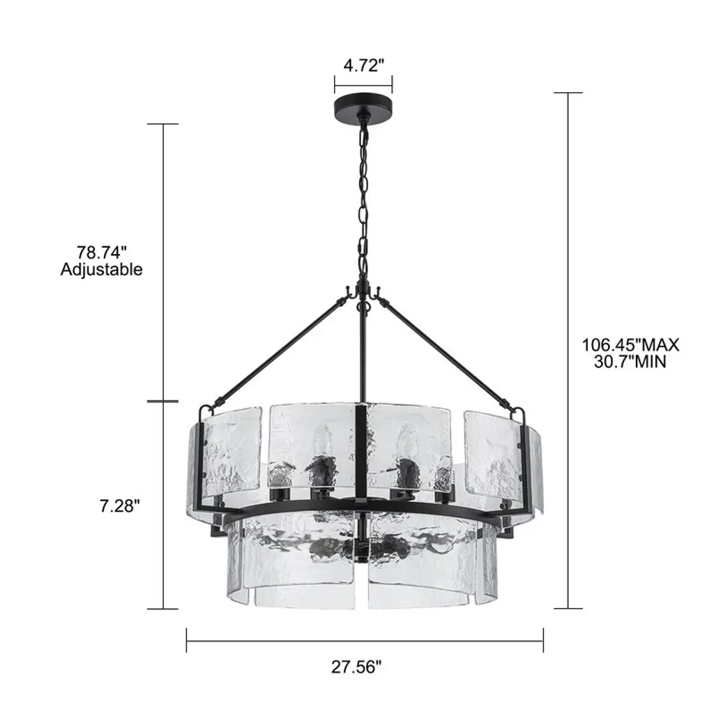 Illuminate your home with artistic flair using this 9-light iron chandelier featuring hand-crafted ice-textured glass. The dual-layered design showcases 12 frosted glass slabs in two sizes (L325mm and L230mm), arranged in a cascading layout for dimensional elegance. Each panel captures and refracts light with shimmering brilliance, creating a glowing sculpture in the air. The sleek rectangular iron frame measures 27 1/2" wide and is suspended from a fully adjustable 78 3/4" hanging rod, allowing for a minimum drop of 30 7/10" and a maximum of 106 2/5". Perfect for dining rooms, entryways, or high-ceiling lofts, this fixture holds nine E26 ceramic sockets, each supporting up to 40W bulbs (bulbs not included). Whether you opt for soft warm light or bold Edison bulbs, this chandelier brings a sense of modern luxury blended with retro charm.