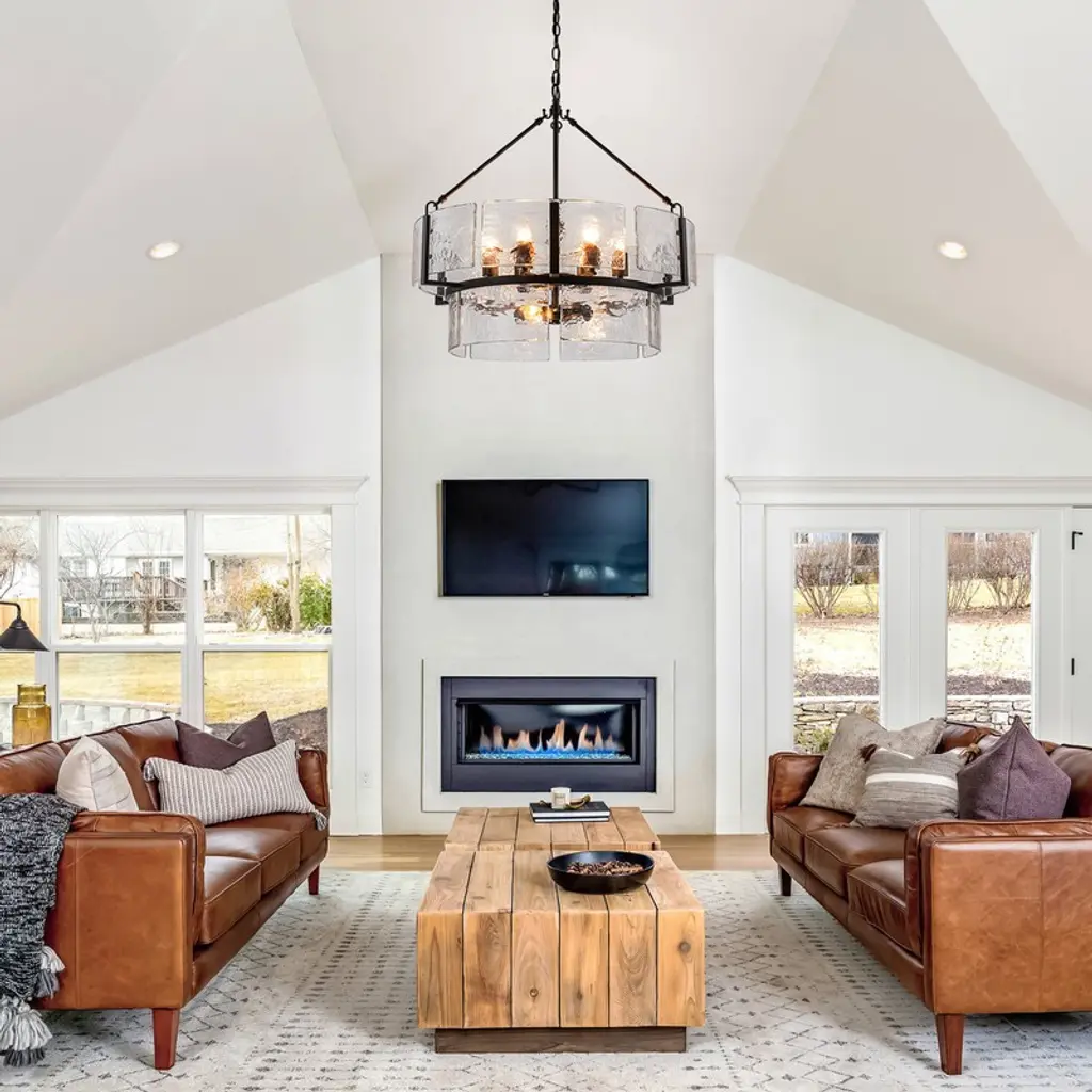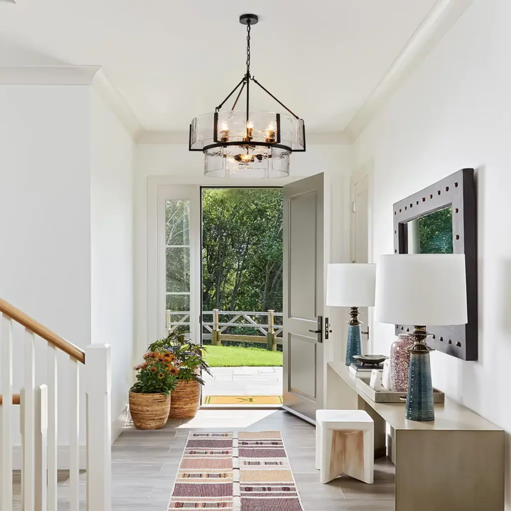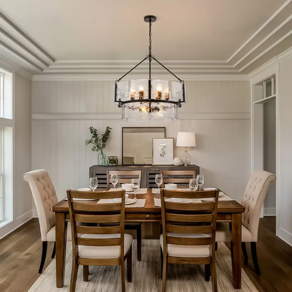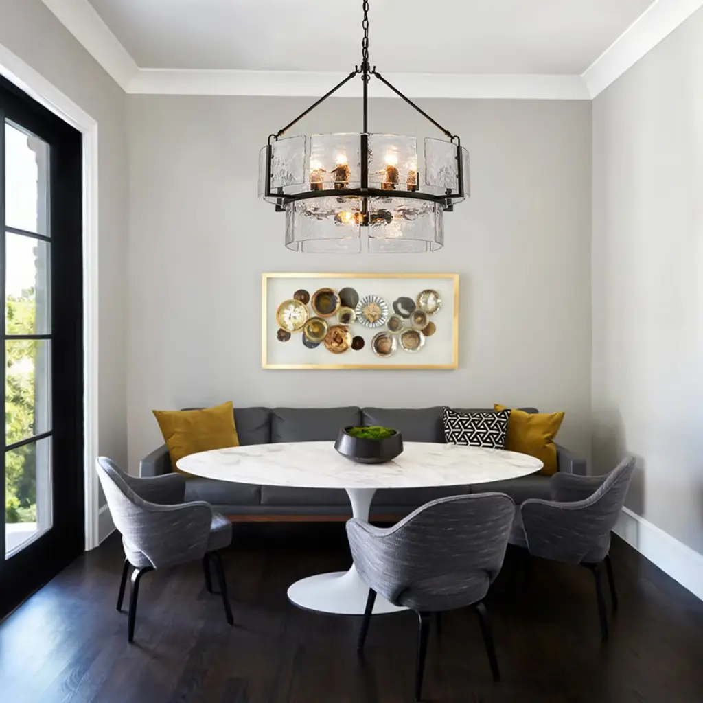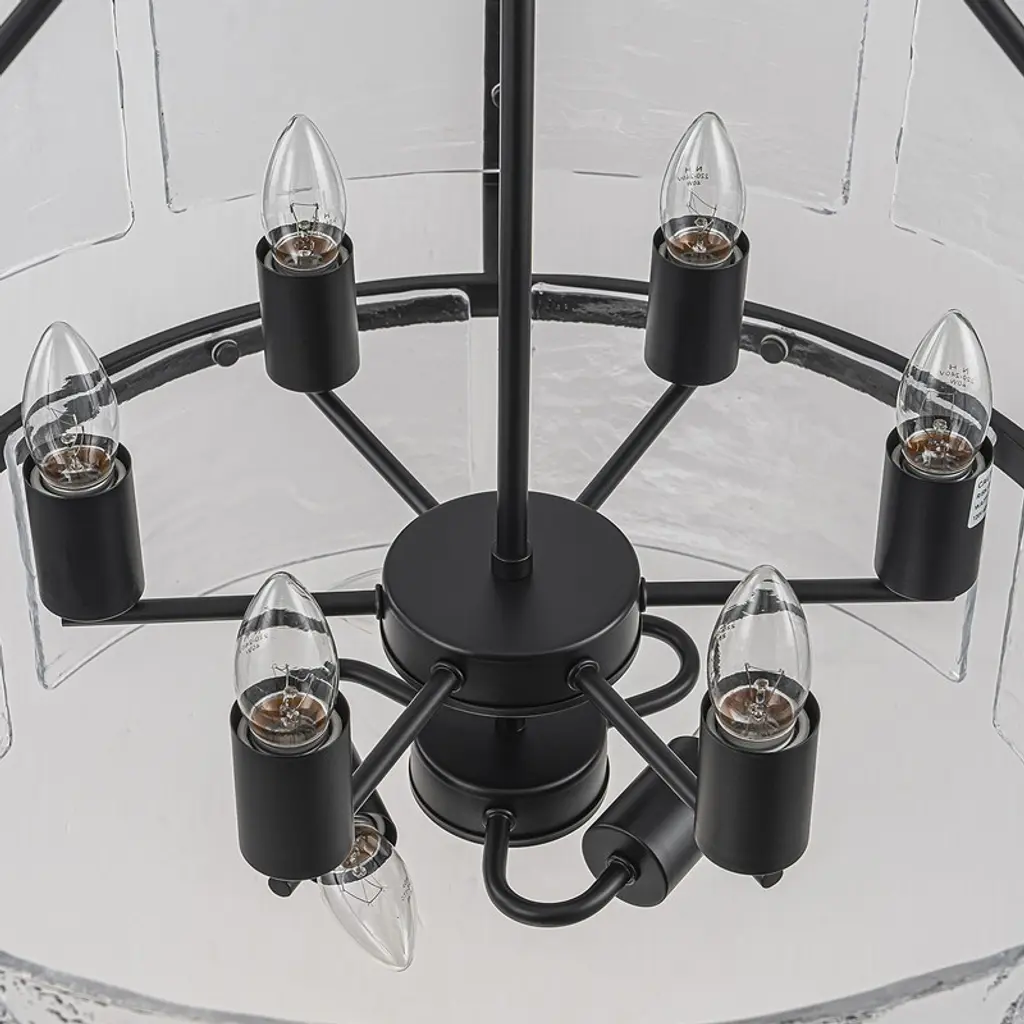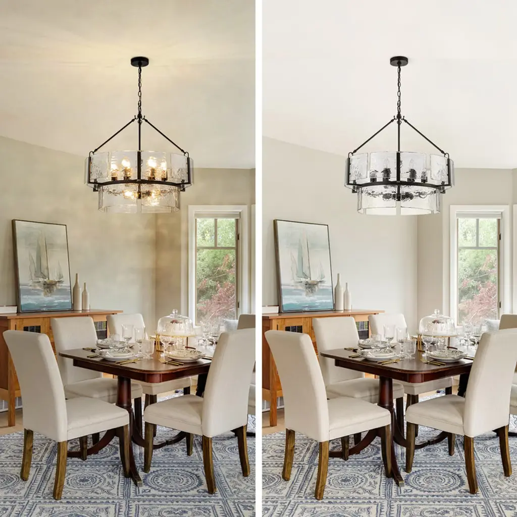 Illuminate your home with artistic flair using this 9-light iron chandelier featuring hand-crafted ice-textured glass. The dual-layered design showcases 12 frosted glass slabs in two sizes (L325mm and L230mm), arranged in a cascading layout for dimensional elegance. Each panel captures and refracts light with shimmering brilliance, creating a glowing sculpture in the air. The sleek rectangular iron frame measures 27 1/2" wide and is suspended from a fully adjustable 78 3/4" hanging rod, allowing for a minimum drop of 30 7/10" and a maximum of 106 2/5". Perfect for dining rooms, entryways, or high-ceiling lofts, this fixture holds nine E26 ceramic sockets, each supporting up to 40W bulbs (bulbs not included). Whether you opt for soft warm light or bold Edison bulbs, this chandelier brings a sense of modern luxury blended with retro charm.