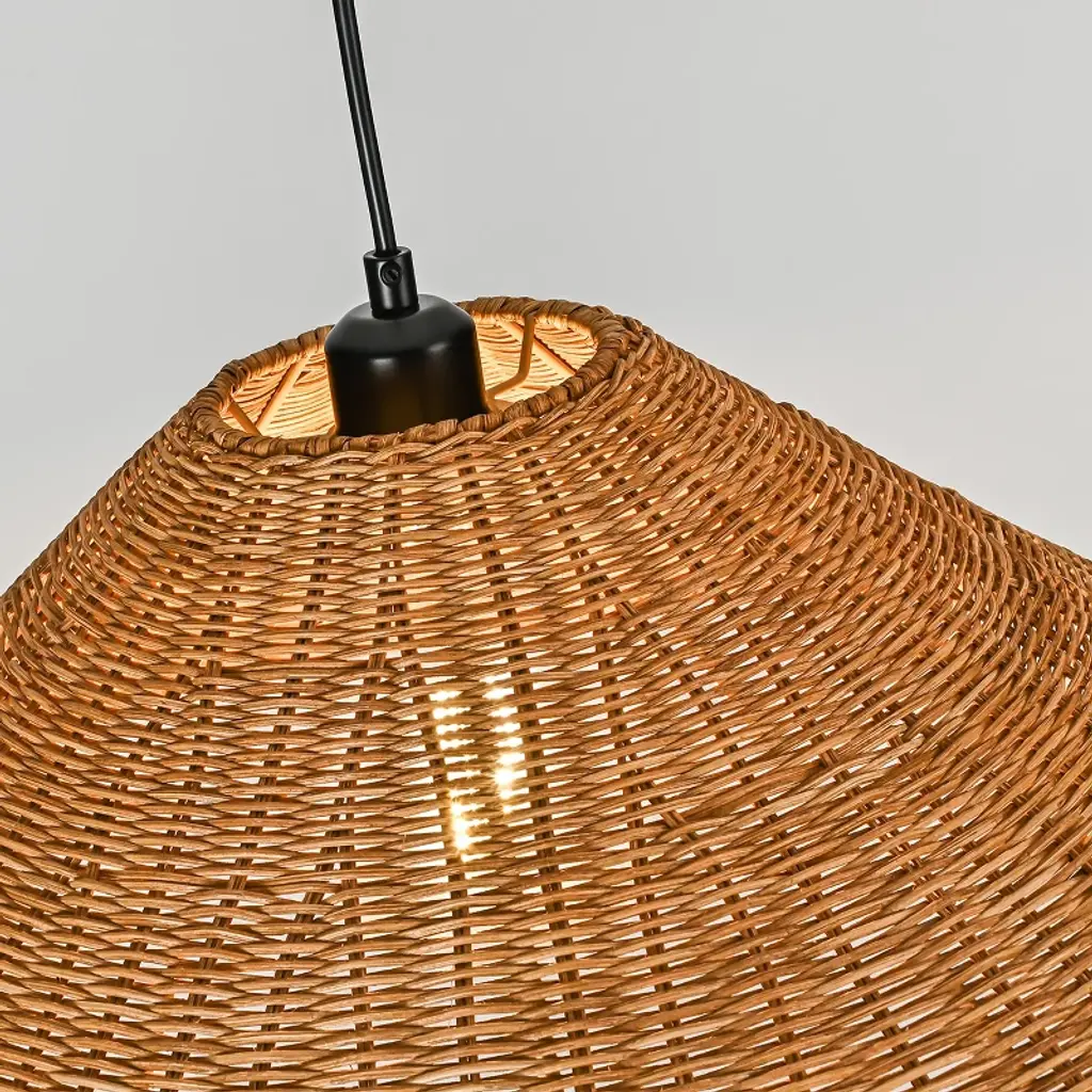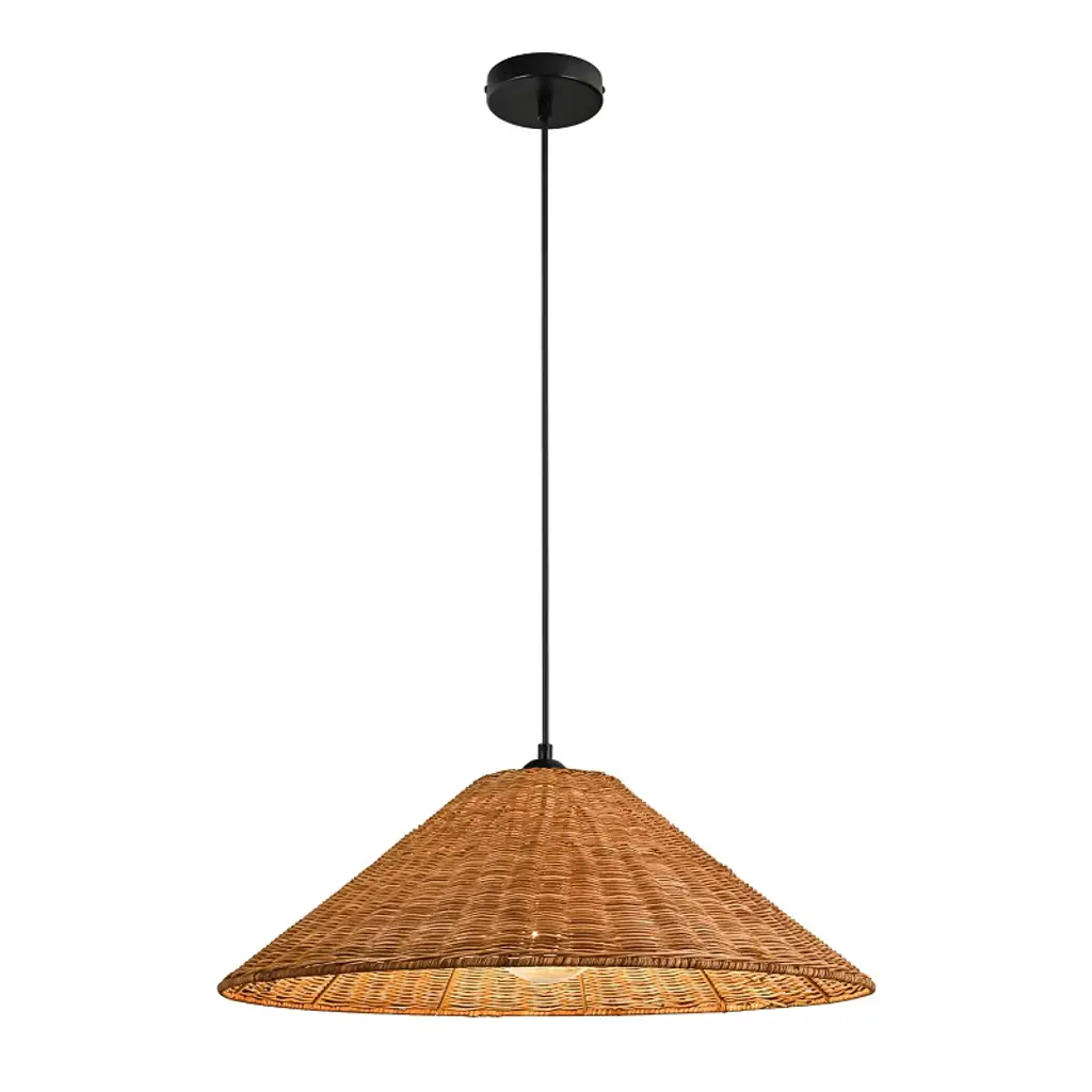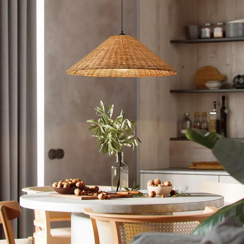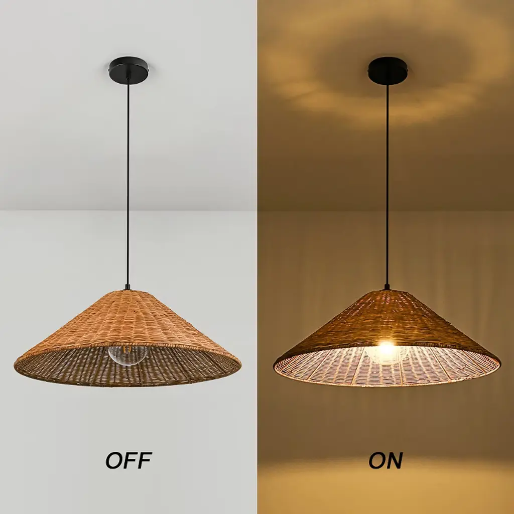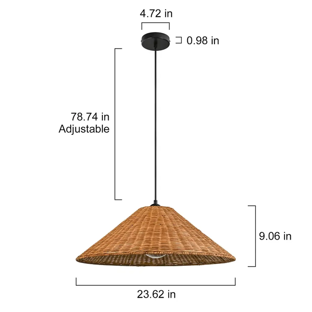 This single-head coffee-colored straw hat rattan pendant light features a classic design, perfectly complementing various home decor styles. Equipped with an E26 ceramic socket, it supports up to 60W (bulb not included) for warm, ample lighting. The adjustable height (up to 78 3/4 inches) is ideal for different room and space requirements. The high-quality rattan material gives the fixture a unique natural beauty, creating a cozy atmosphere. ETL certified for safety and easy installation, perfect for home, dining rooms, and more. (Fixture Dimensions: ф23 5/8" x H9"; adjustable total height: 78 3/4 inches )