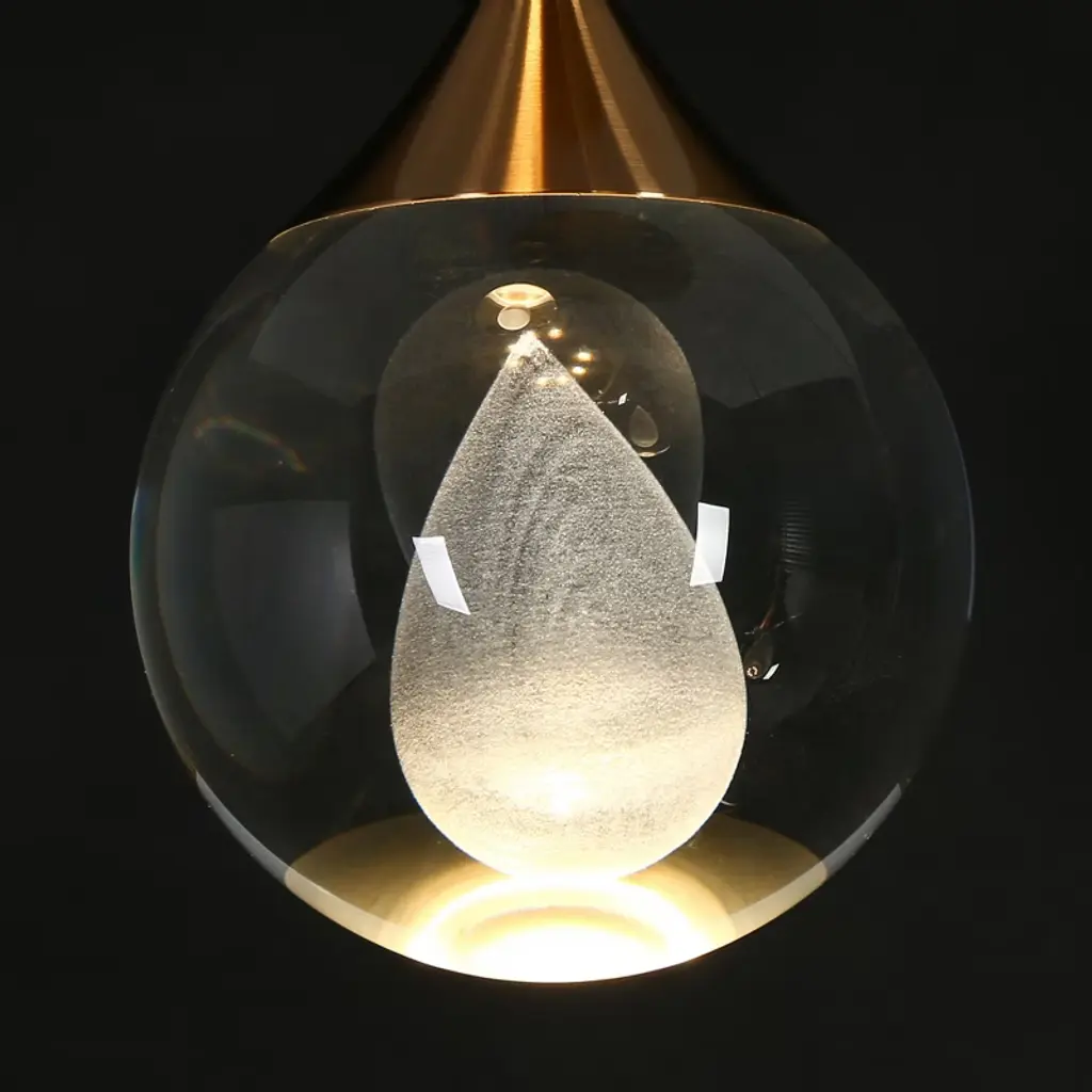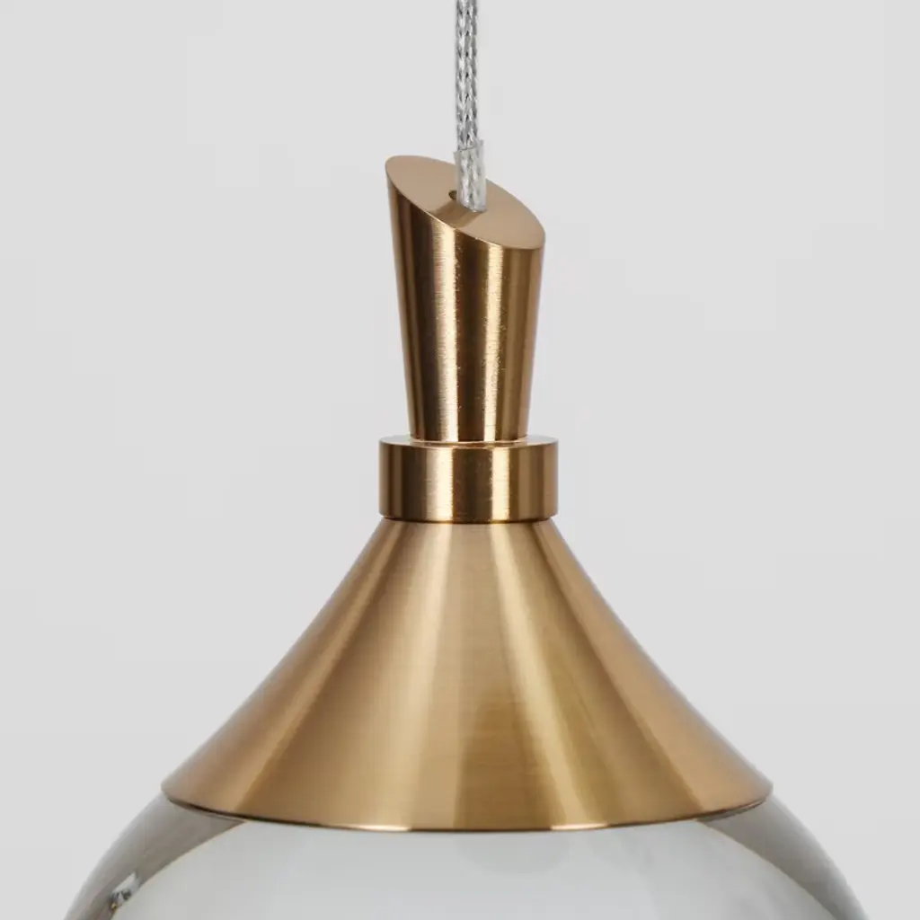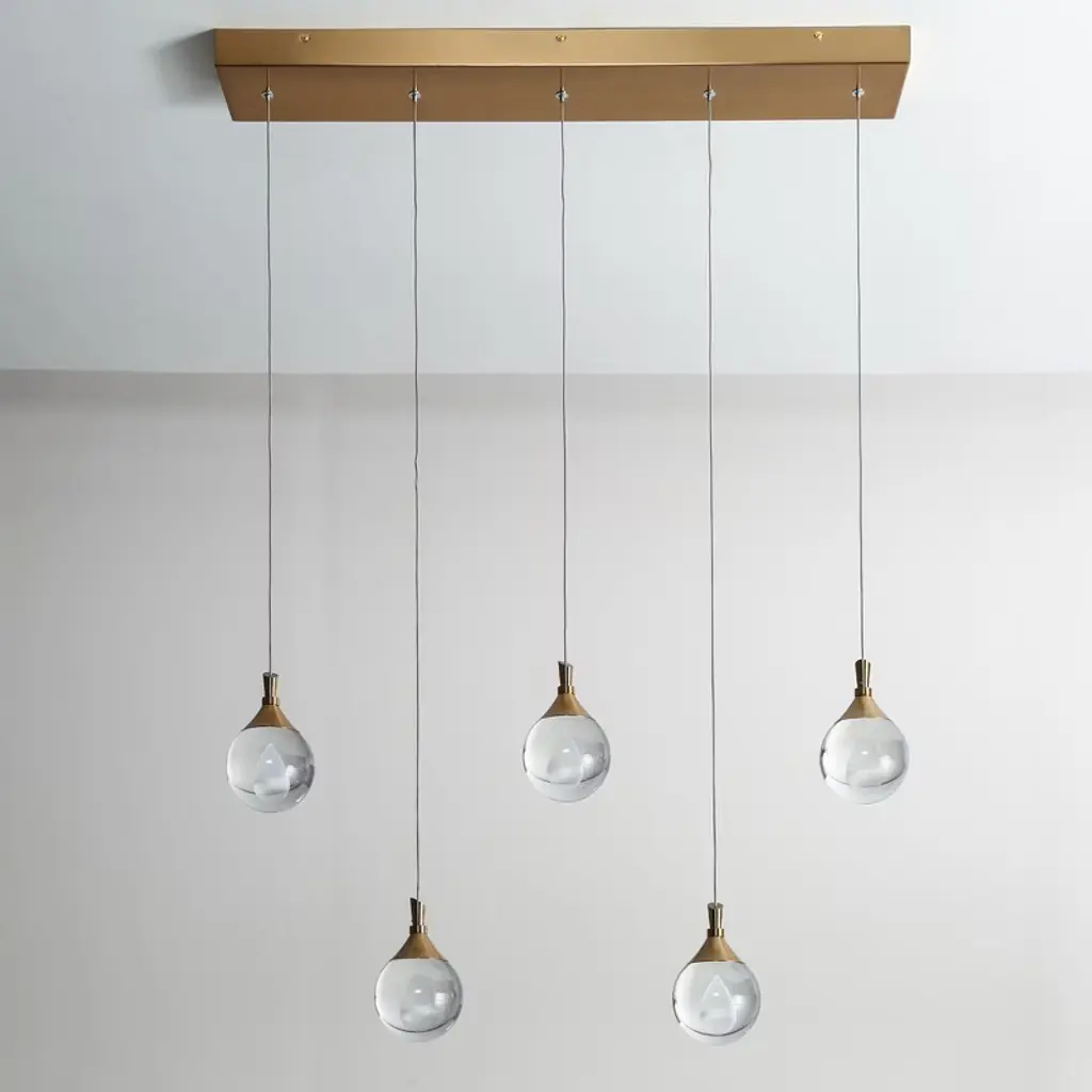 This island light boasts a linear brass finish canopy from which four spherical, clear glass shades with a unique frosted gradient detail are gracefully suspended, creating a luminous and modern ambiance.