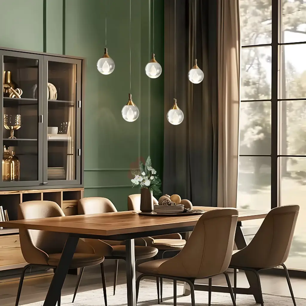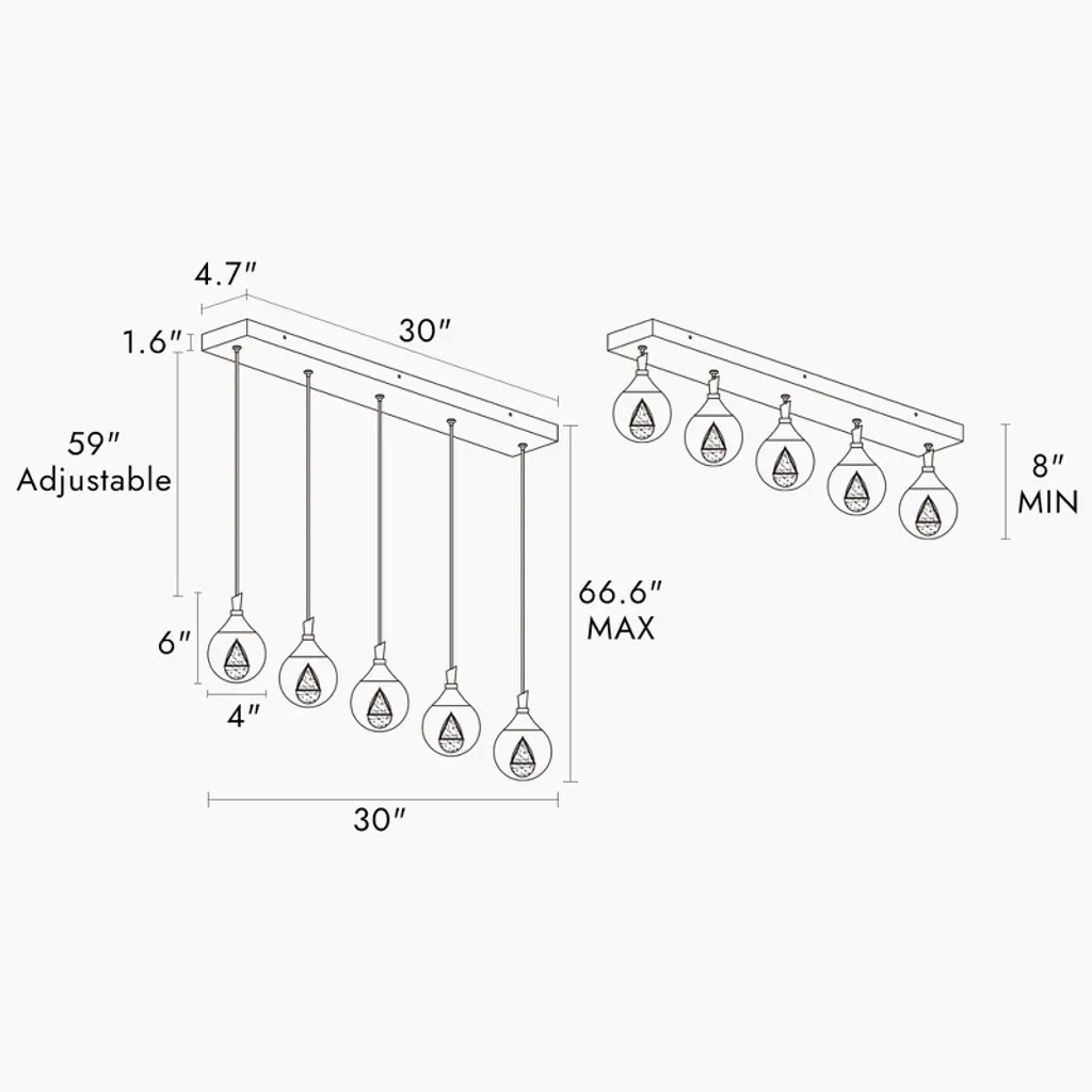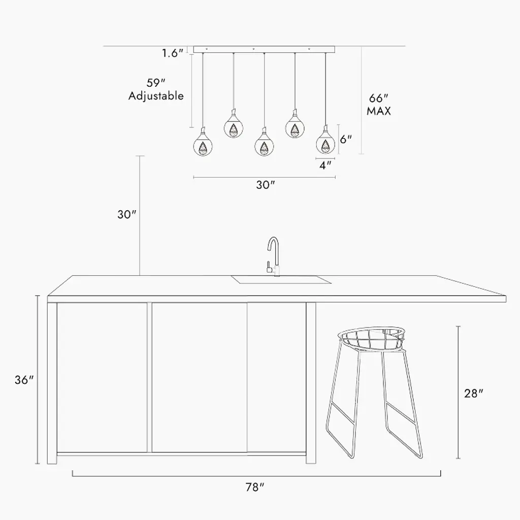 This island light boasts a linear brass finish canopy from which four spherical, clear glass shades with a unique frosted gradient detail are gracefully suspended, creating a luminous and modern ambiance.