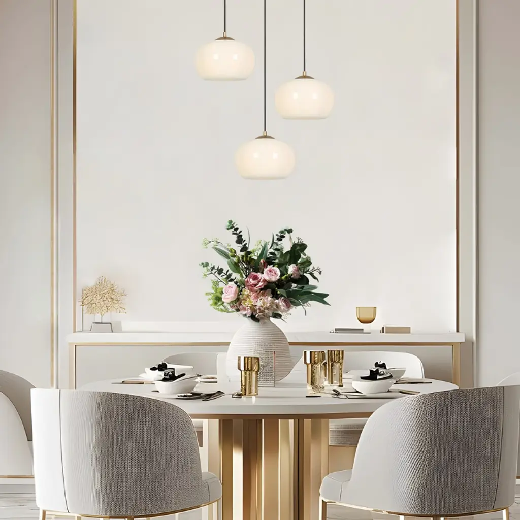 Enhance your living spaces with the LNC Altithara matte gold and white globe pendant light fixture. This modern and innovative fixture boasts a sleek globe design that fits any room. Its clean lines, creative ball shape design, and contemporary style make this white globe glass pendant light a versatile choice for different decor themes. Perfect over a dining table, it sets an elegant mood for family meals. Add a bold touch to your living area with this stylish chandelier, elevating the atmosphere. Wow, guests with its warm light when they enter your home. For a modern bedroom look, this chandelier adds a cozy, chic feel. Its design and matte gold finish blends well with various interior styles, from contemporary to transitional.