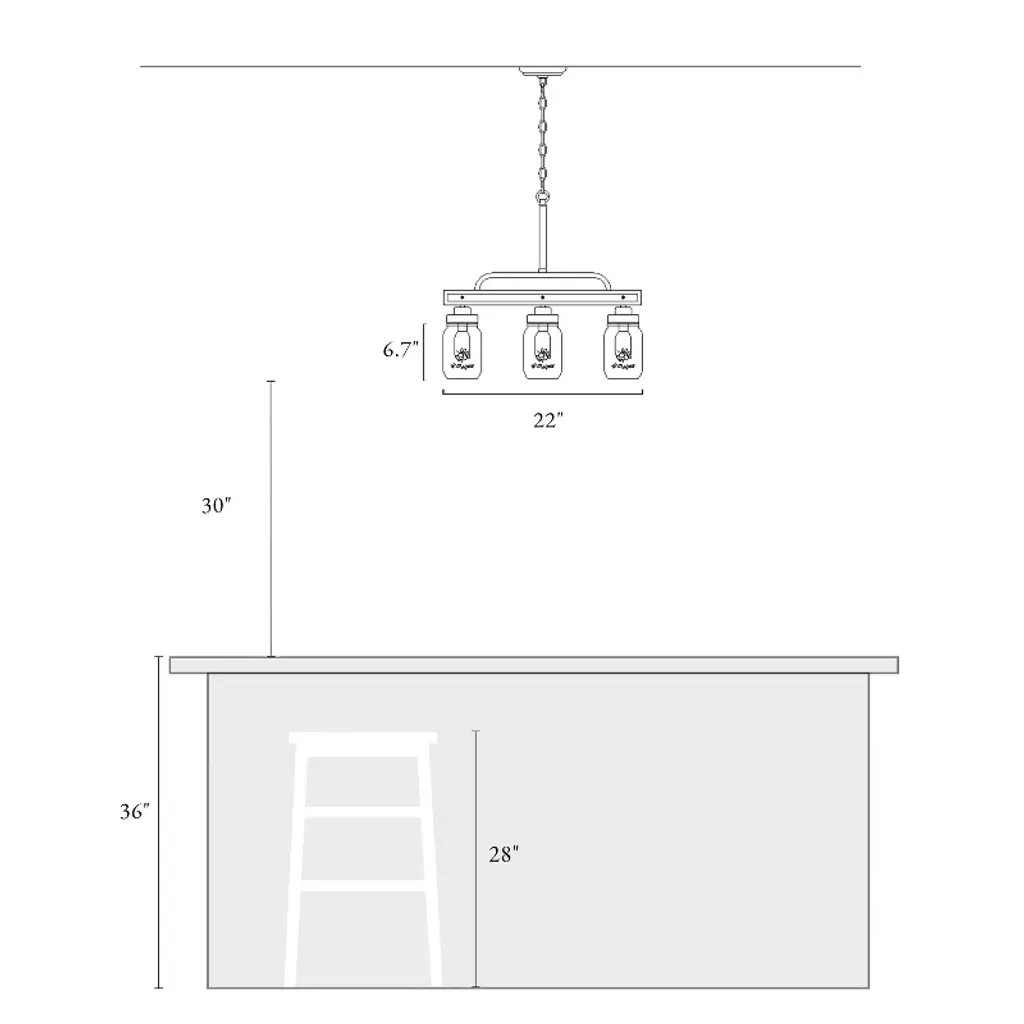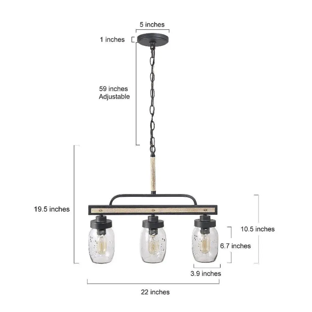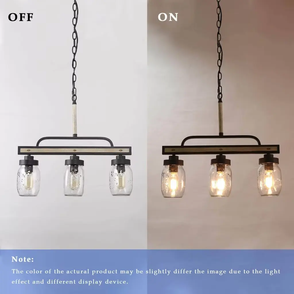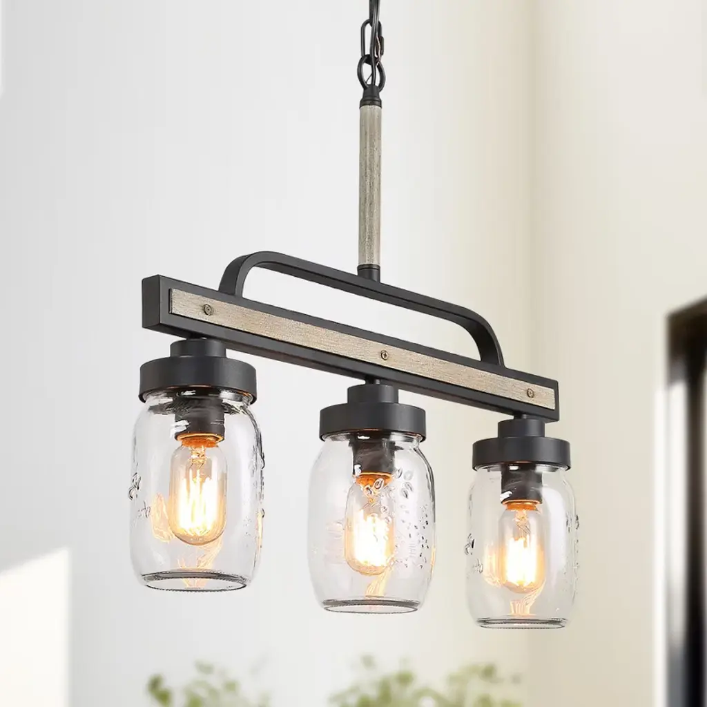 Lnc Aries 3-lights 22" Farmhouse Linear Kitchen Island Pendant Lights, Matte Black And Lights Gray Wood Grain With 3 Clear Mason Jar