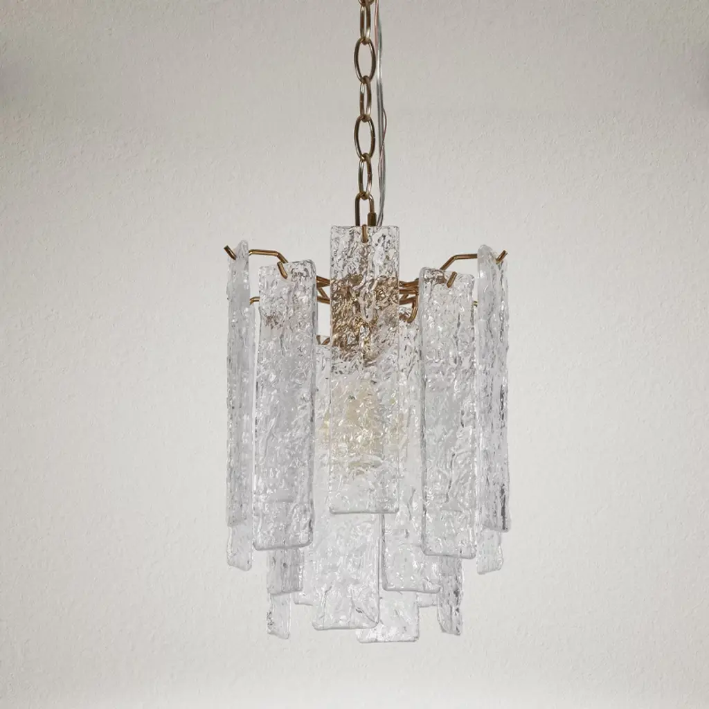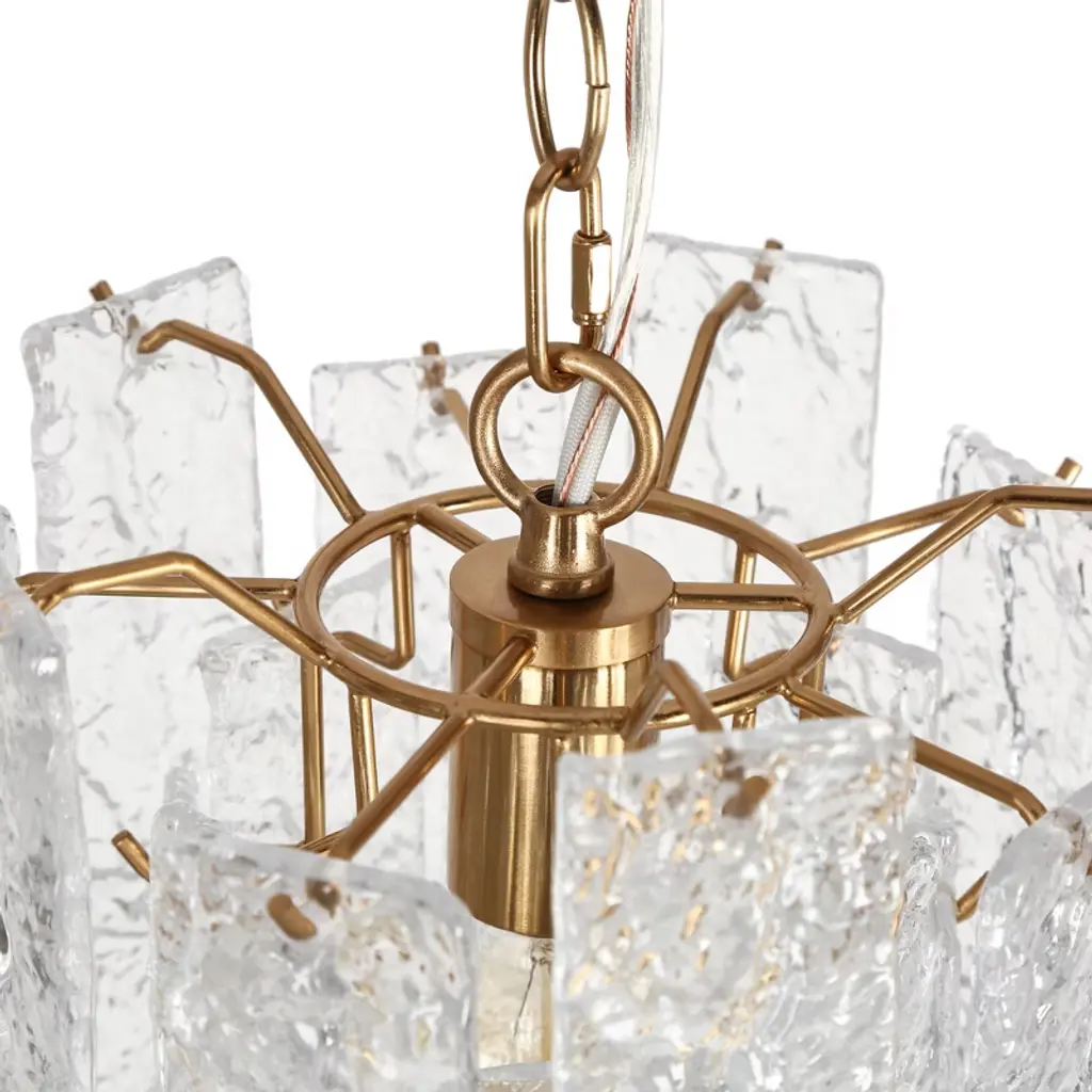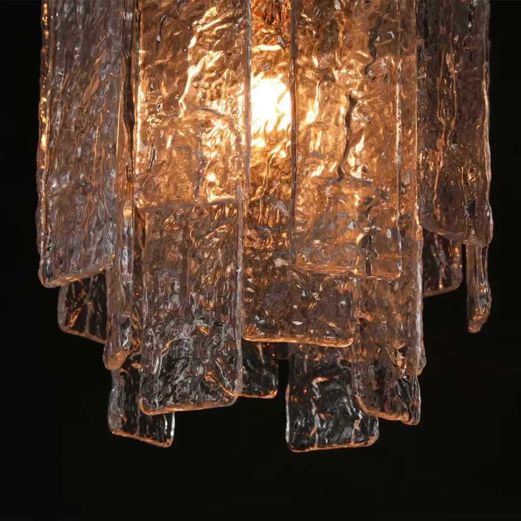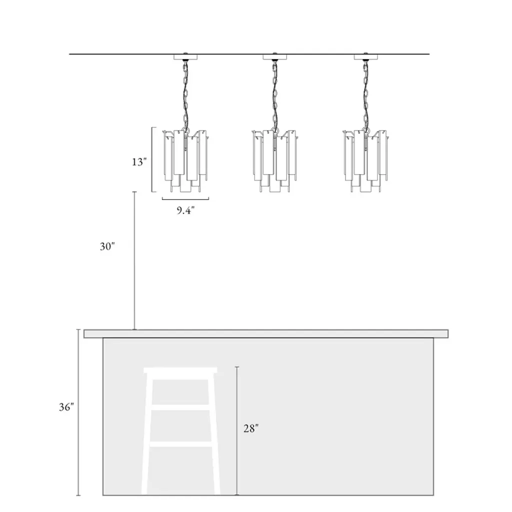 The Engaveric Collection evokes a stunning ice sculpture in crystal, featuring Glacier Crystal Glass panels that capture the essence of frozen beauty. The flat geometric panels of textured glass hang in linear architectural tiers, accented with icicle strip crystal glass that adds a unique touch of elegance. The frosted panes lend the light a soft, diffused glow, while the glittering finishes enhance the overall brilliance. This linear pendant light is perfect for kitchen islands, dining areas, or living rooms, offering a blend of sophistication and functionality. Its sleek design, paired with gold accents, makes it a striking addition to a variety of interior styles.