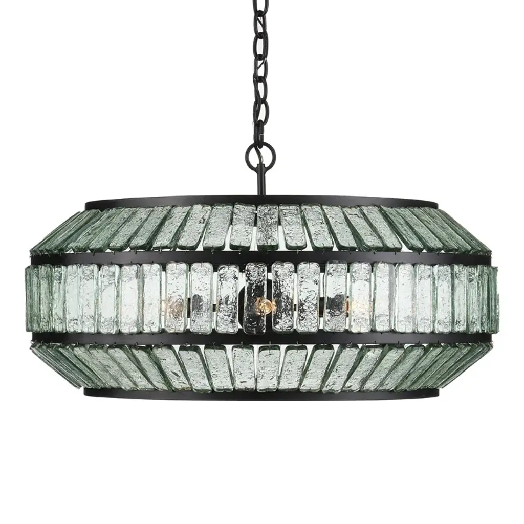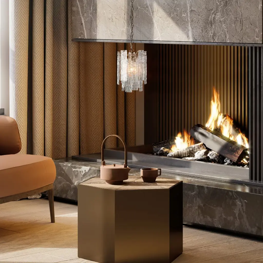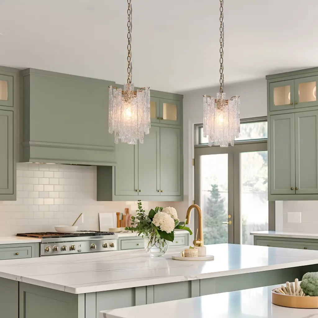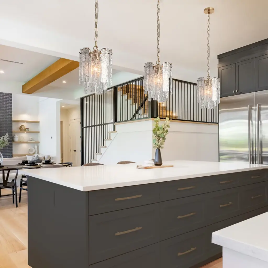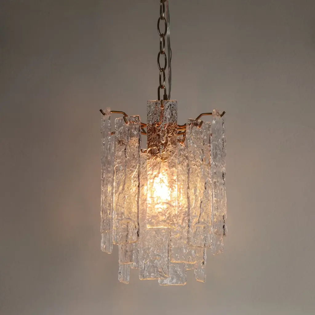 The Engaveric Collection evokes a stunning ice sculpture in crystal, featuring Glacier Crystal Glass panels that capture the essence of frozen beauty. The flat geometric panels of textured glass hang in linear architectural tiers, accented with icicle strip crystal glass that adds a unique touch of elegance. The frosted panes lend the light a soft, diffused glow, while the glittering finishes enhance the overall brilliance. This linear pendant light is perfect for kitchen islands, dining areas, or living rooms, offering a blend of sophistication and functionality. Its sleek design, paired with gold accents, makes it a striking addition to a variety of interior styles.