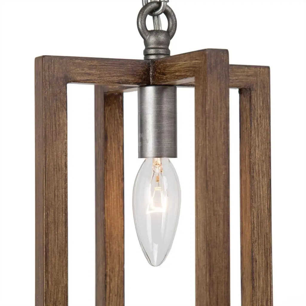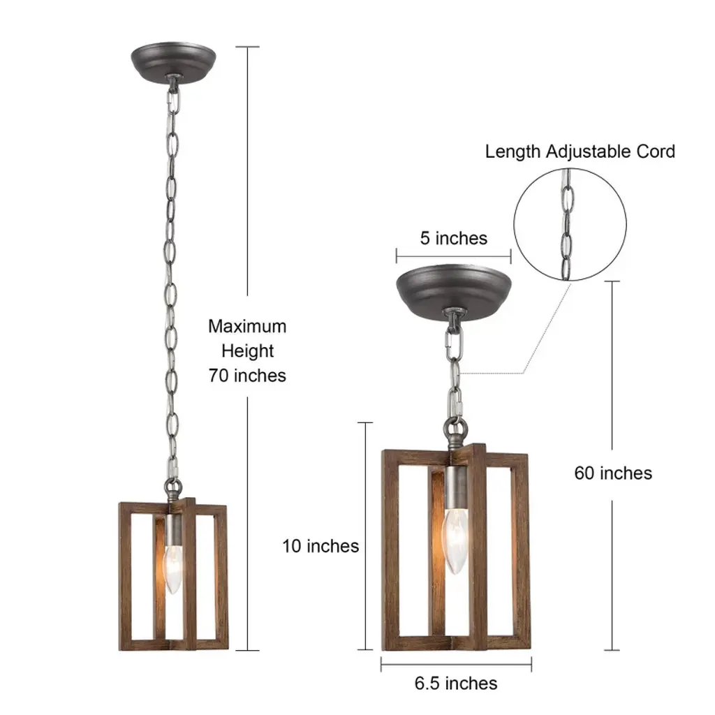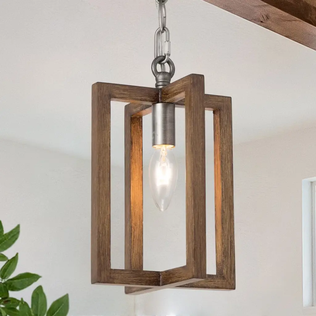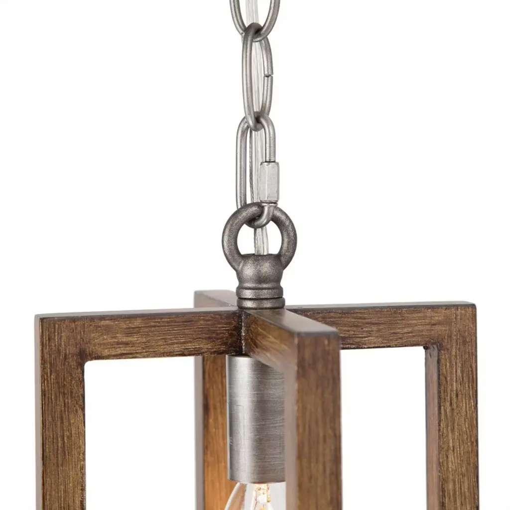Make a good first impression with this gorgeous one-light vintage geometric mini kitchen island pendant lighting fixture. Bringing a sweet dose of rustic and vintage charm, it offers a wood-tone accent by hand-painted and antique brushed silver finish candelabra bulb base. Framed within two square rings to create a strong sense of three-dimensional.
