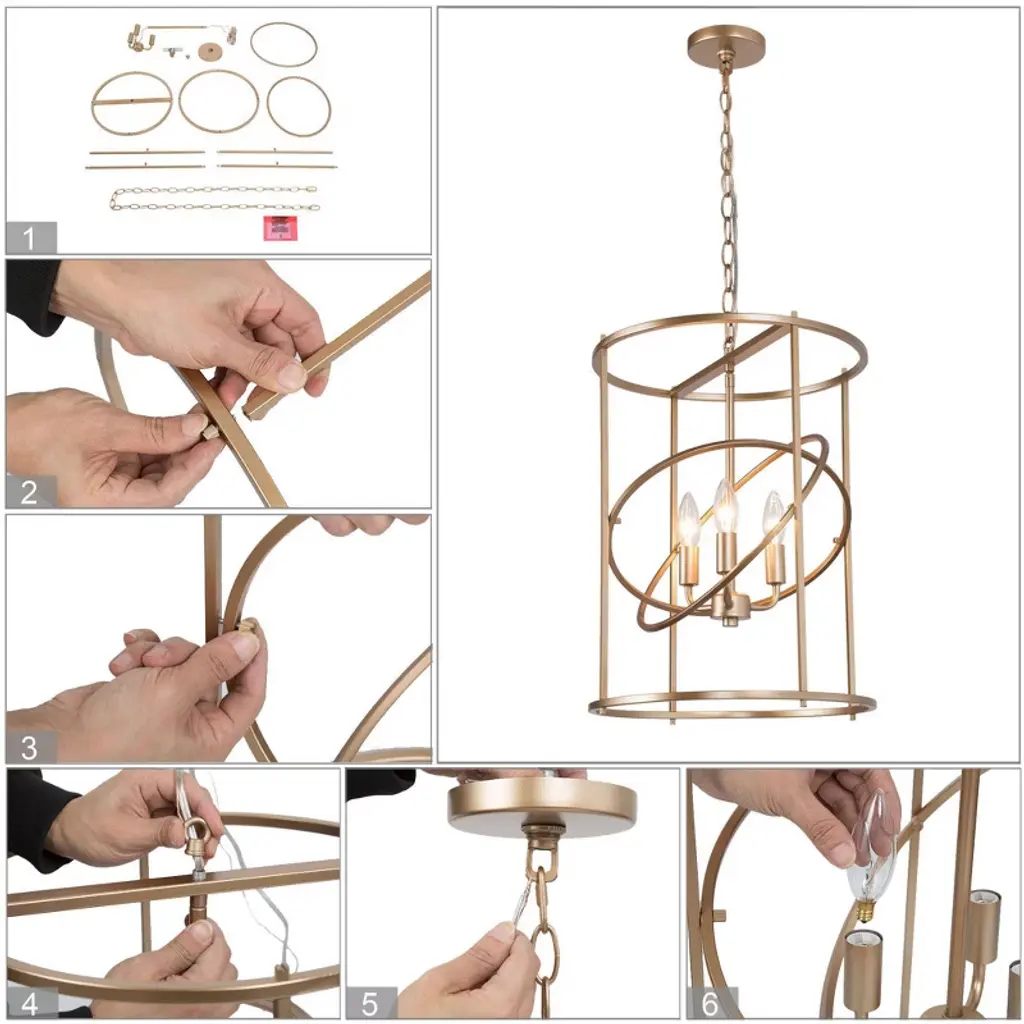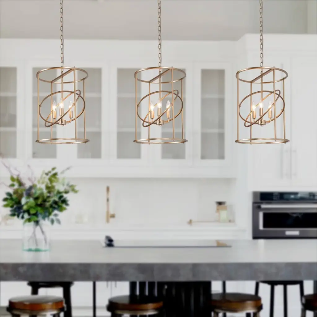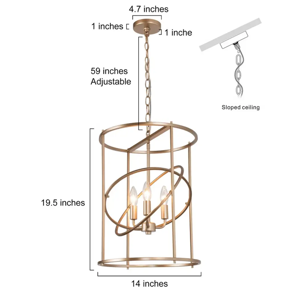 This 3-light modern contemporary gold lantern cage chandelier lighting fixture has a minimalism linear and geometric design, paired with two rounds, reflecting the modern and elegant atmosphere. This modern chandelier light will bring a new look to your home. The combination of straight lines and curves, soft yet modern and simple, is like a distinctive sign in your house. Three candlestick bulbs emit warm light through the hollow lantern cage, forming creative shadows, creating interest for your dining room, kitchen island, foyers, living room, and bedroom.