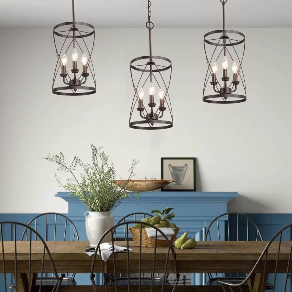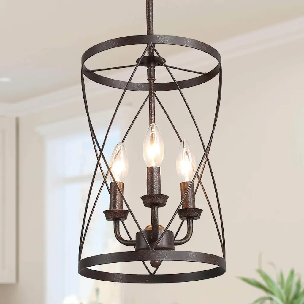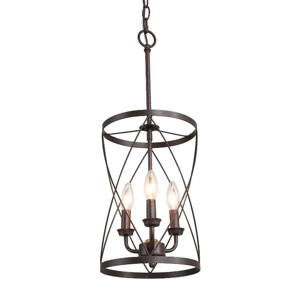 As much a work of art as a lighting fixture, hand-forged solid wrought iron frame with a rustic bronze finish, in a shape reminiscent of a geometric cage with two "X" in the middle to connect the top and bottom, the rustic finish brings you a touch of industrial style in somehow. Elegant waved lines and the geometric crisscrossed form add a breezy touch to any space. Hanging alone in the entryway, foyer, or on the side of your kitchen island table multiples in rows for a retro stylish.