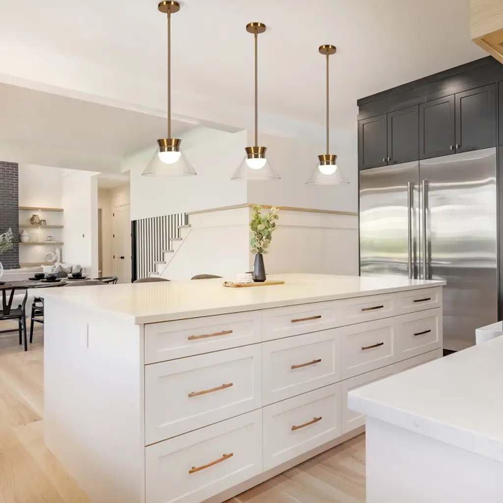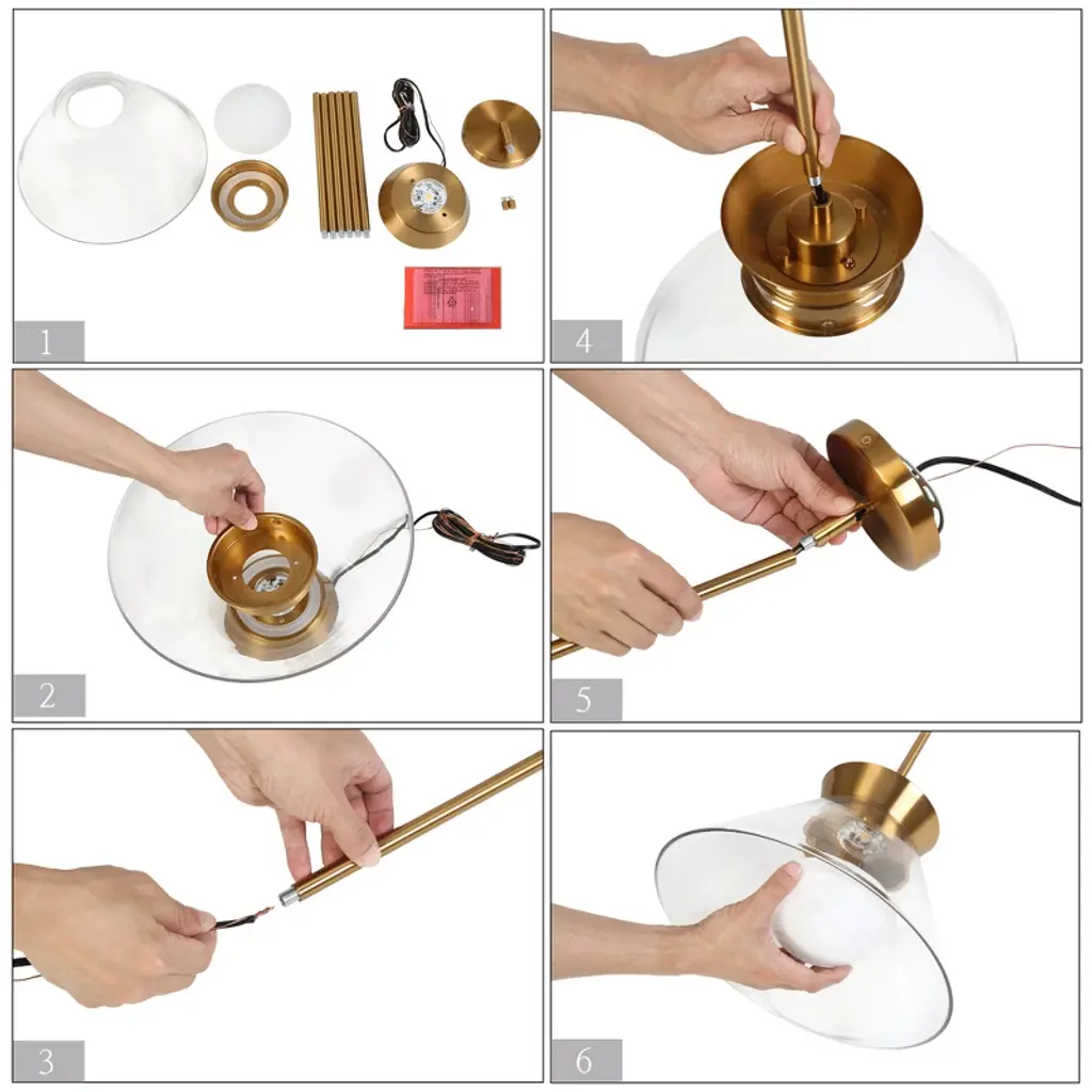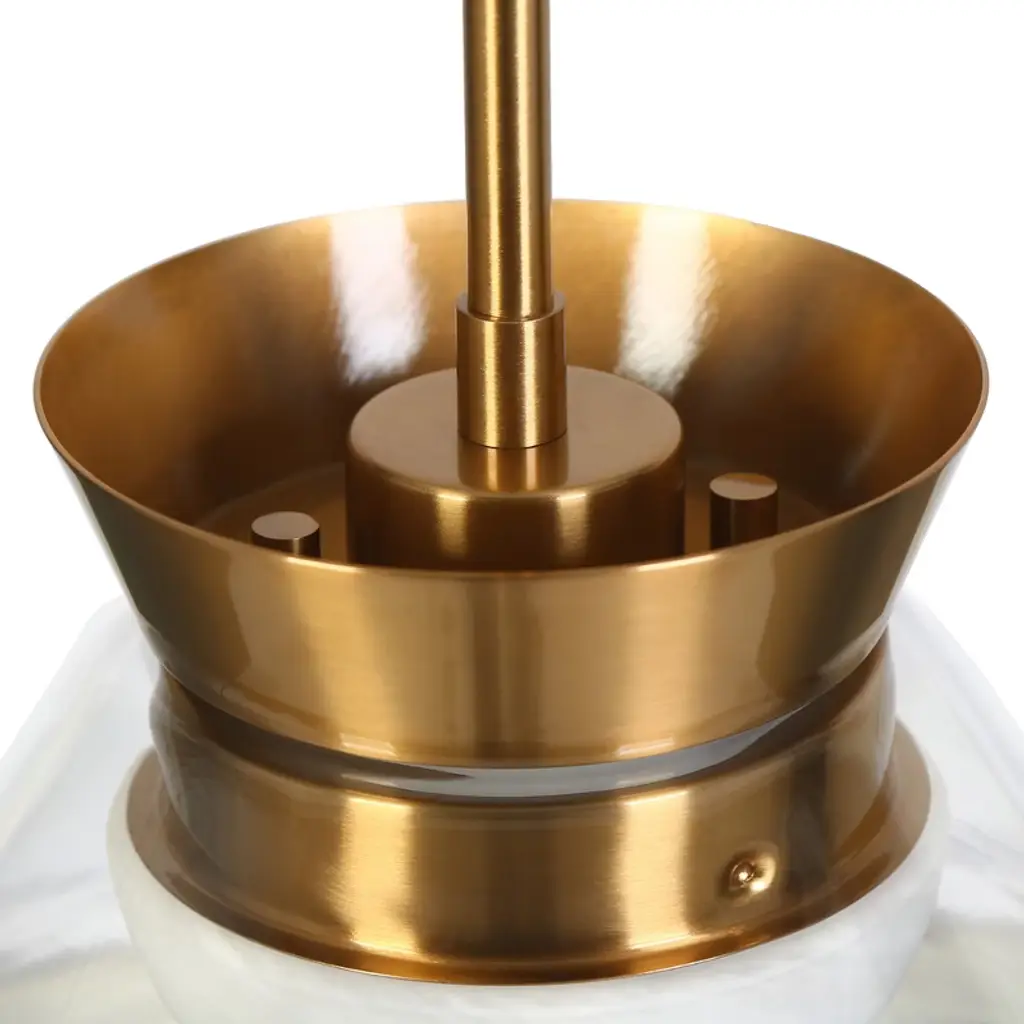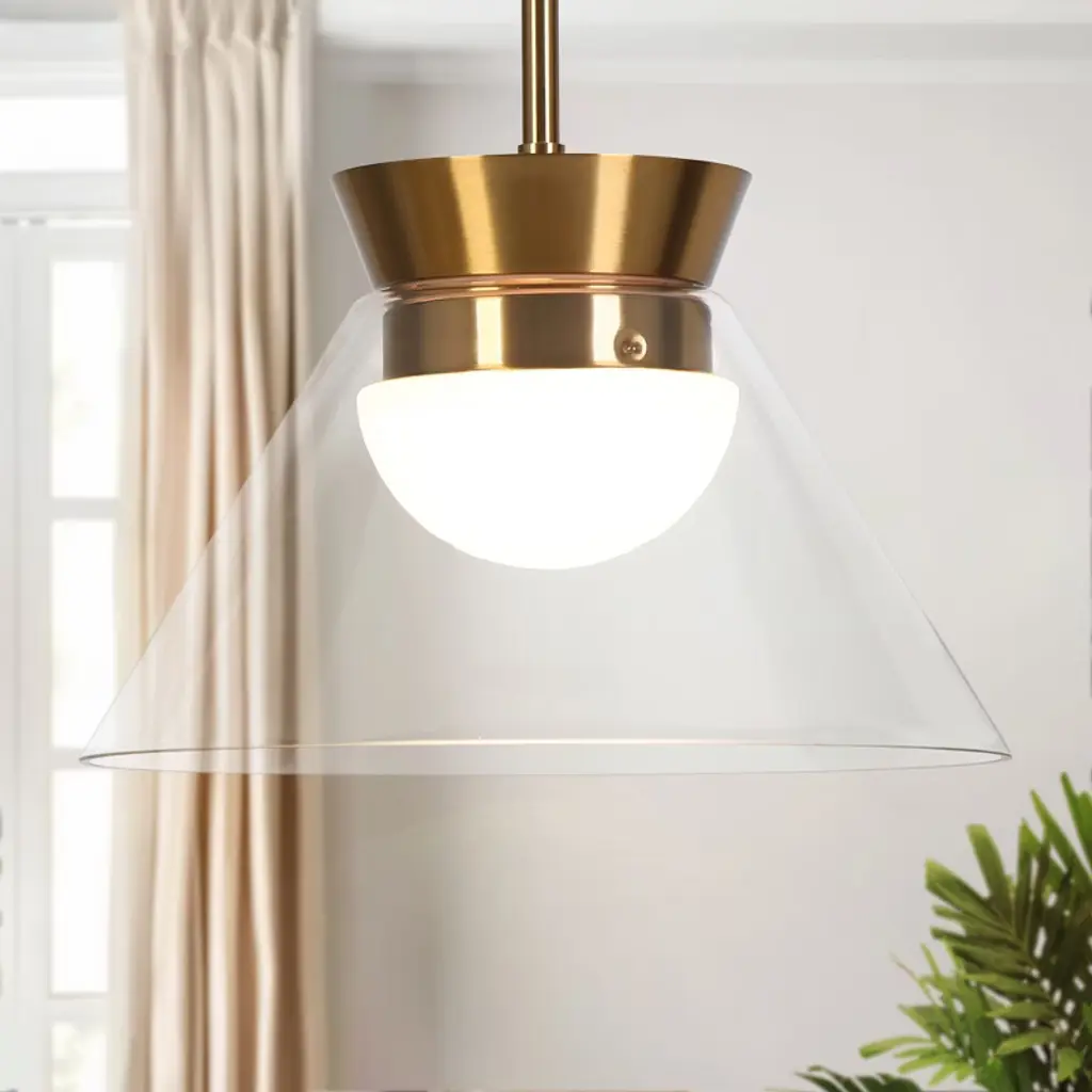 The LNC Luxury Cone Pendant lighting embodies the perfect harmony of modern sophistication and functional elegance. The double-layer design is a striking fusion of Fluorite-like glass and clear glass elements. The inner frosted glass sphere emits a soft, inviting glow, creating a gentle ambient light that enhances the atmosphere of any space. Surrounding the sphere, the clear glass cone offers an elegant contrast, showcasing the light’s clean, minimalist design while allowing for maximum light diffusion. The warm metallic finish on the fixture adds a touch of refined luxury, making it an ideal addition to contemporary interiors. Whether suspended over a kitchen island, dining area, or living space, this gold light fixture exudes a sense of calm sophistication and timeless style.