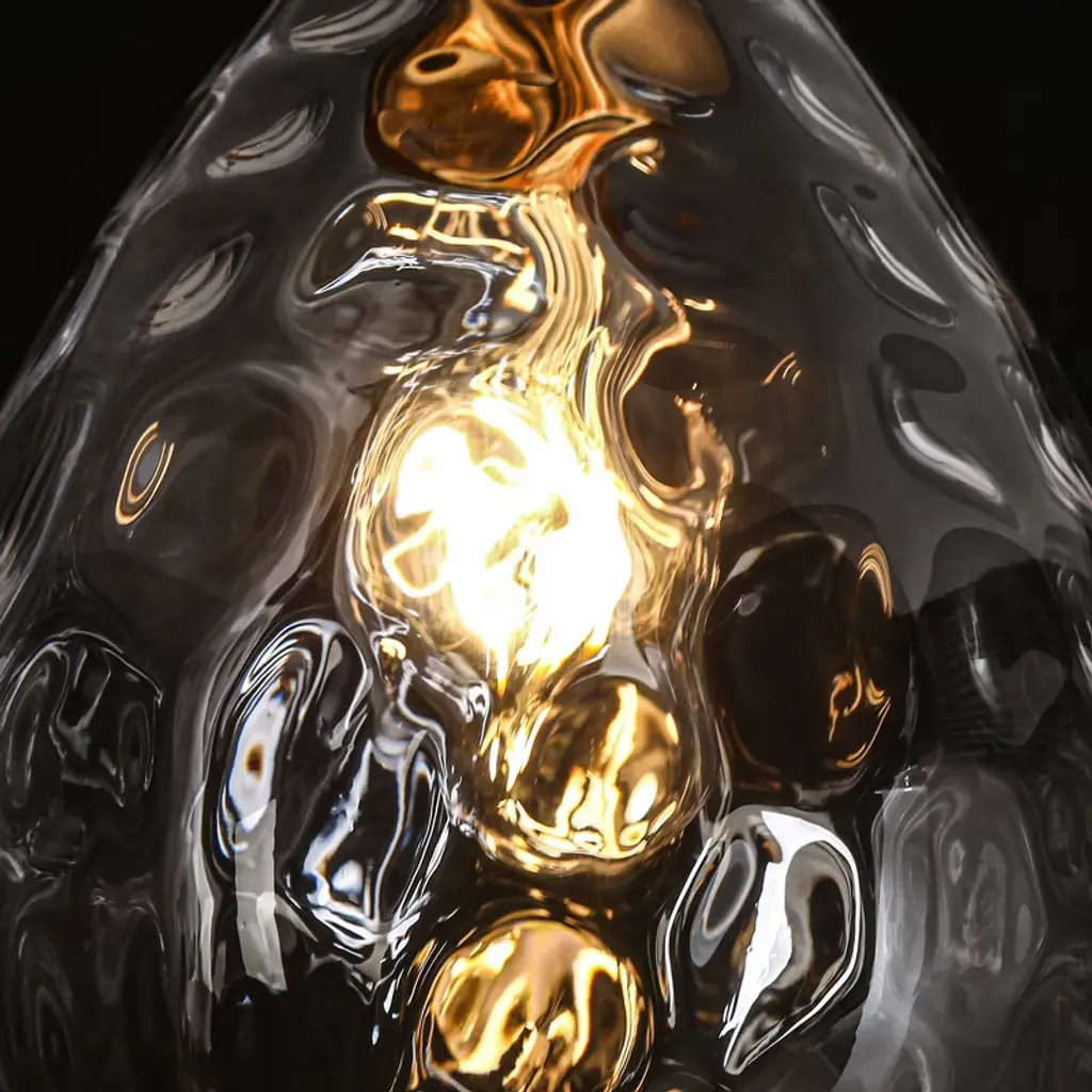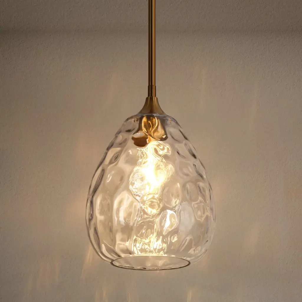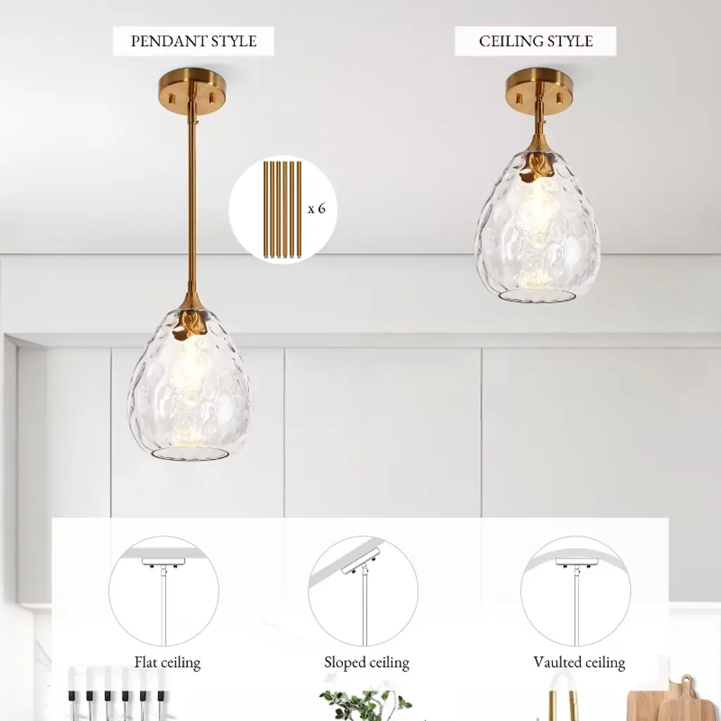 Elegance takes center stage with our singular pendant light, embracing an organic water droplet design. Hanging these pendant as a dual or a trio over your kitchen island. The pendant's silhouette mimics the organic beauty of a gently falling droplet, and the water-ripple texture adds a touch of sophistication to its aesthetic. This unique piece serves as a luminary work of art, casting a soft and enchanting glow that makes any area feel romantic. This elegant 1-light pendant features a glass shade with a smooth, flat exterior that exudes a sleek and modern appeal, while the interior boasts a beautifully textured surface that adds depth and visual interest. And it comes with six 10-in rods for heights adjustment, ideal for rooms with high or low ceilings. Whether you're illuminating your kitchen, or creating an inviting ambiance in your dining room, bedroom or living room, this strikes a perfect balance between beauty and functionality!