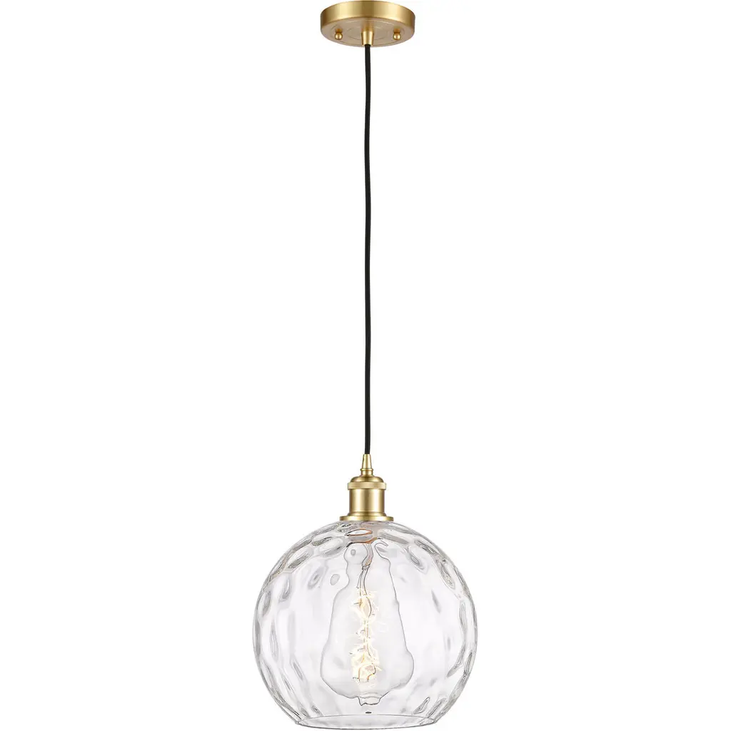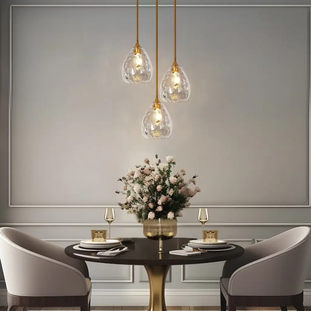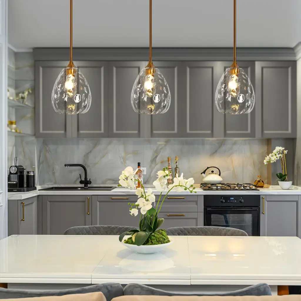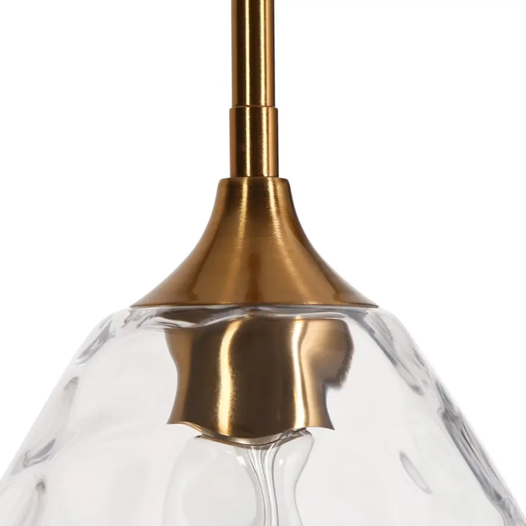 Elegance takes center stage with our singular pendant light, embracing an organic water droplet design. Hanging these pendant as a dual or a trio over your kitchen island. The pendant's silhouette mimics the organic beauty of a gently falling droplet, and the water-ripple texture adds a touch of sophistication to its aesthetic. This unique piece serves as a luminary work of art, casting a soft and enchanting glow that makes any area feel romantic. This elegant 1-light pendant features a glass shade with a smooth, flat exterior that exudes a sleek and modern appeal, while the interior boasts a beautifully textured surface that adds depth and visual interest. And it comes with six 10-in rods for heights adjustment, ideal for rooms with high or low ceilings. Whether you're illuminating your kitchen, or creating an inviting ambiance in your dining room, bedroom or living room, this strikes a perfect balance between beauty and functionality!