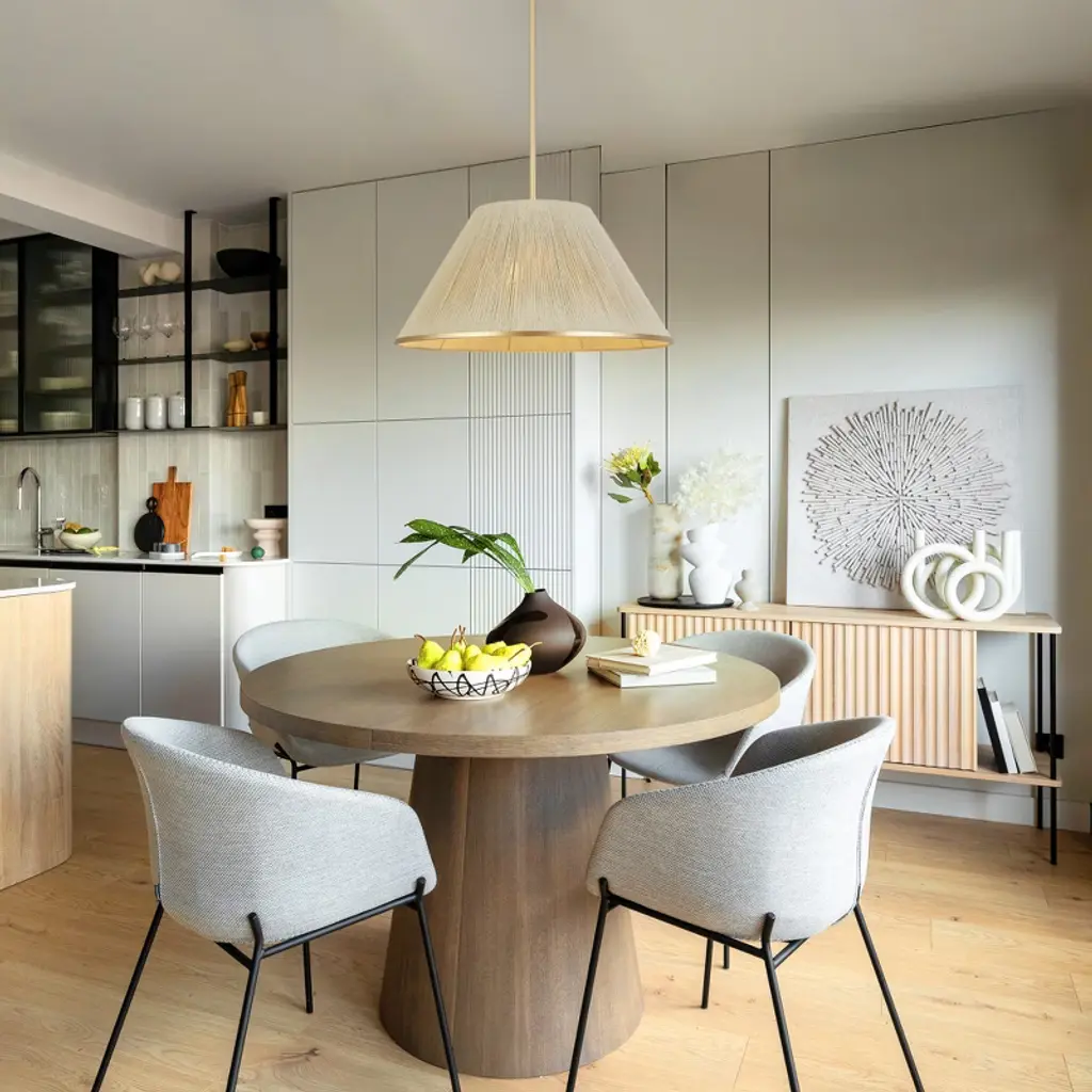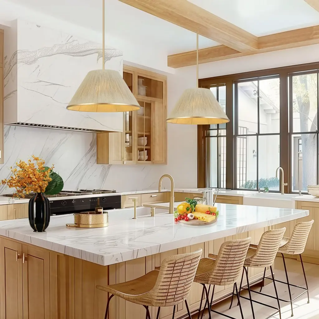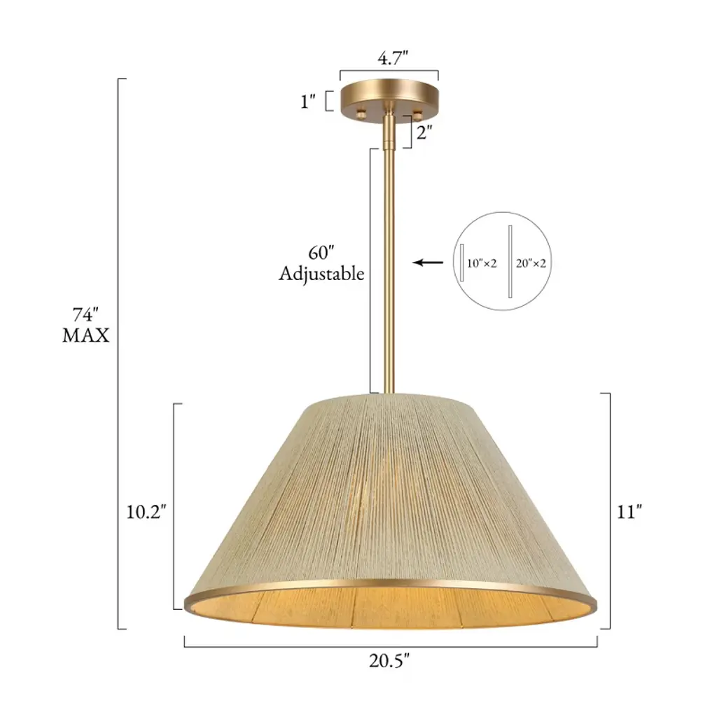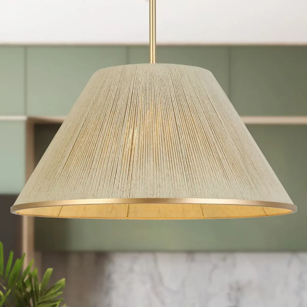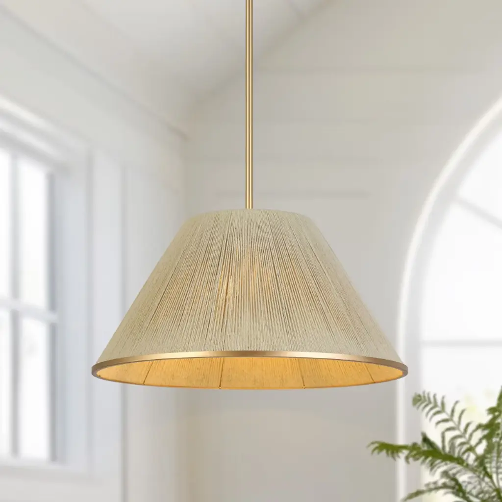 Bring a touch of organic warmth and laid-back elegance to your home with this natural fiber pendant light. Handcrafted with a beige cotton rope shade over a sturdy iron frame, its textured weave filters light softly, creating a cozy and inviting glow. The warm gold hardware adds a refined modern accent, balancing rustic charm with contemporary appeal. Hang it over a dining table, kitchen island, or breakfast nook to transform everyday moments into a calming, stylish retreat.