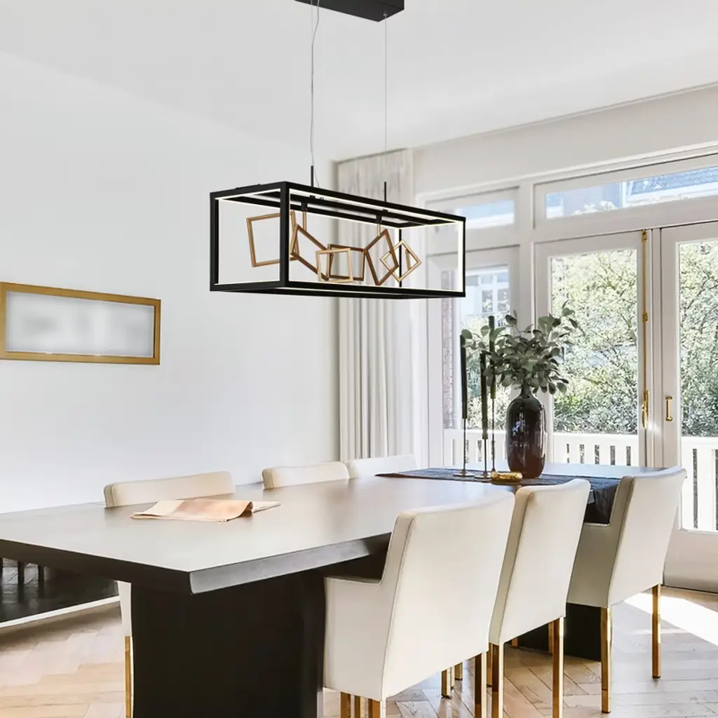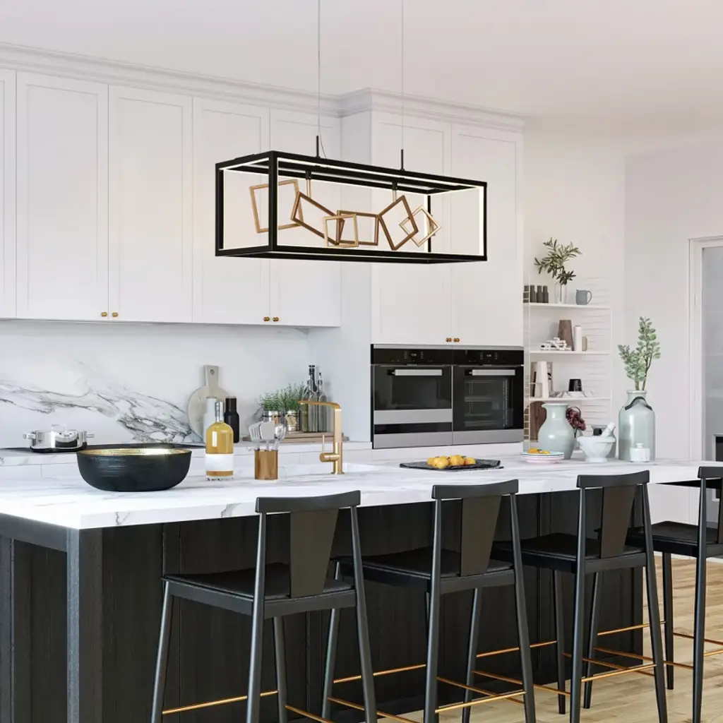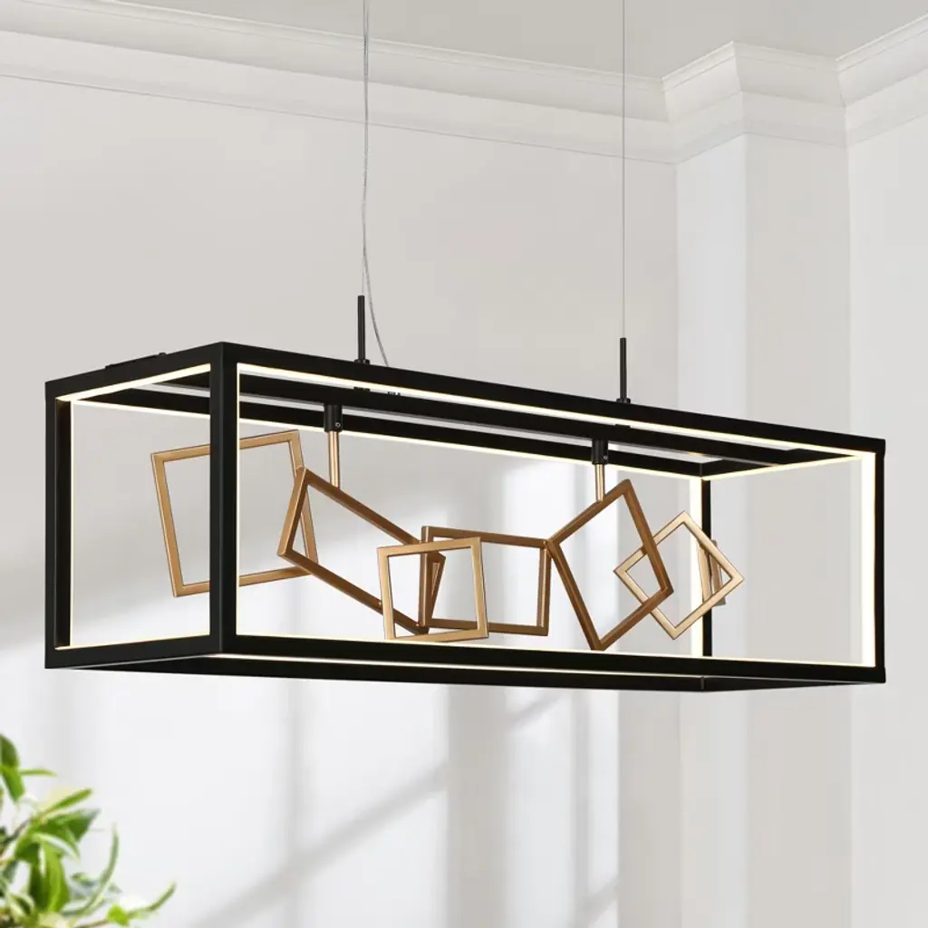 Elevate your kitchen or dining room with our trendsetting LED pendant light black. Featuring a sleek black cuboid frame and striking golden geometry, this fixture epitomizes modern style. With its avant-garde design, it will instantly become the focal point of your space, drawing admiration and compliments from all who enter. Illuminate your home with the captivating charm of the 8-Light Matte Black and Satin Gold Embedded LED Bulb Modern/Contemporary Dry rated Chandelier, and stay ahead of the curve in abstract fashion.