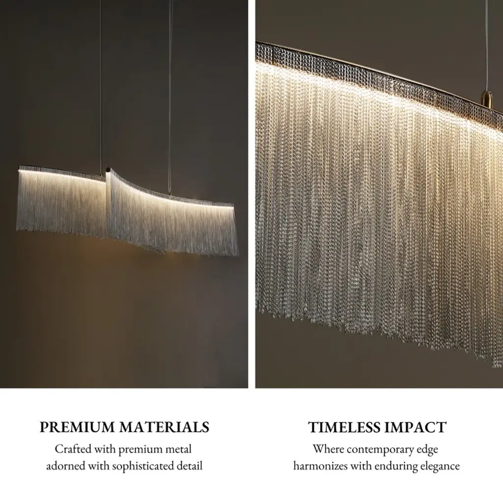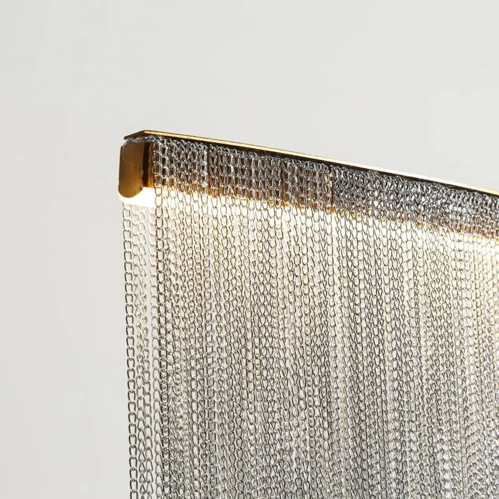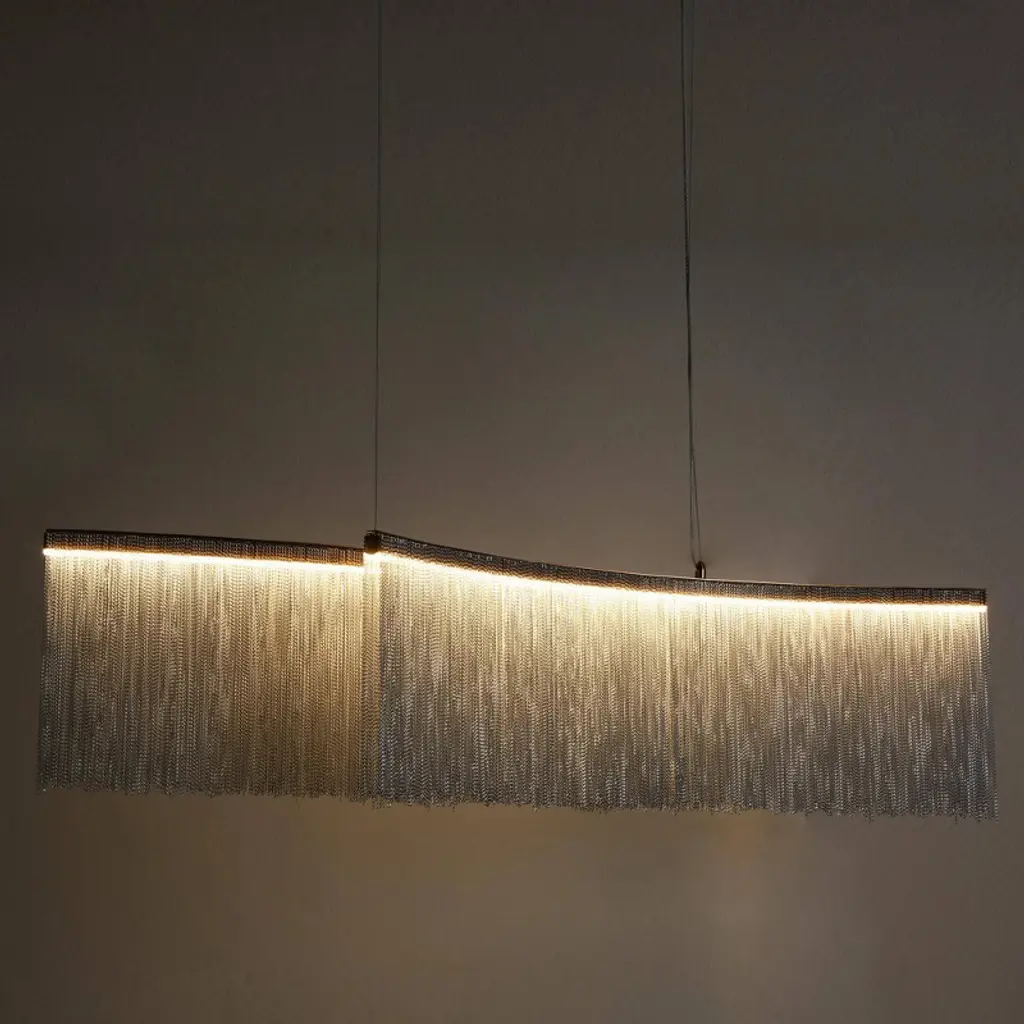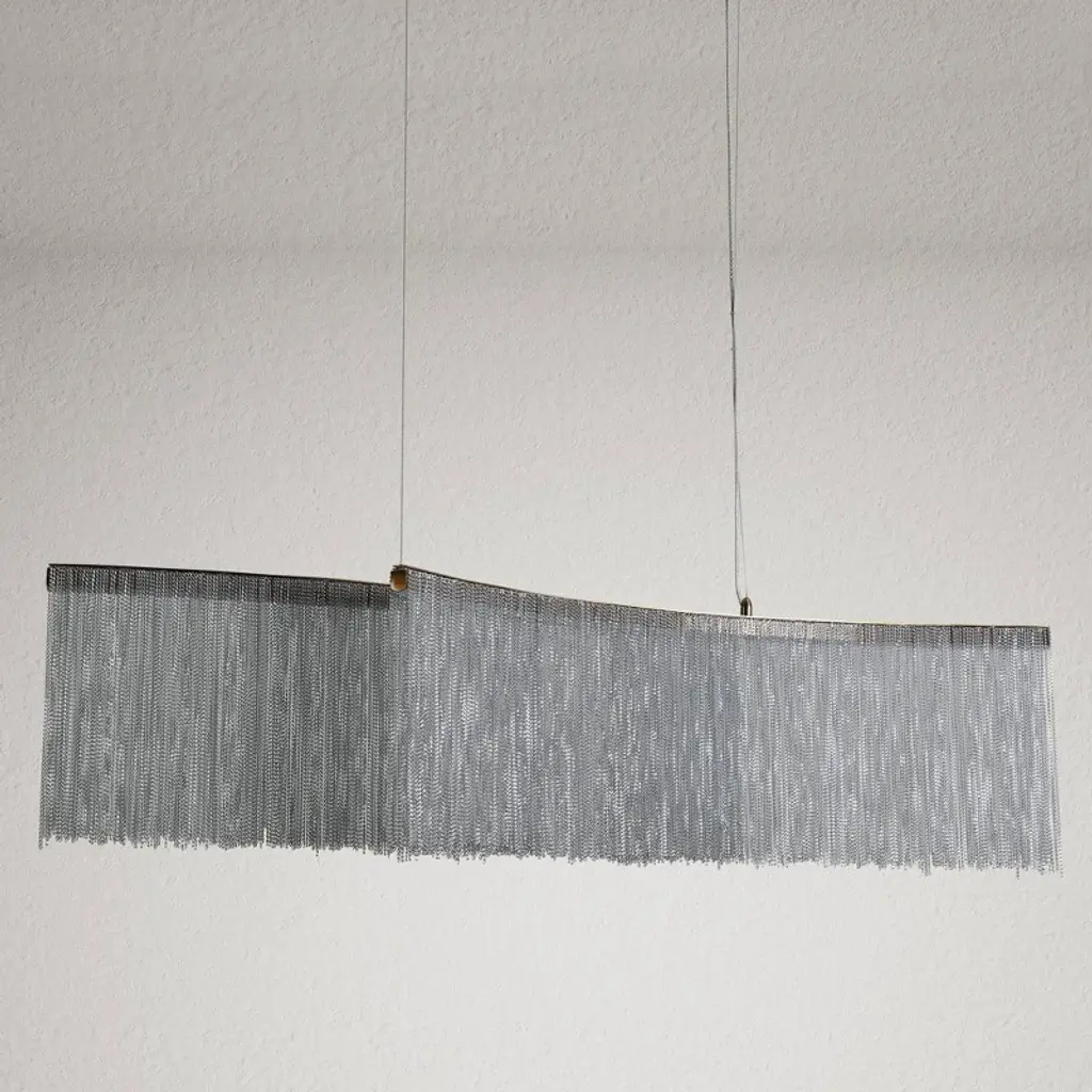 Elevate your space with the captivating allure of this large hanging light, where finely crafted silver metal chains converge in a breathtaking light display. Inspired by the beauty of rainfall frozen in time, hundreds of slender metal rods are suspended from a sleek canopy, casting a mesmerizing refractive glow that creates a dramatic effect. This chandelier sets an unforgettable ambiance, captivating guests and adds a touch of modern luxury to any room. Perfect for upscale environments such as hotel lobbies, beauty salons, and refined homes, the chrome chandelier is the ultimate statement piece.