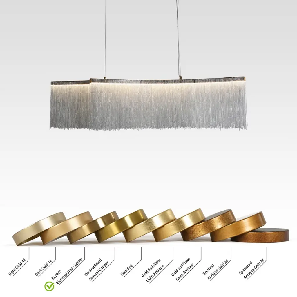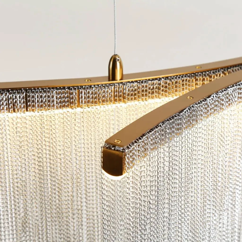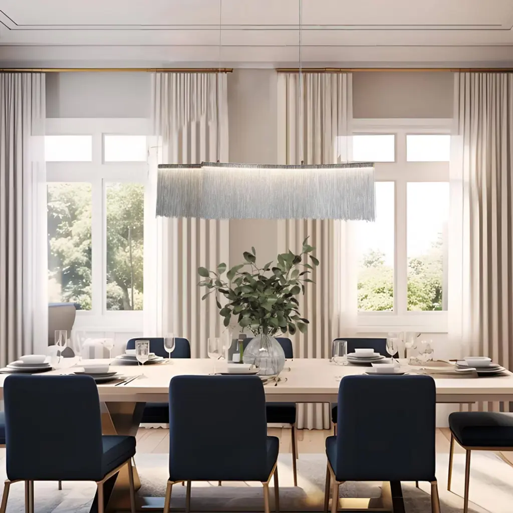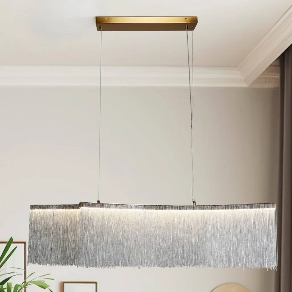 Elevate your space with the captivating allure of this large hanging light, where finely crafted silver metal chains converge in a breathtaking light display. Inspired by the beauty of rainfall frozen in time, hundreds of slender metal rods are suspended from a sleek canopy, casting a mesmerizing refractive glow that creates a dramatic effect. This chandelier sets an unforgettable ambiance, captivating guests and adds a touch of modern luxury to any room. Perfect for upscale environments such as hotel lobbies, beauty salons, and refined homes, the chrome chandelier is the ultimate statement piece.