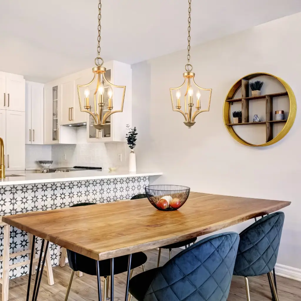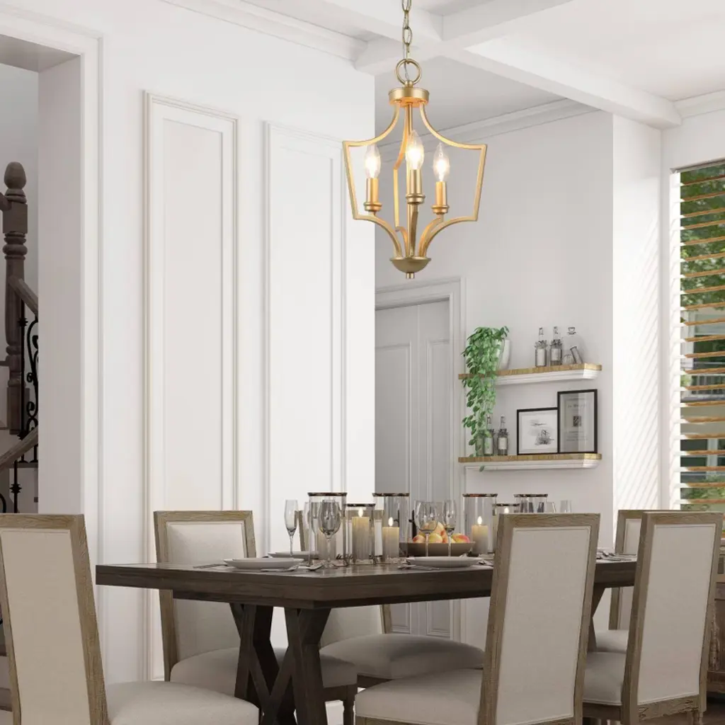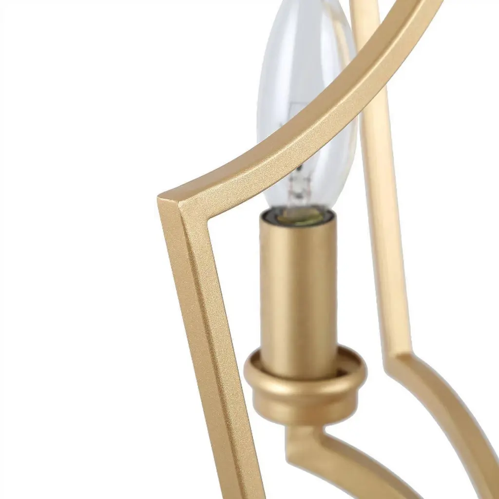 Illuminate your space with the minimalist LNC Stereo 3-light matte gold modern geometric pendant lighting. This striking small pendant light features a matte gold finish, and a sleek geometrical frame, not only designed as artistic and elegant in its bow knot inspiration design but with three elaborate candlestick clusters for a maximum ambiance to your home space. This modern gold pendant light with European retro and modern light luxury styles is perfect for adding a touch of elegance to any room. Whether used at your bedside in the living room, over the round dining table, kitchen island, or foyer, this minimalist pendant light creates a sophisticated ambiance with a stylish, contemporary twist. Ideal for high ceilings and open spaces, its versatile design complements various decor styles.