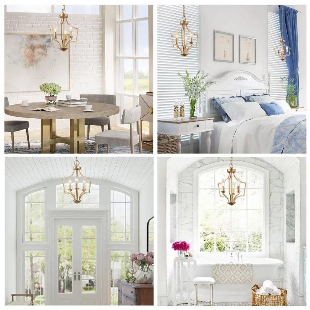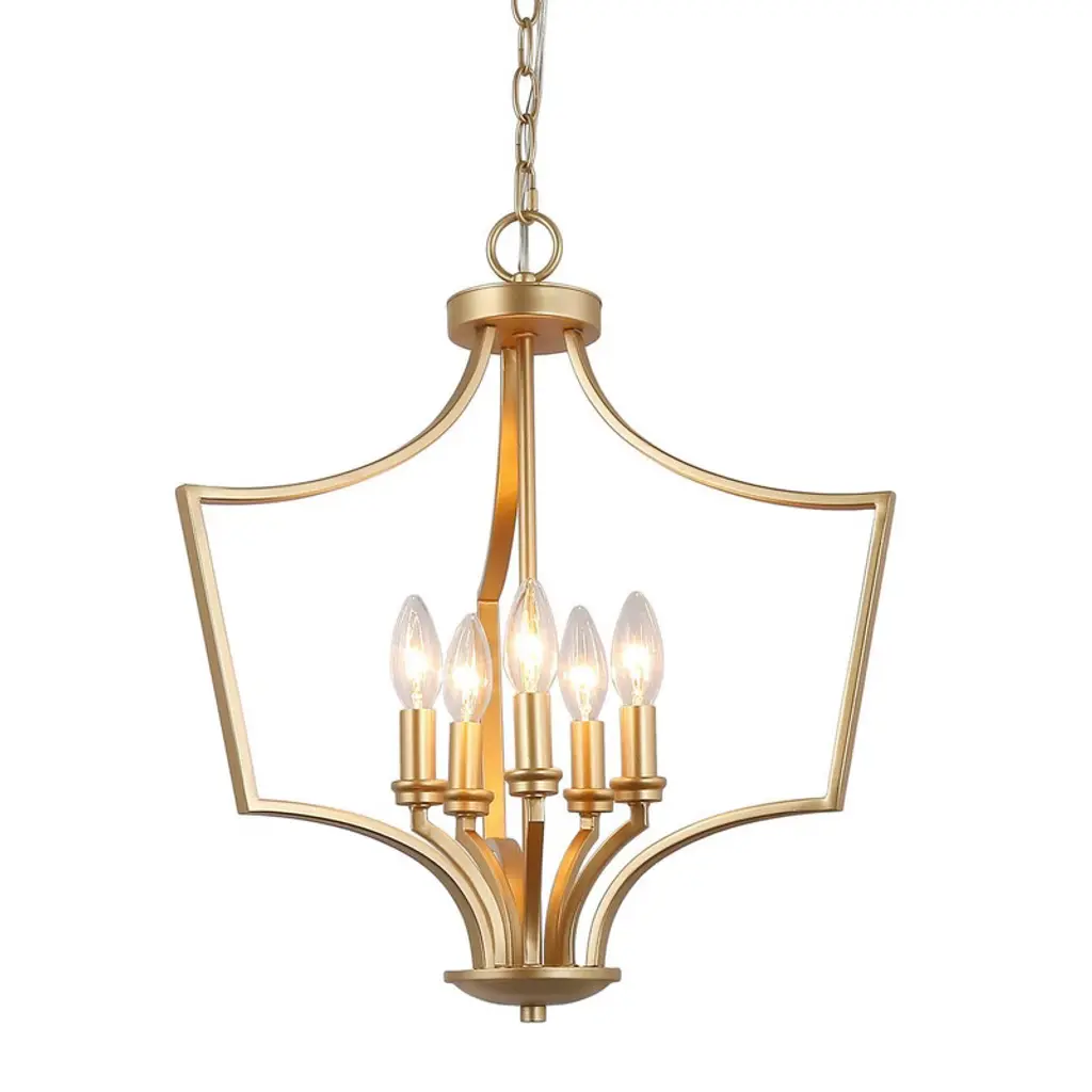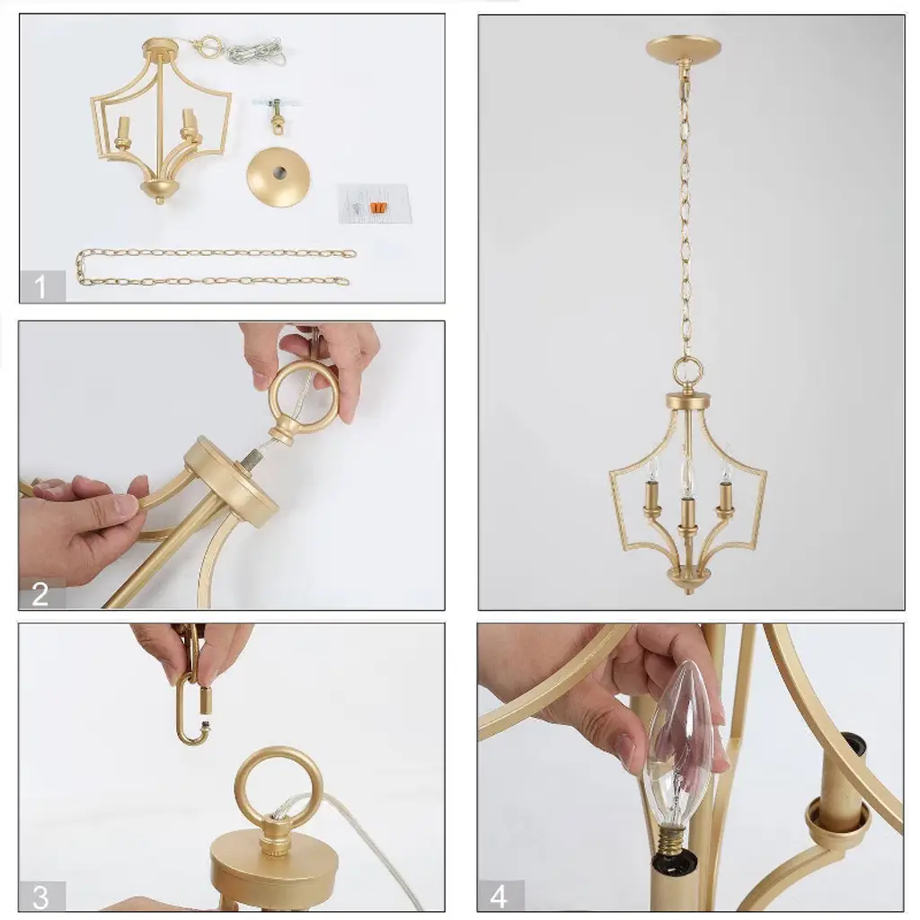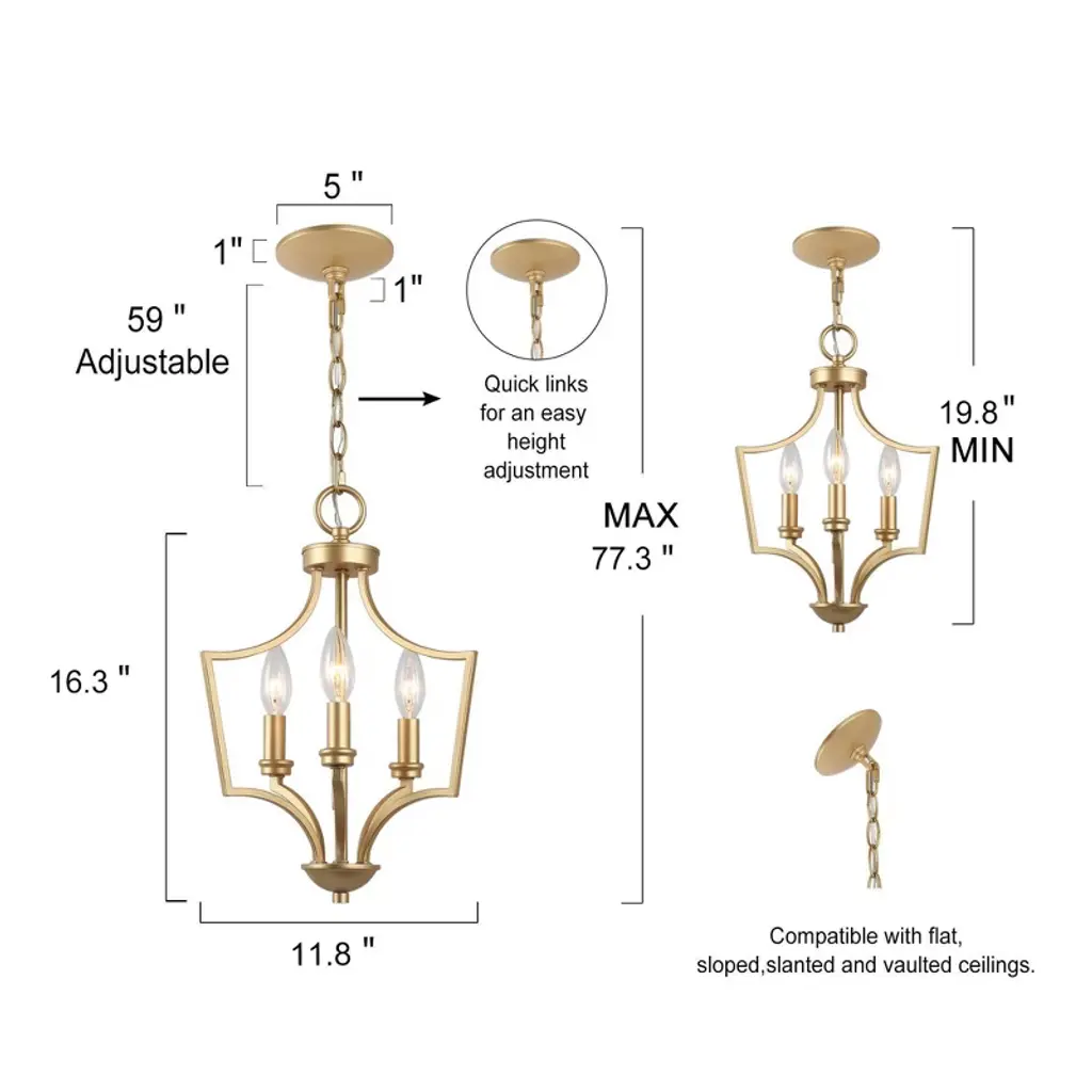 Illuminate your space with the minimalist LNC Stereo 3-light matte gold modern geometric pendant lighting. This striking small pendant light features a matte gold finish, and a sleek geometrical frame, not only designed as artistic and elegant in its bow knot inspiration design but with three elaborate candlestick clusters for a maximum ambiance to your home space. This modern gold pendant light with European retro and modern light luxury styles is perfect for adding a touch of elegance to any room. Whether used at your bedside in the living room, over the round dining table, kitchen island, or foyer, this minimalist pendant light creates a sophisticated ambiance with a stylish, contemporary twist. Ideal for high ceilings and open spaces, its versatile design complements various decor styles.