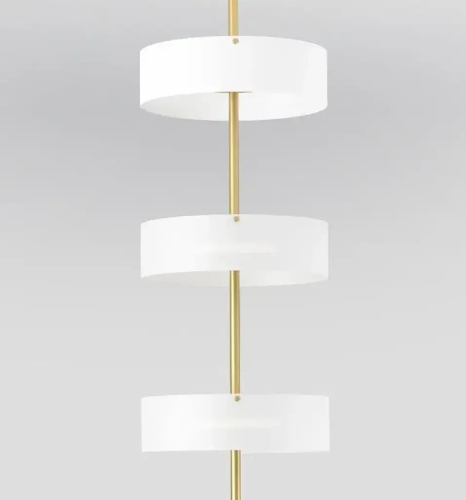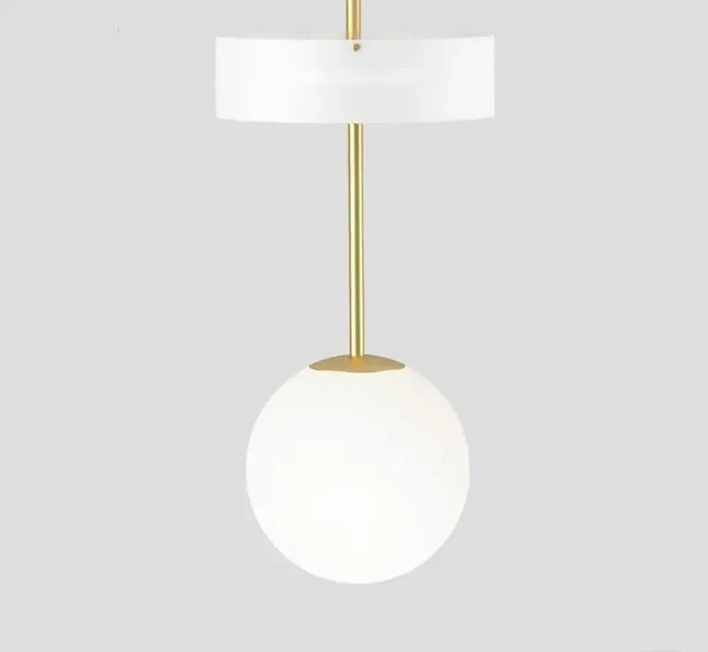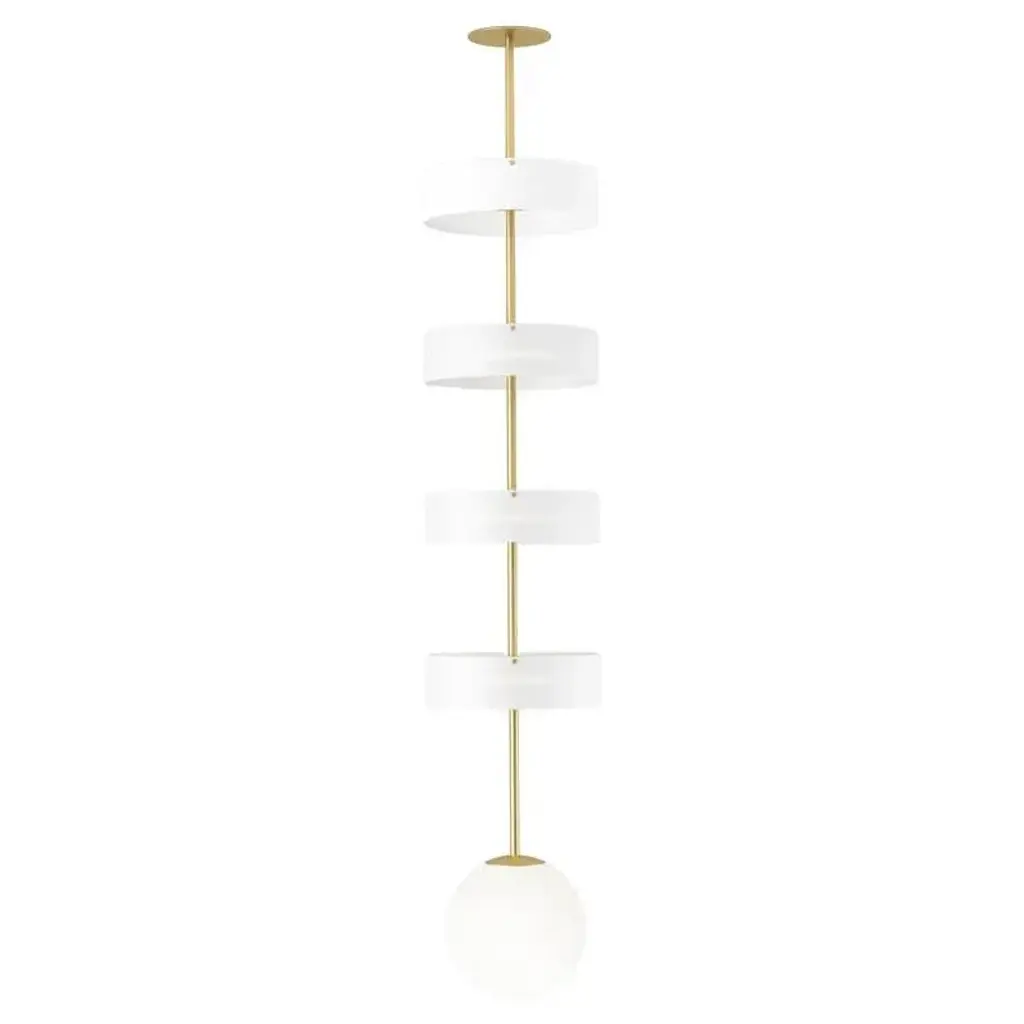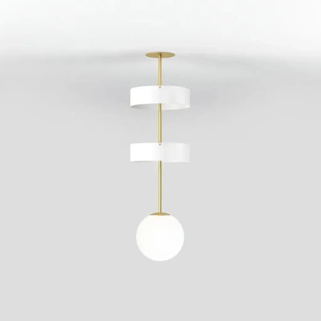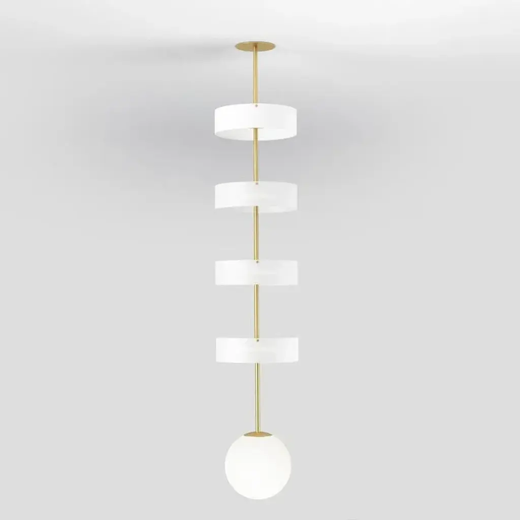 Long circles and globe pendant light by atelier areti dimensions: d 25 x w 25 x h 141.5 cm. Materials: brushed brass, white acrylic panels. Available in white, black, or brass. Available in long or short versions. All our lamps can be wired according to each country. If sold to the usa it will be wired for the usa for instance. up to 250v (europe/uk standard).