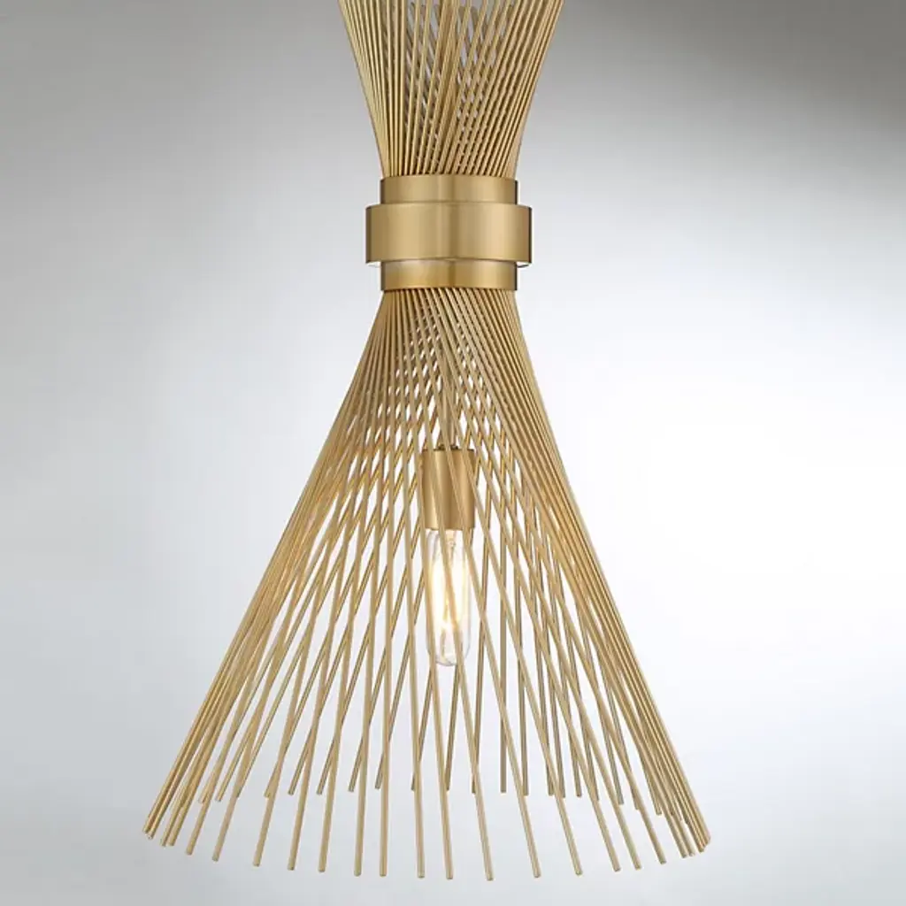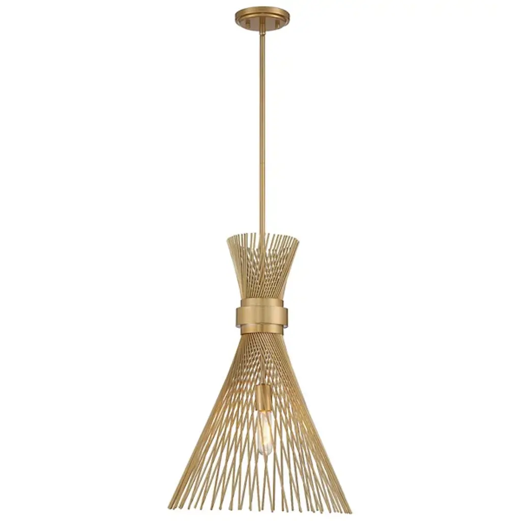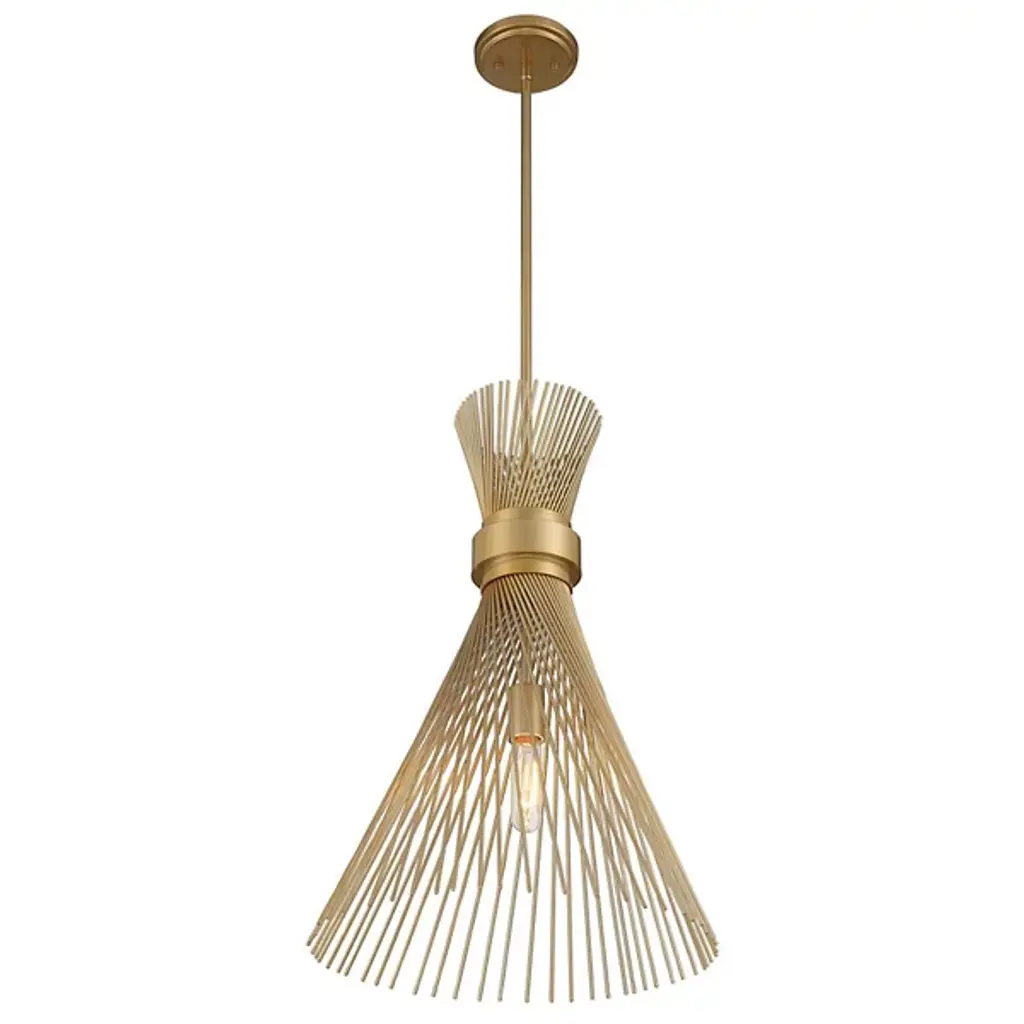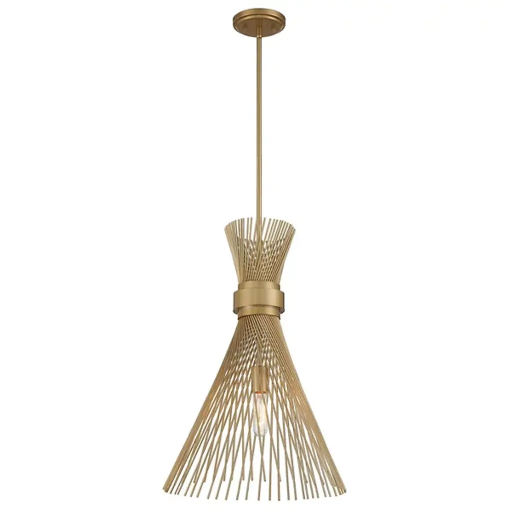 The Longfellow Pendant from Savoy House presents an intricate transitional style with its captivating design. Metal rods form the fixture’s shade, converging around a central downrod and splaying outward, forming an offset hourglass shape. When illuminated, inner lamping emits a dramatic glow that captures attention, enhancing any space with its elegant presence. The pendant is finished in Burnished Brass and marries fashionable aesthetics with functional brilliance, making it a subtle, artistic addition to interiors.
