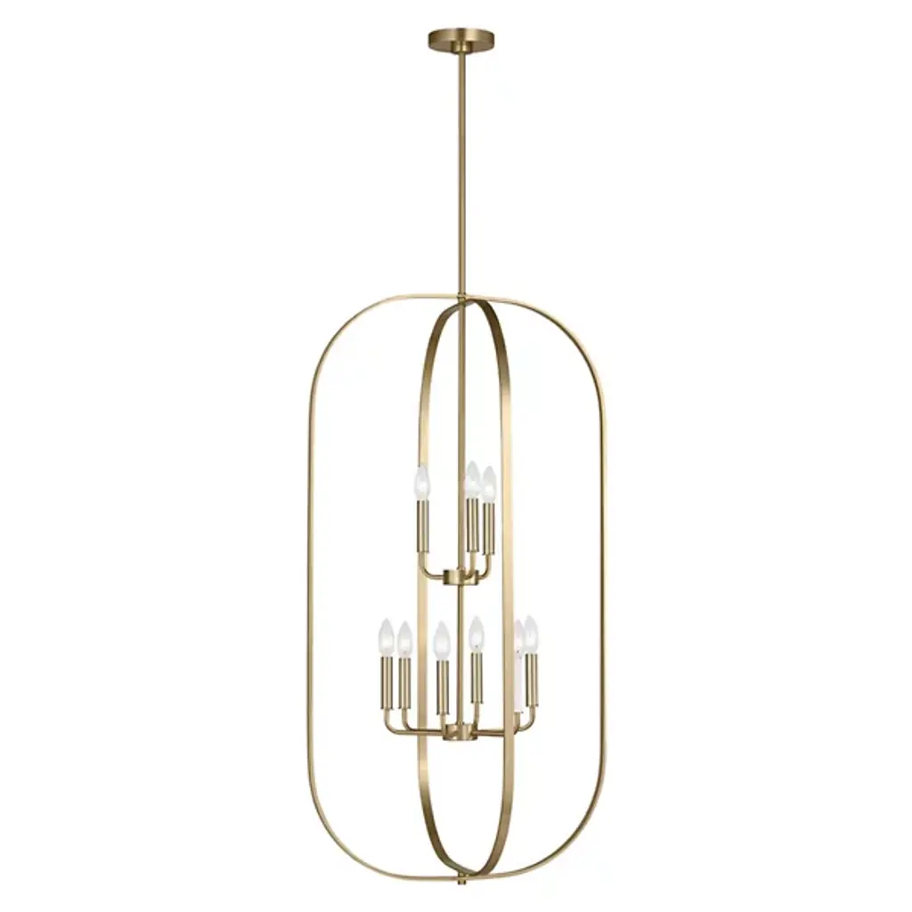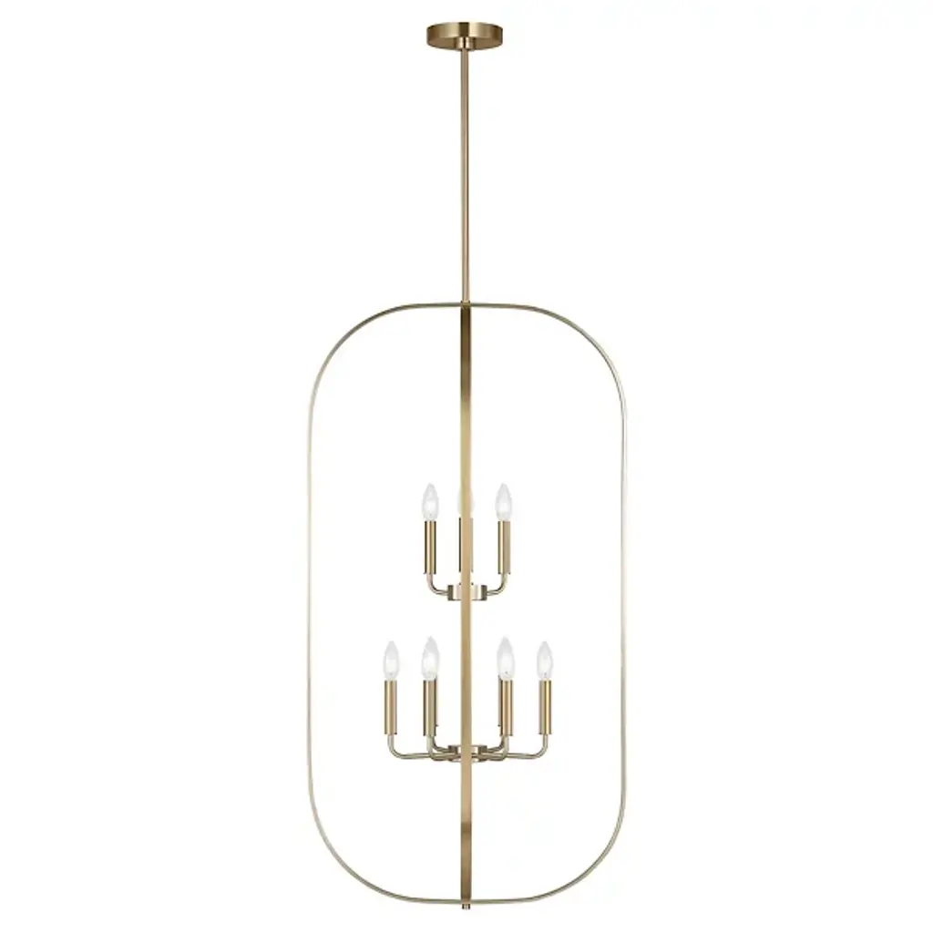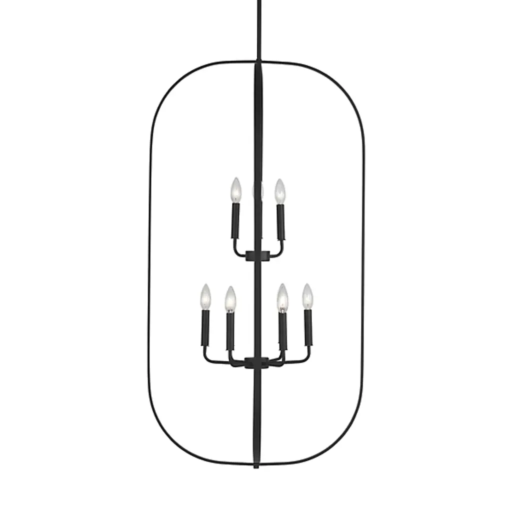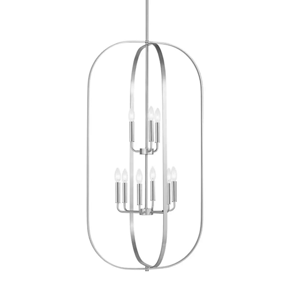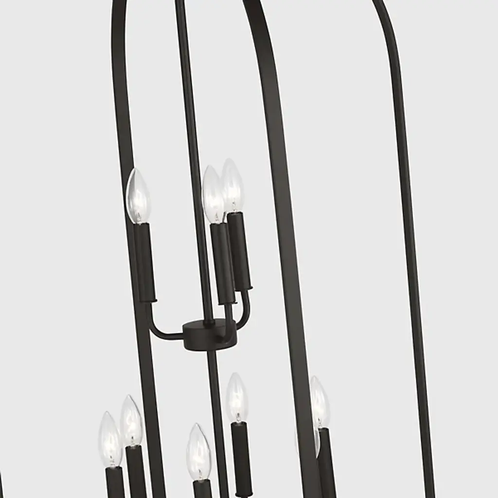 The Loretto Nine Light Pendant from Generation Lighting extends the collection's rounded edge concept into a two-tiered configuration that maximizes both scale and illumination output. The layered arrangement creates vertical depth while maintaining the same contemporary lantern aesthetic through a curved metal framework. This larger pendant brings substantial presence to open foyers and dining spaces through its generous proportions and multiple light sources. The exposed candelabra sockets work well with clear bulbs to enhance the fixture's geometric character, and brightness can be controlled through compatible dimming systems.