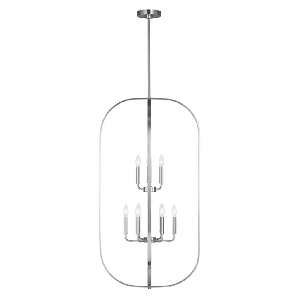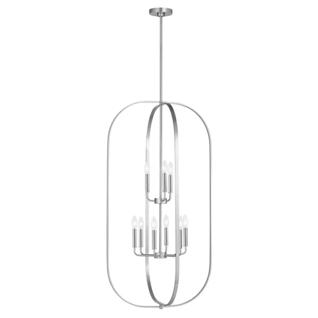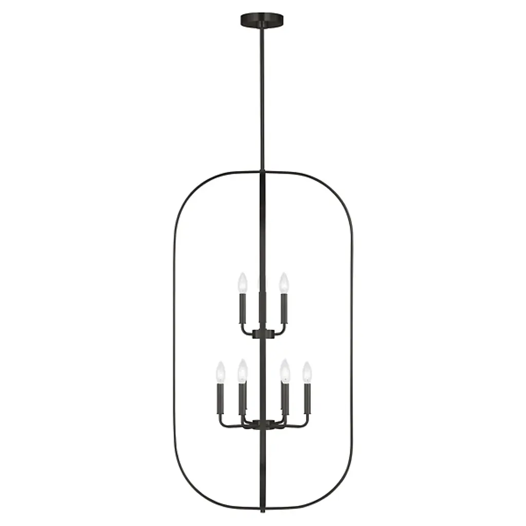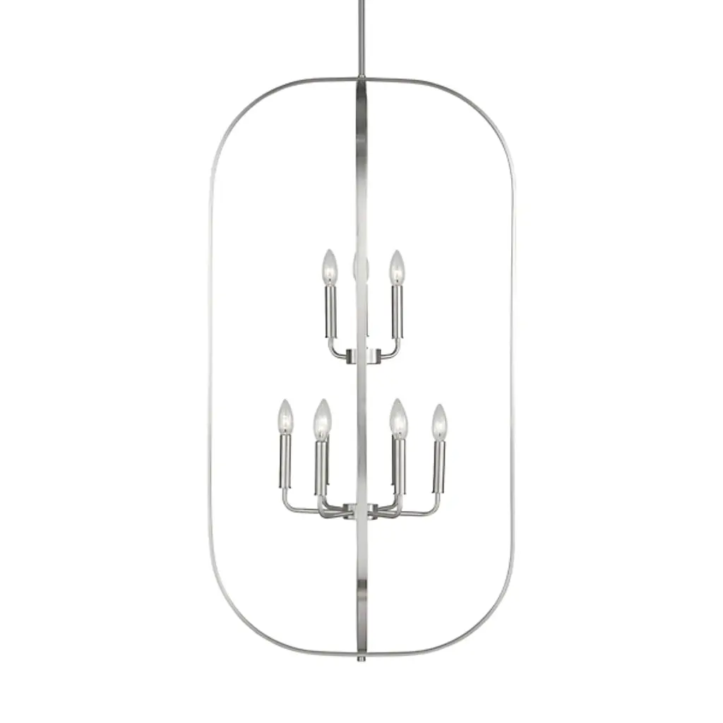 The Loretto Nine Light Pendant from Generation Lighting extends the collection's rounded edge concept into a two-tiered configuration that maximizes both scale and illumination output. The layered arrangement creates vertical depth while maintaining the same contemporary lantern aesthetic through a curved metal framework. This larger pendant brings substantial presence to open foyers and dining spaces through its generous proportions and multiple light sources. The exposed candelabra sockets work well with clear bulbs to enhance the fixture's geometric character, and brightness can be controlled through compatible dimming systems.