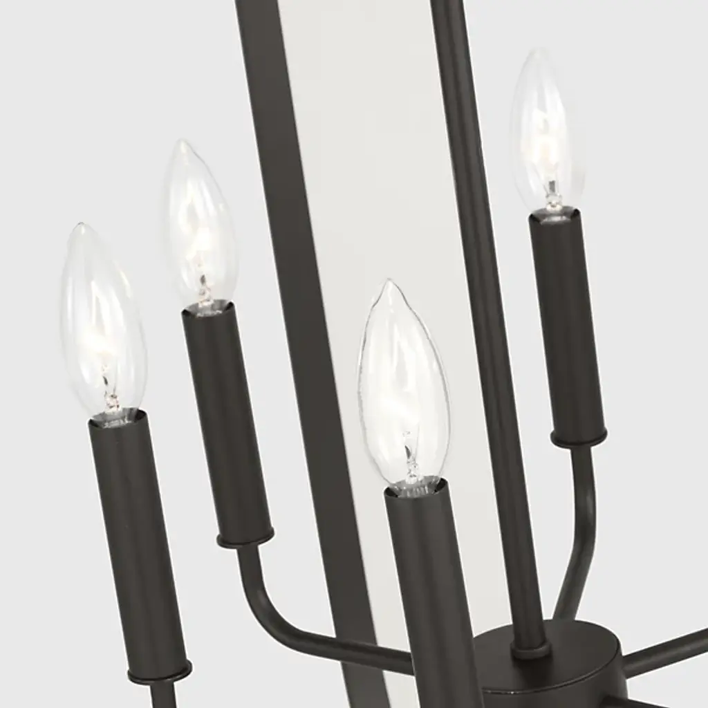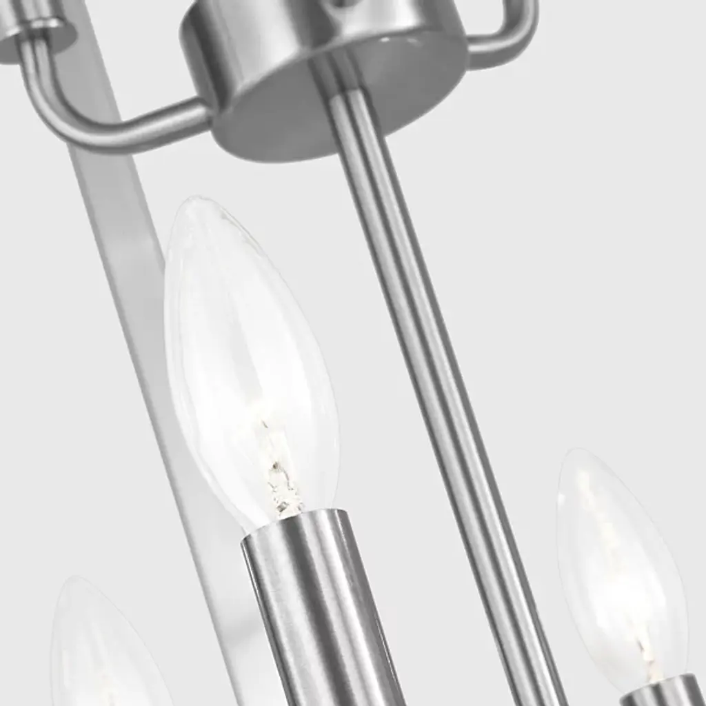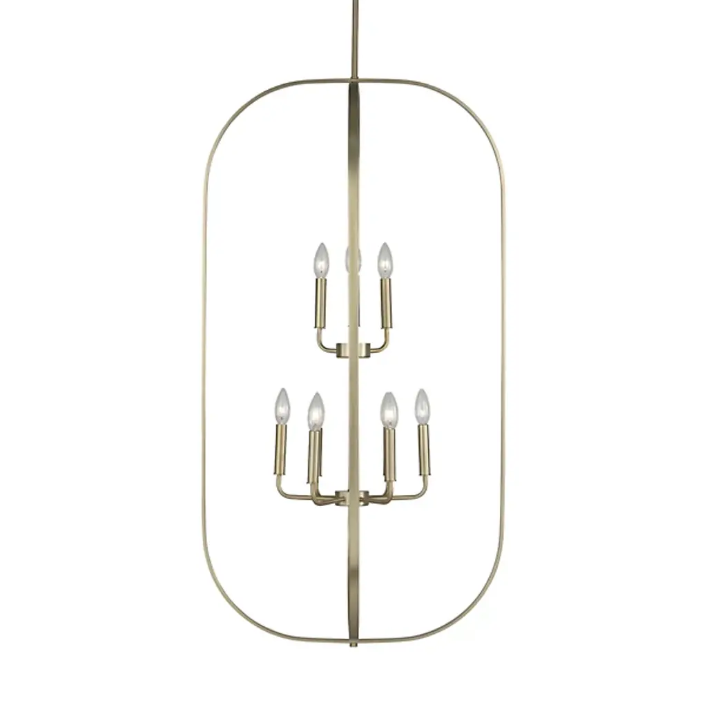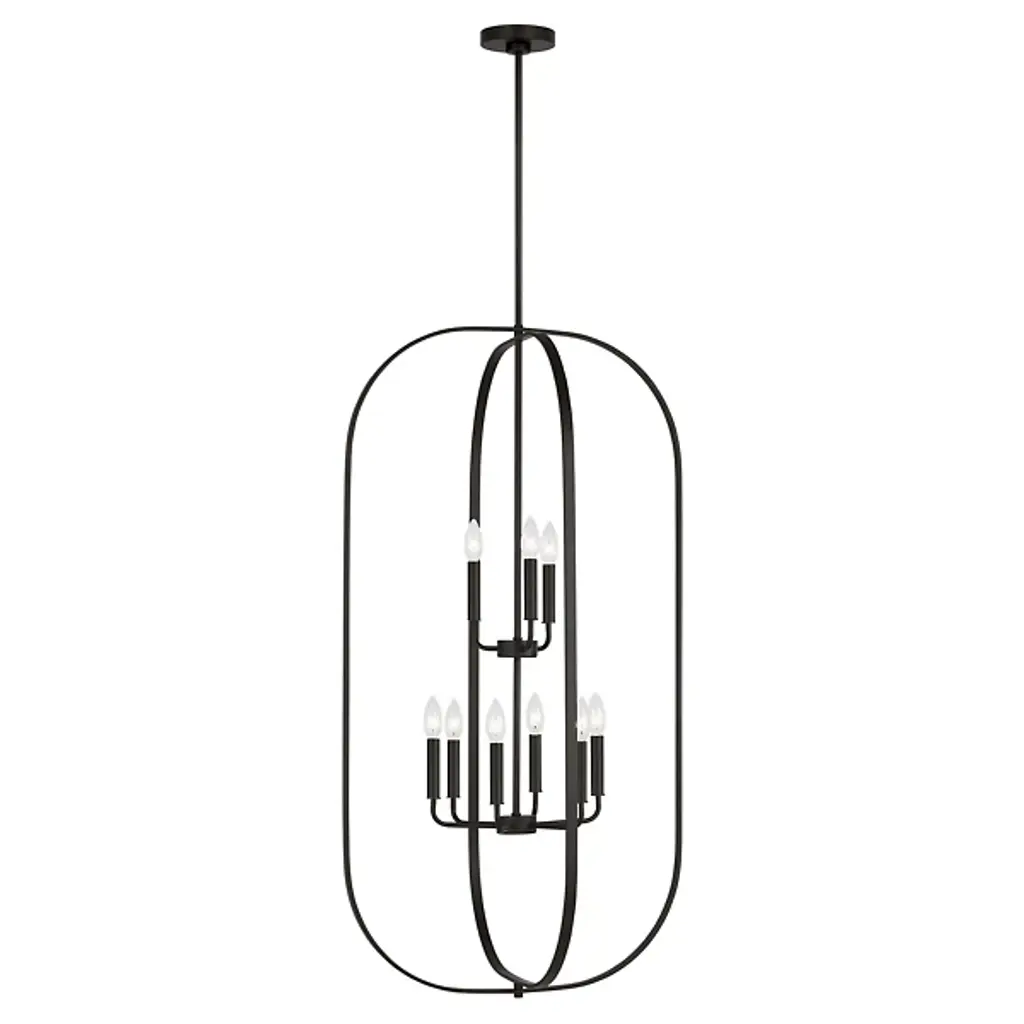 The Loretto Nine Light Pendant from Generation Lighting extends the collection's rounded edge concept into a two-tiered configuration that maximizes both scale and illumination output. The layered arrangement creates vertical depth while maintaining the same contemporary lantern aesthetic through a curved metal framework. This larger pendant brings substantial presence to open foyers and dining spaces through its generous proportions and multiple light sources. The exposed candelabra sockets work well with clear bulbs to enhance the fixture's geometric character, and brightness can be controlled through compatible dimming systems.