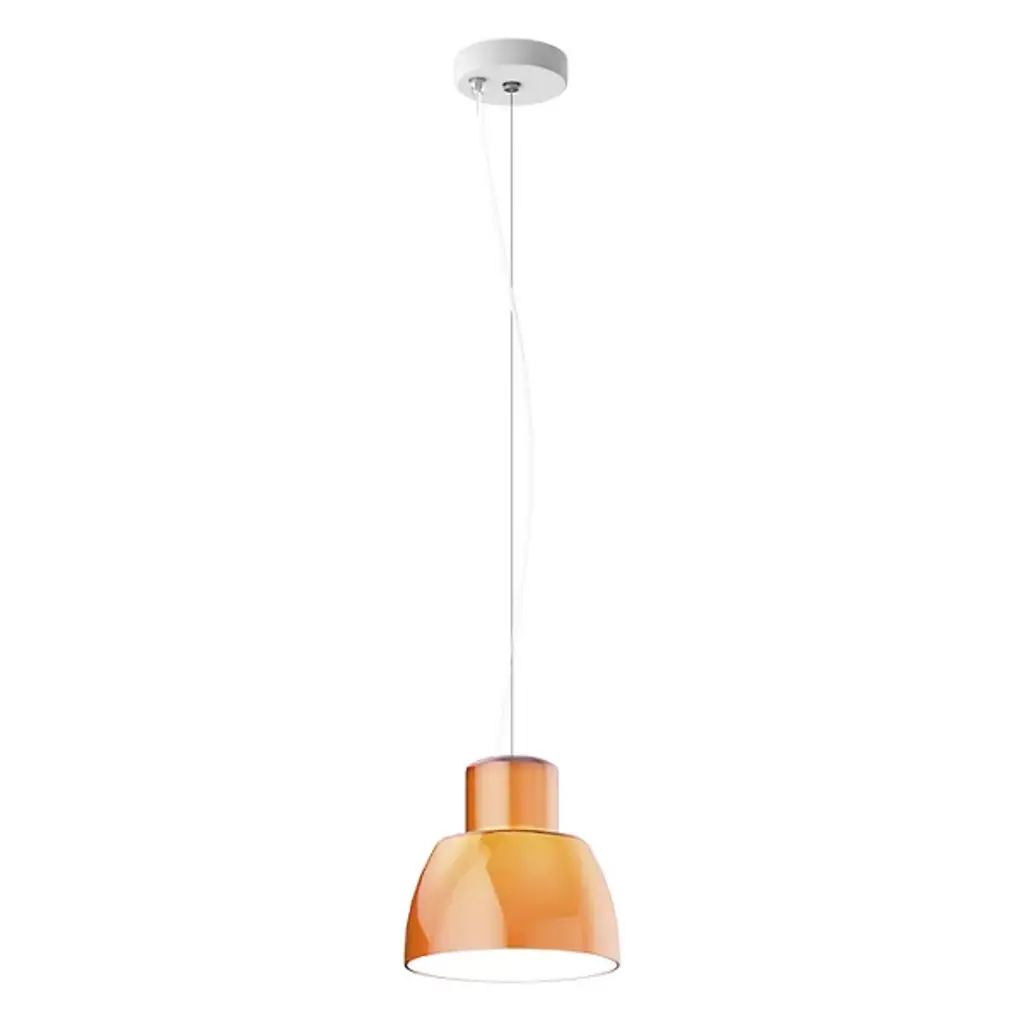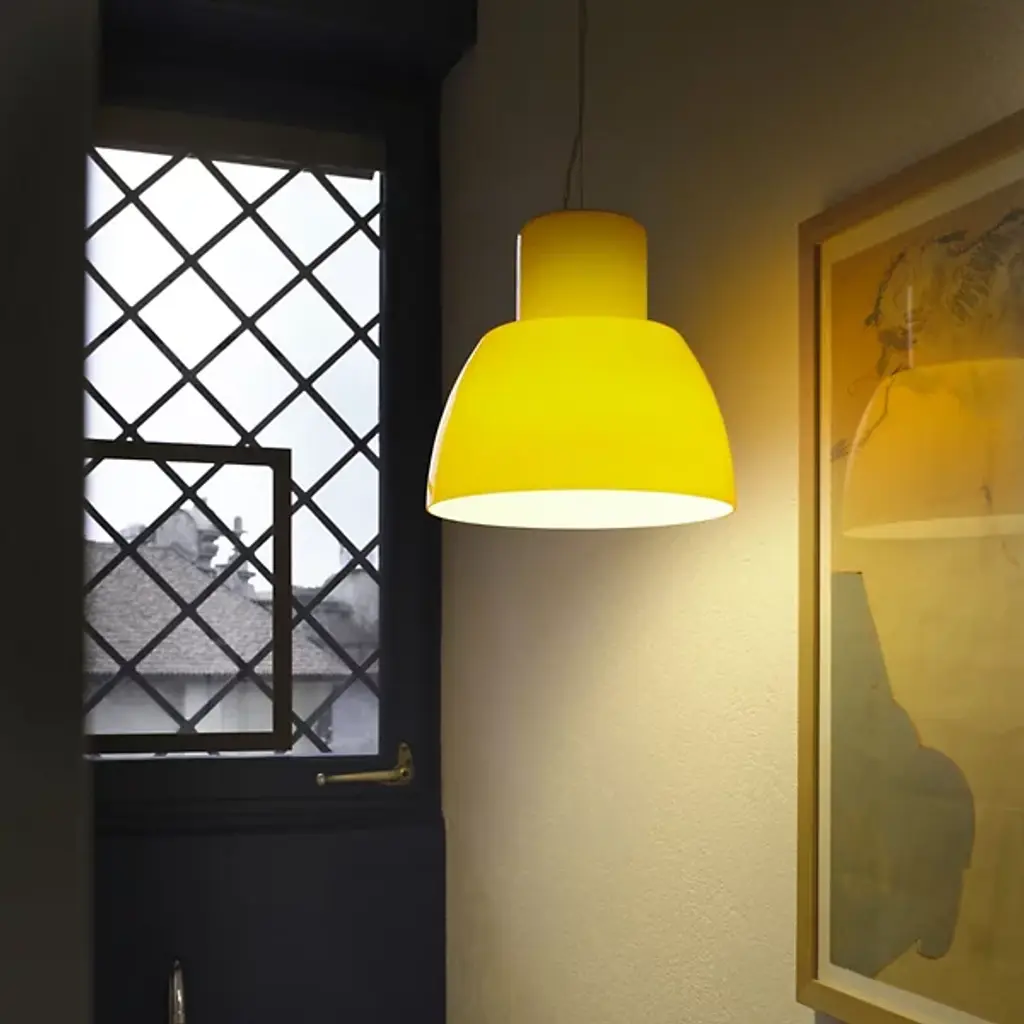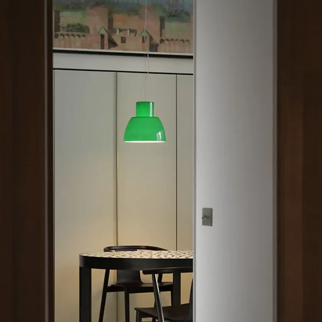 The Lorosae Pendant from Nemo uses a simple structure and flared, colored glass shade to keep the layered light it casts the center of attention. Designed by Álvaro Siza for his exhibition at the Basilica Palladiana in Vicenza in 1999, the pendant took home the coveted IF Design Award in 2003, and uses an aluminum canopy and slim cable to support a translucent glass shade around central lamping, showing off a retro shape with modern construction. The shade’s open base casts a bright wash of light below, while the shifting surface of the translucent glass glows with an inner light.