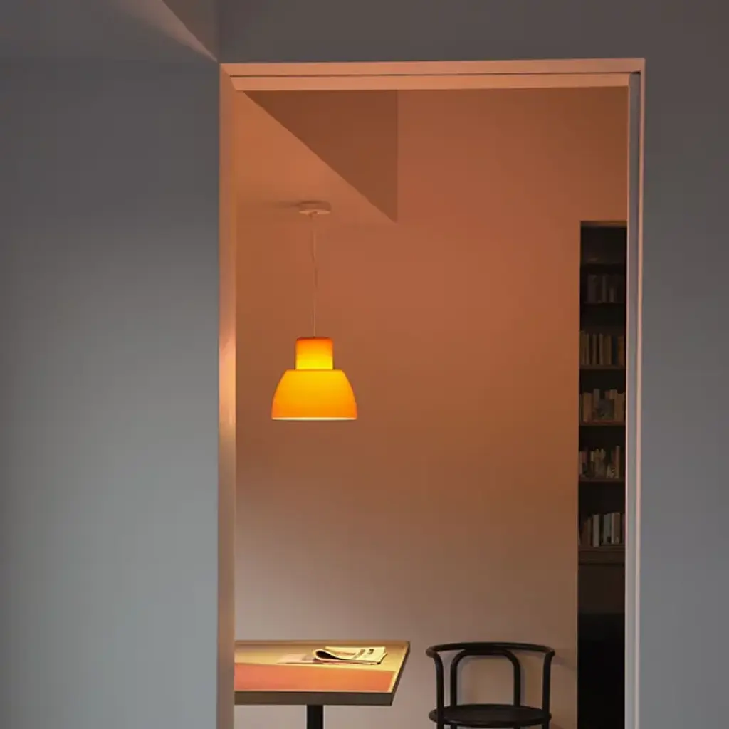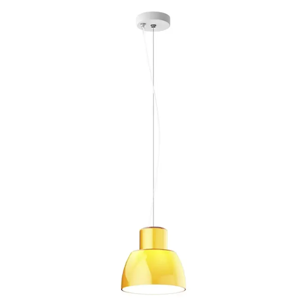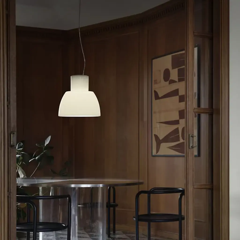 The Lorosae Pendant from Nemo uses a simple structure and flared, colored glass shade to keep the layered light it casts the center of attention. Designed by Álvaro Siza for his exhibition at the Basilica Palladiana in Vicenza in 1999, the pendant took home the coveted IF Design Award in 2003, and uses an aluminum canopy and slim cable to support a translucent glass shade around central lamping, showing off a retro shape with modern construction. The shade’s open base casts a bright wash of light below, while the shifting surface of the translucent glass glows with an inner light.