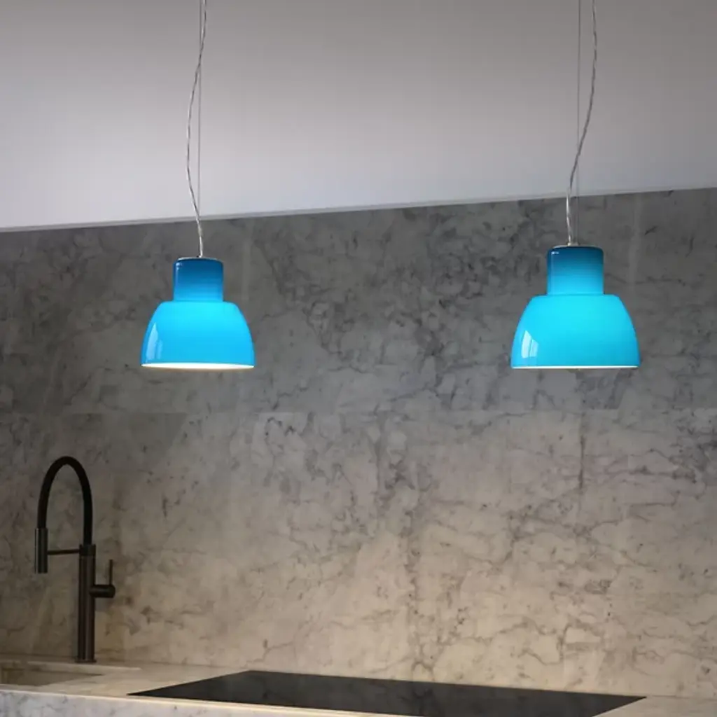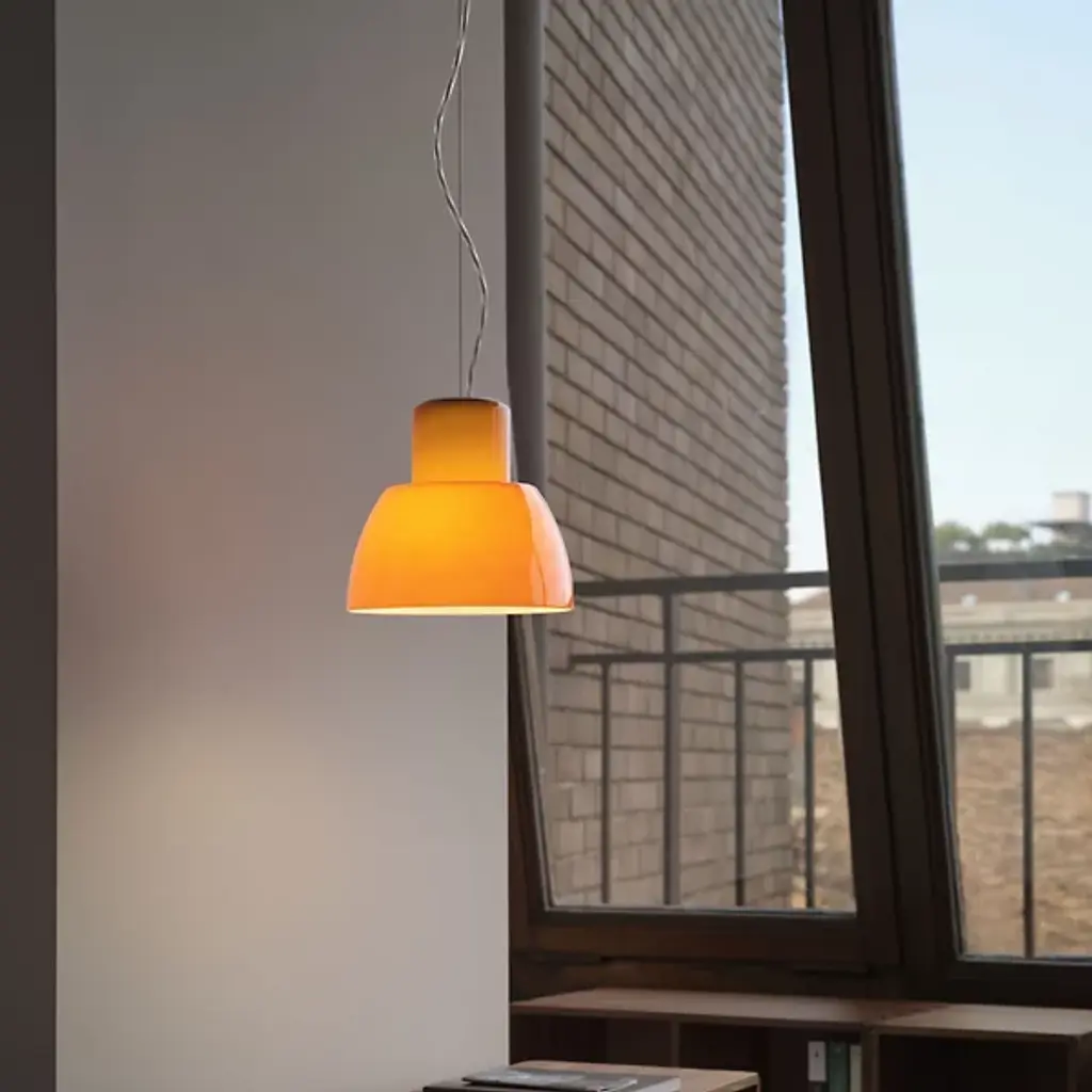 The Lorosae Pendant from Nemo uses a simple structure and flared, colored glass shade to keep the layered light it casts the center of attention. Designed by Álvaro Siza for his exhibition at the Basilica Palladiana in Vicenza in 1999, the pendant took home the coveted IF Design Award in 2003, and uses an aluminum canopy and slim cable to support a translucent glass shade around central lamping, showing off a retro shape with modern construction. The shade’s open base casts a bright wash of light below, while the shifting surface of the translucent glass glows with an inner light.