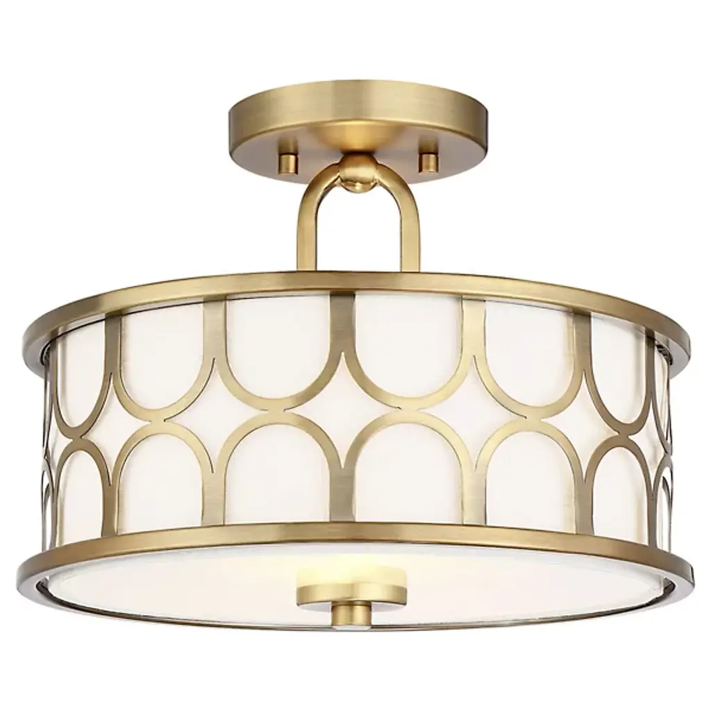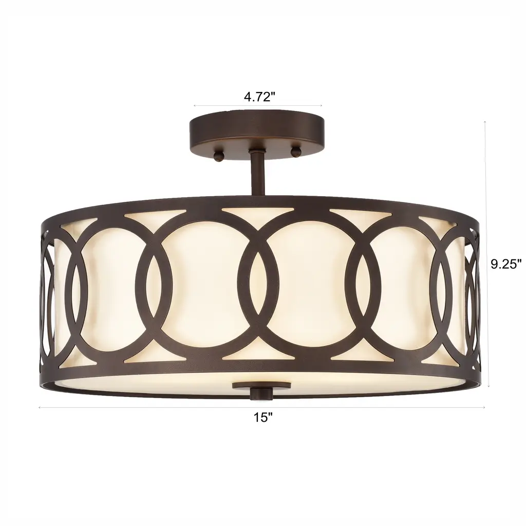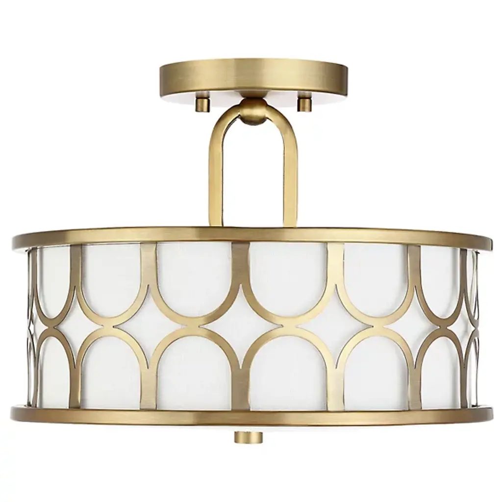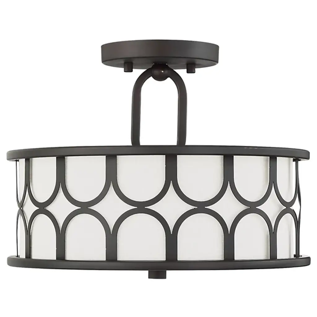 Classic comfort. Informed by tradition yet mindful of future trends, the Lou Semi-Flushmount by Alder & Ore is packed with versatility. This unassuming fixture follows the basic rules of drum shade design, spicing things up with curvilinear geometric metalwork around the entire edge. Its simple ceiling plate mirrors the cylindrical shape for a unified, up-to-date aesthetic.