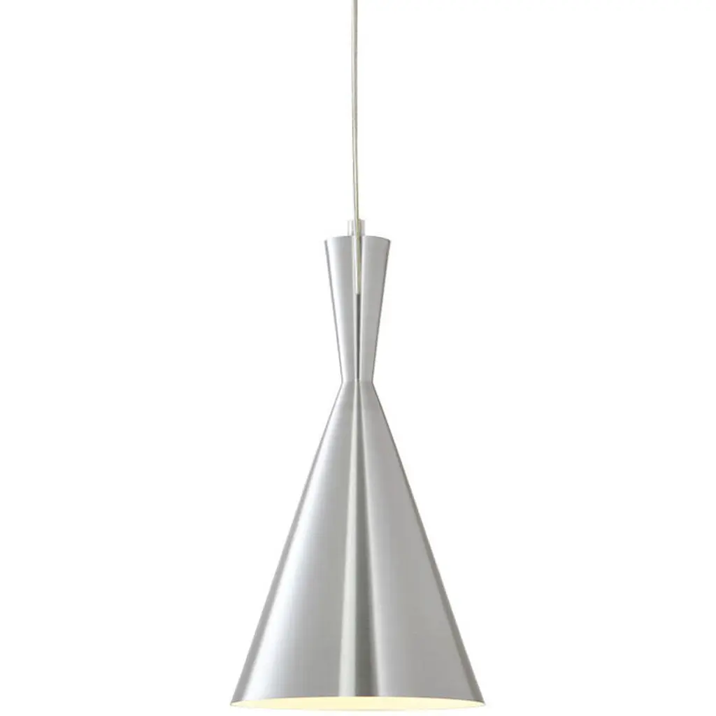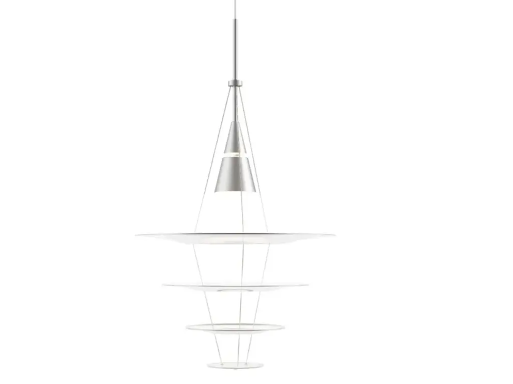 The fixture emits glare-free, soft, comfortable downward light. The shade design ensures even illumination of the surface. The matt upper surface diffuses the light, while the shiny lower surface ensures optimal reflection.FinishBrushed aluminium, clear coated. MaterialsCone and pendant tube: Lacquered or wet painted brushed aluminium. Wire: Stainless steel. Shades: White Acrylic.ClassIngress protection IP20. Electric shock protection II w/o ground.MountingSuspension type: Cable 2x0,75mm². Canopy: Yes. Cable length: 3m.Light source & energy classEnergy class A+ - DLight source 1x20W GU10