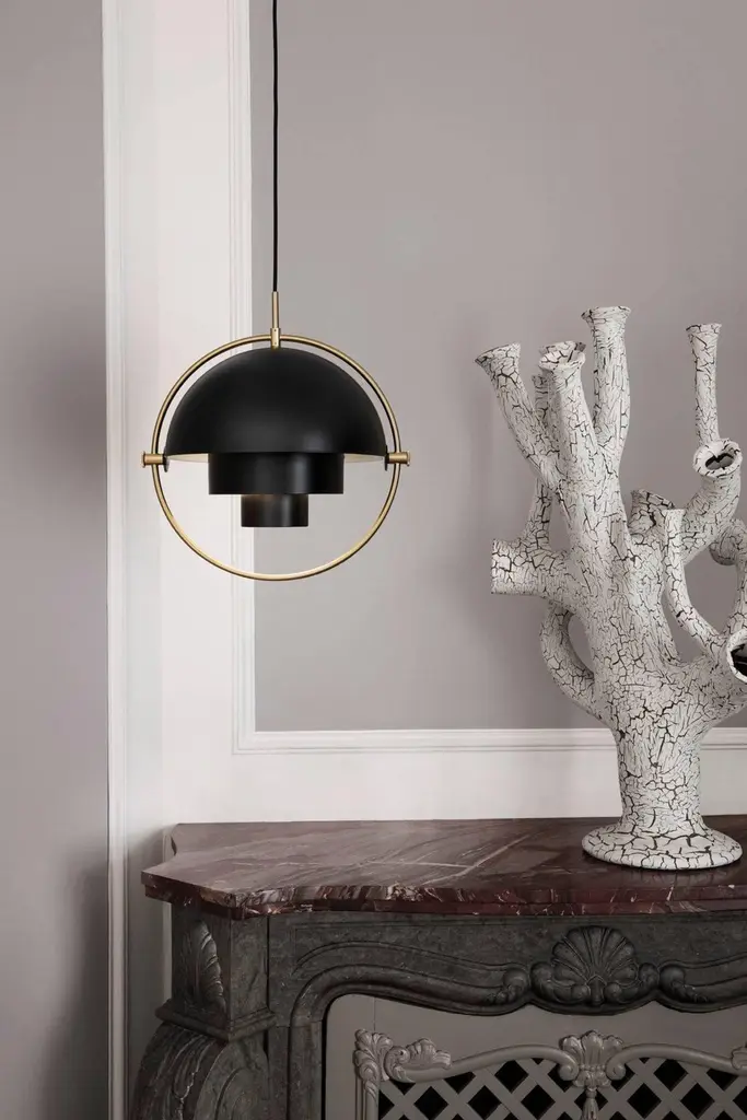 Louis Weisdorf 'Multi-Lite' Pendant Lamp in Brass for GUBIDesigned in 1972 by Weisdorf, this is an authorized re-edition by GUBI of Denmark who meticulously reproduces his work with scrupulous attention to detail and materials that are faithful to the original specifications. This highly sculptural and geometrical pendant lamp is comprised of two mobile shades that can be rotated independently to change the direction of the light as well as the look of the lamp. Executed in metal with painted shades Price is per item. Available in chrome, white / chrome, black / chrome, black / brass, all brass, blue / brass, sea grey / brass, and rose dust / brass. This listing is for the all brass variant. In-stock lead time 4-5 weeks. Out of stock up to 10 weeks or more. Inventory availability subject to change.CUL, UL Listed. Accommodates a single 60 watt medium base incandescent bulb (higher with LED). Ships with 157.5 inches of fabric-covered cord.Made to order. All sales are final.