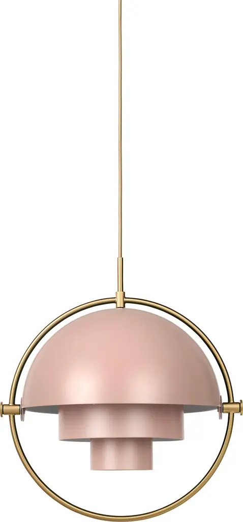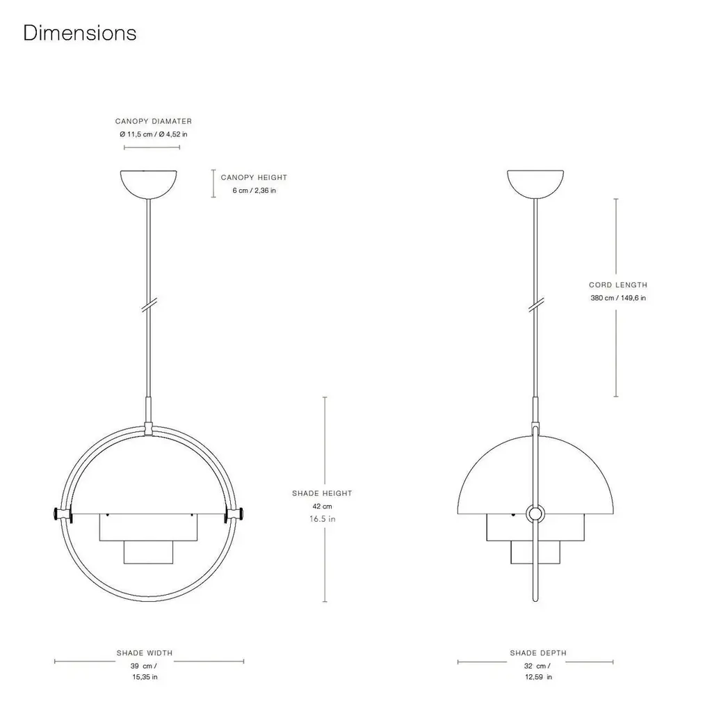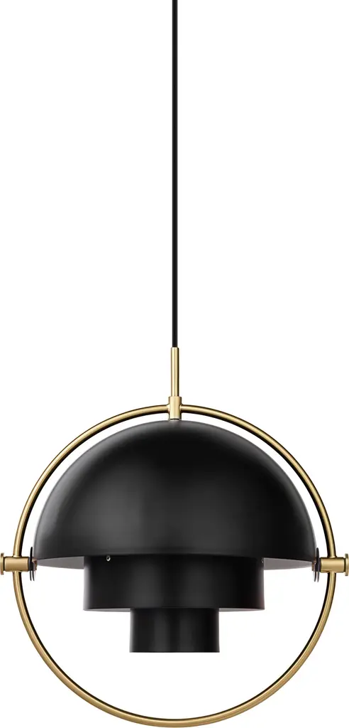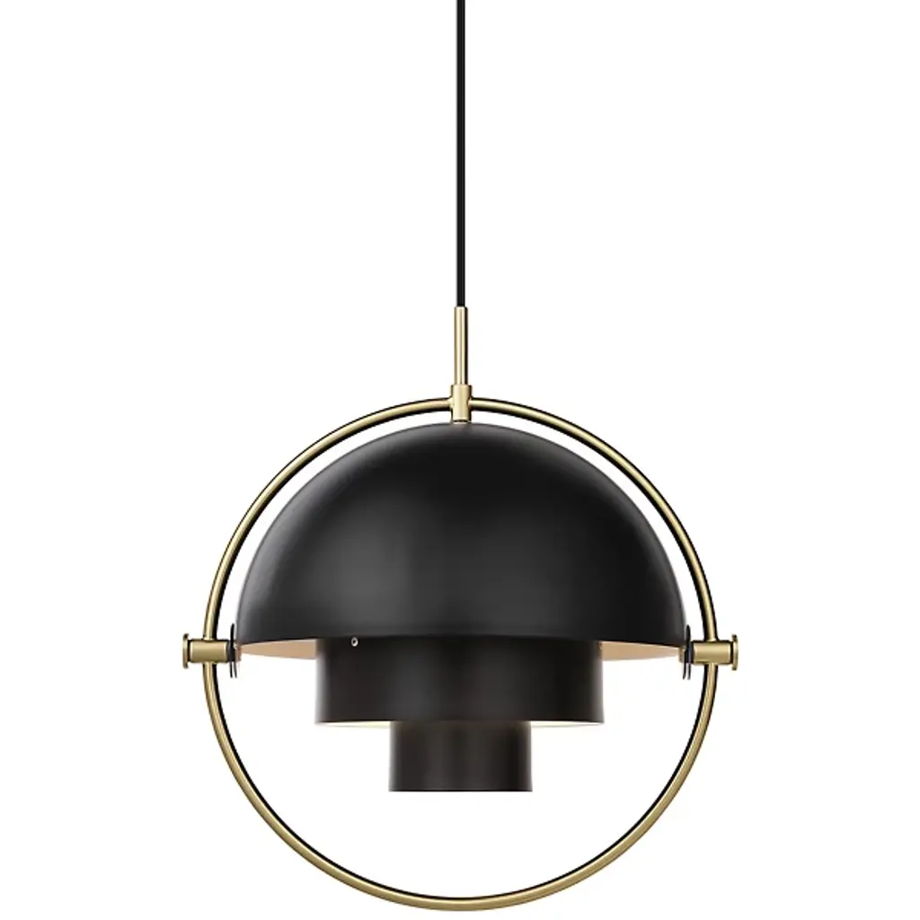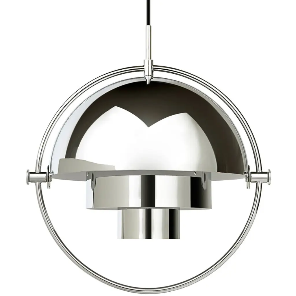 Louis Weisdorf 'Multi-Lite' Pendant Lamp in White and Chrome for GUBI Designed in 1972 by Weisdorf, this is an authorized re-edition by GUBI of Denmark who meticulously reproduces his work with scrupulous attention to detail and materials that are faithful to the original specifications. This highly sculptural and geometrical pendant lamp is comprised of two mobile shades that can be rotated independently to change the direction of the light as well as the look of the lamp. Executed in metal with painted shades Price is per item. Available in chrome, white or chrome, black or chrome, black or brass, all brass, blue or brass, sea gray or brass, and rose dust or brass. This listing is for the white and chrome variant.In-stock lead time 4-5 weeks. Out of stock up to 10 weeks or more. Inventory availability subject to change.CUL, UL listed. Accommodates a single 60 watt medium base incandescent bulb (higher with LED). Ships with 157.5 inches of fabric-covered cord.Made to order. All sales are final.