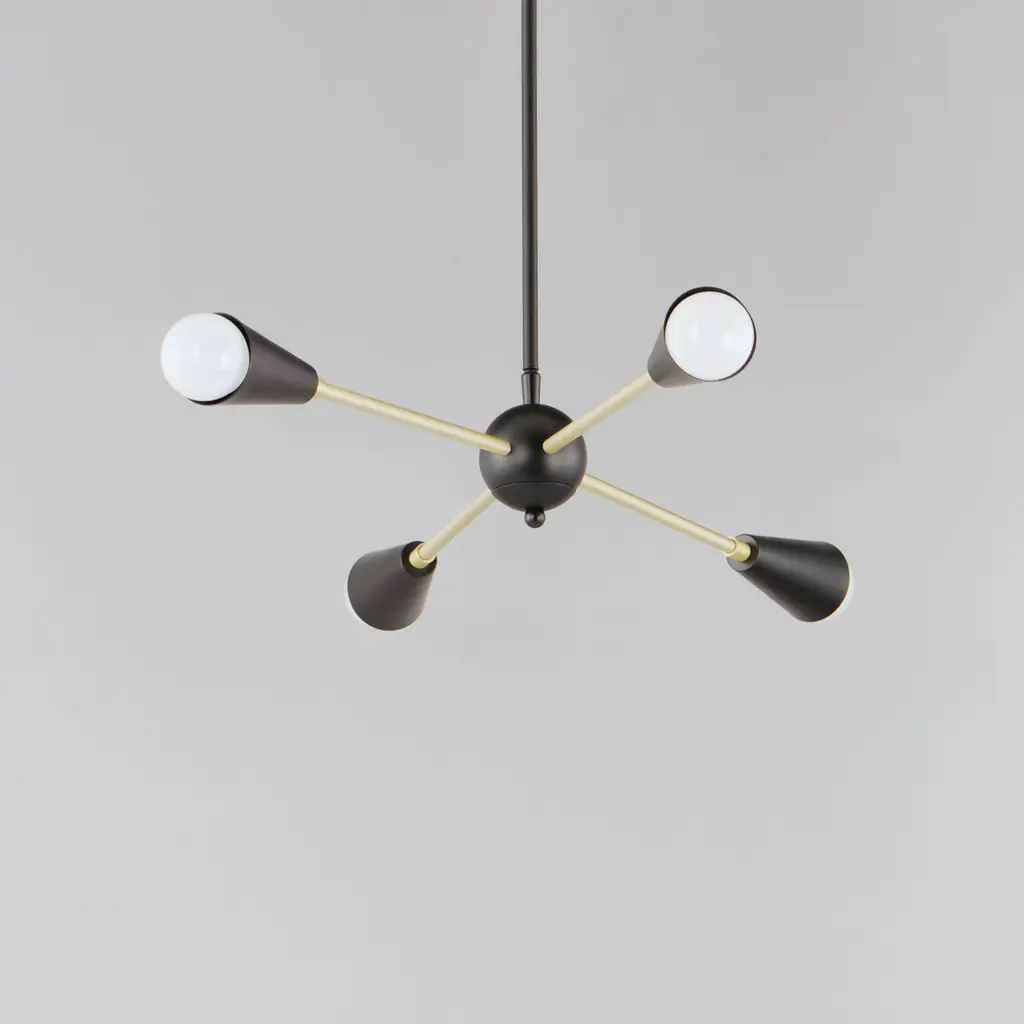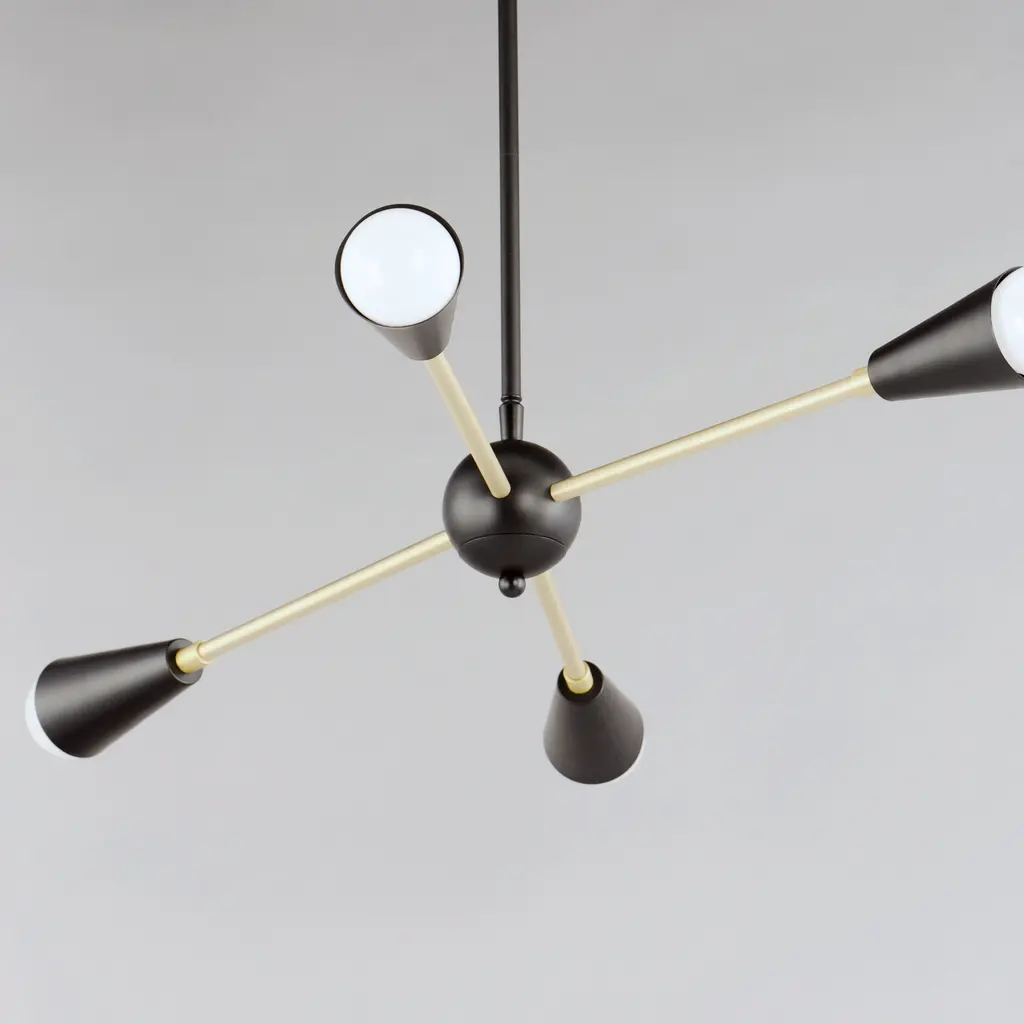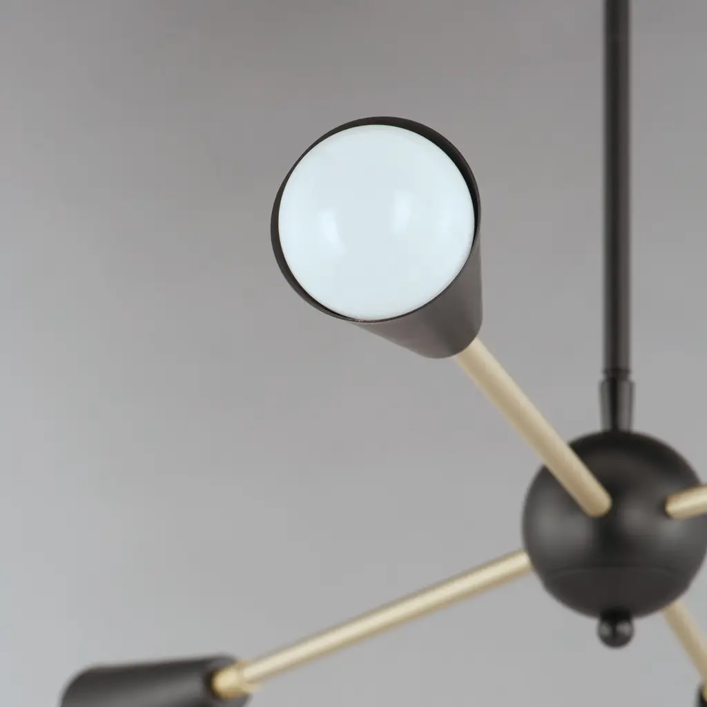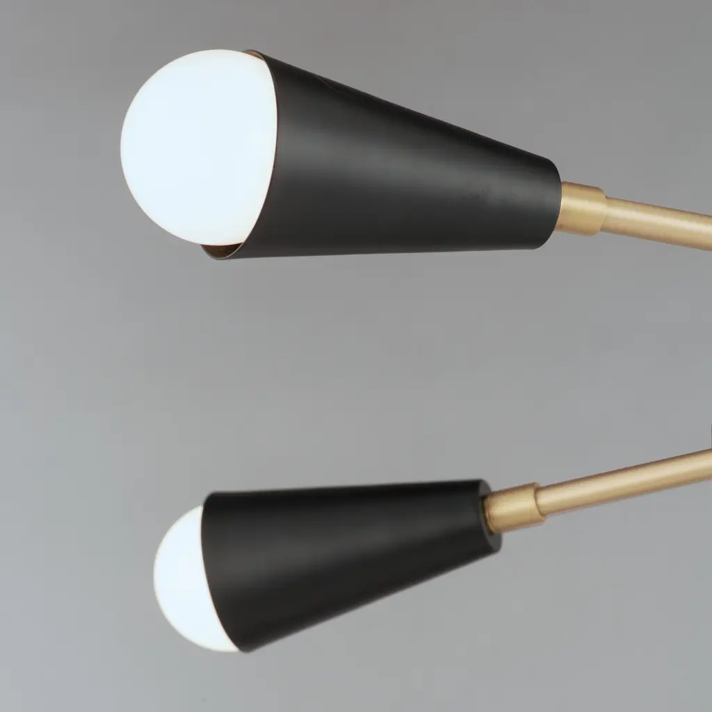 A classic mid-century look, the Lovell collection features two sizes of sputnik chandeliers and streamlined sconces perfect for bath vanity applications. Available in a Black/Satin Brass finish combination. Light bulbs nest inside the metal cones to become an element of the design.
